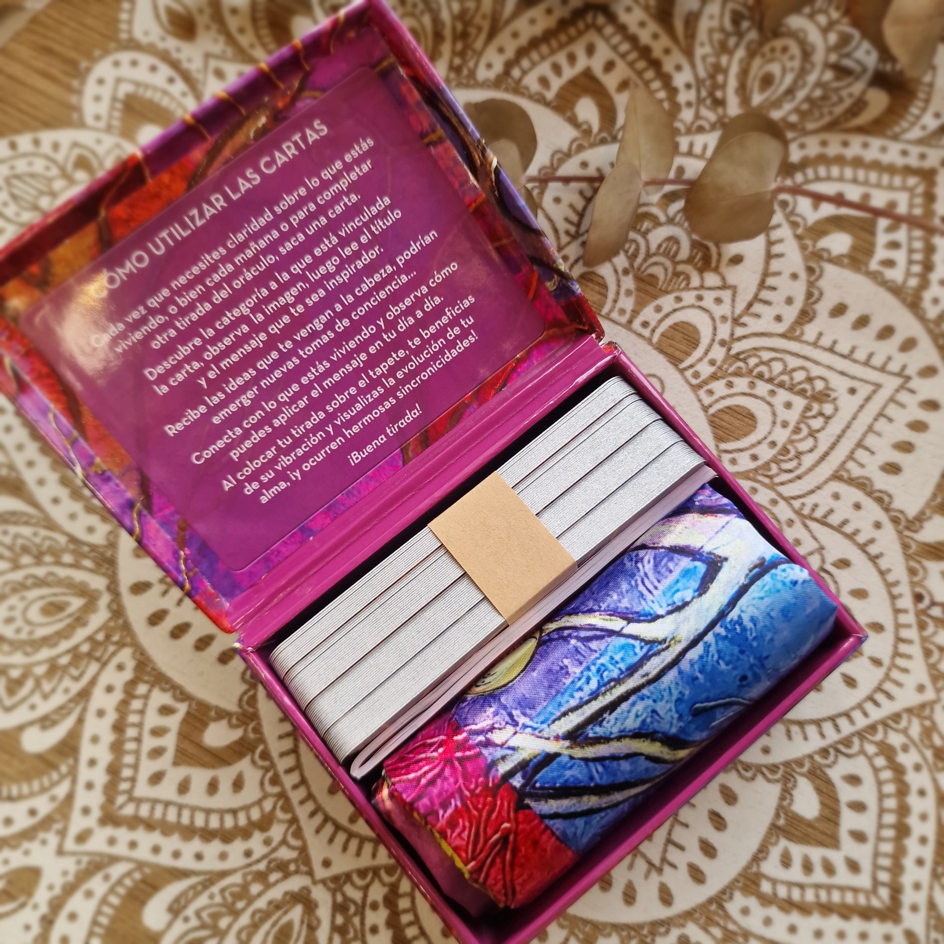 Este oráculo incluye 60 cartas inspiradoras, acompañadas de un tapete decorativo que sirve como espacio sagrado para tus tiradas y visualizaciones.