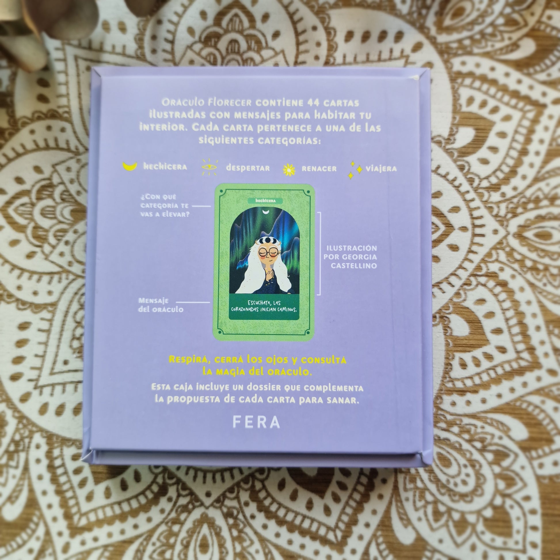 Este oráculo incluye 44 cartas ilustradas con frases para florecer, distribuidas en cuatro ejes: Viajera, Hechicera, Despertar y Renacer. También trae un librito guía que te acompaña para interpretar cada mensaje e integrarlo a tu camino con intención.