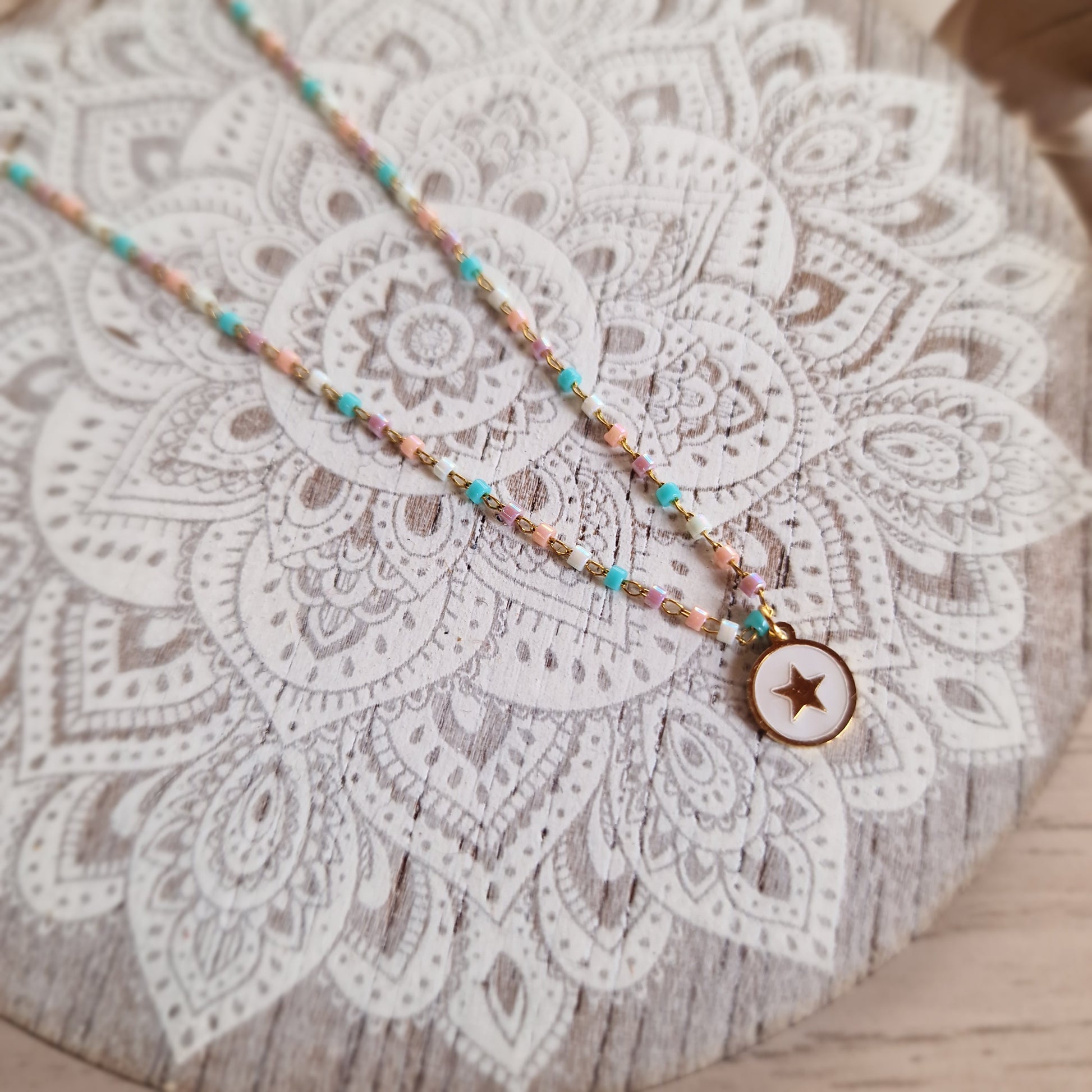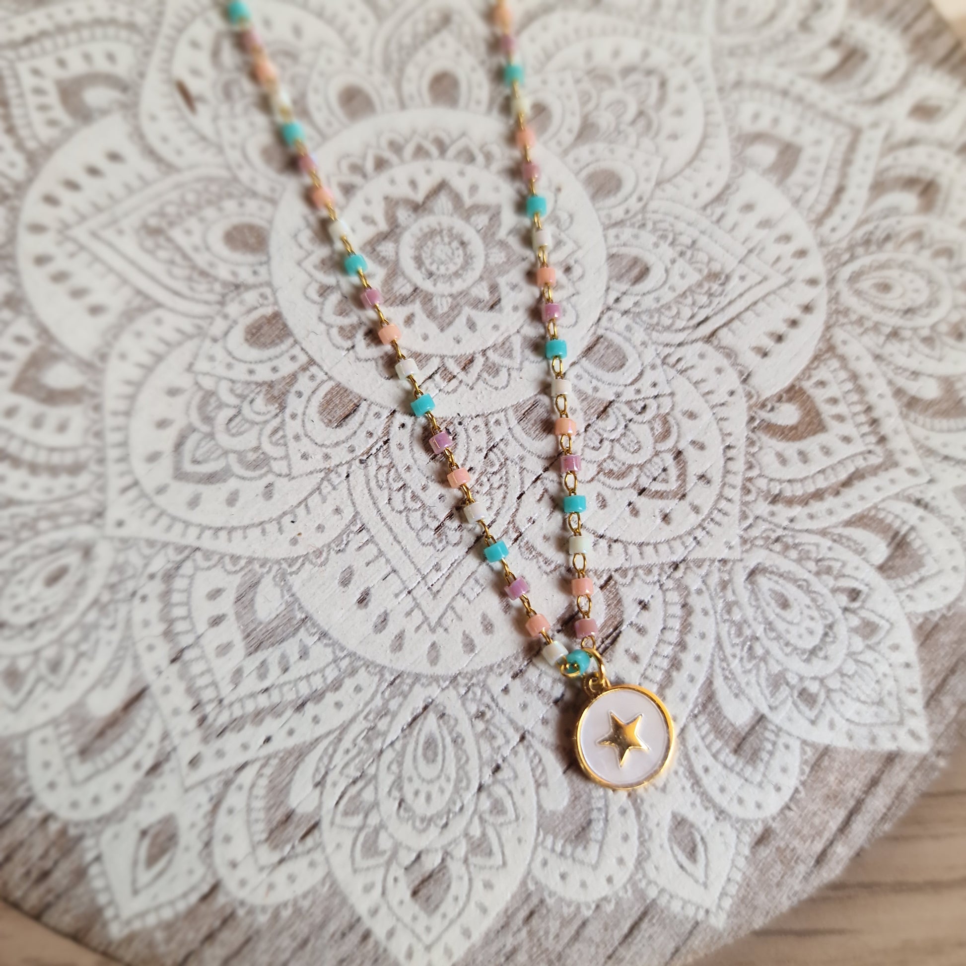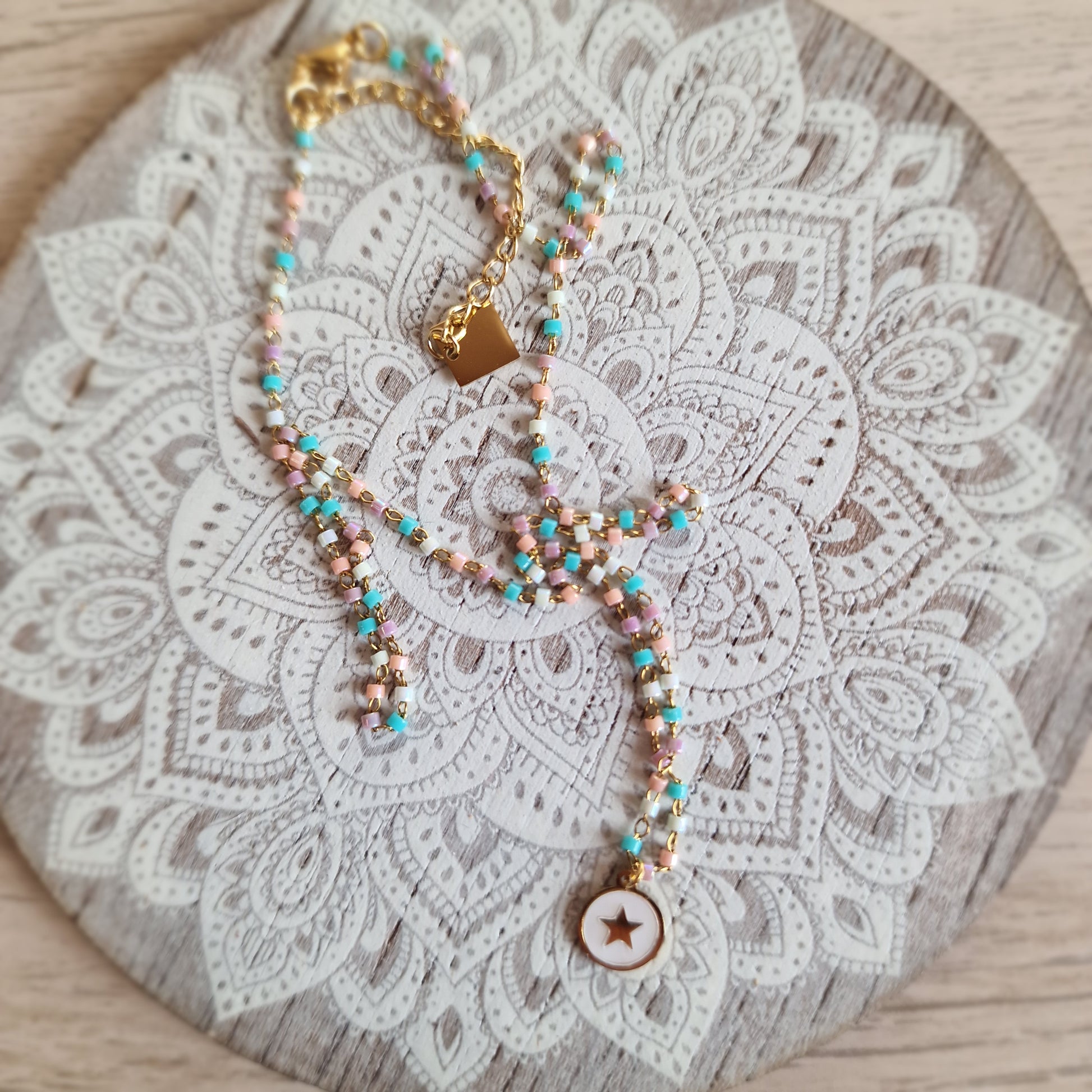 Esta encantadora gargantilla de acero dorado destaca por su diseño lleno de detalles y color. La cadena incluye pequeños toques multicolor que aportan un aire alegre y moderno, mientras que en el centro cuelga una placa de acero con nácar y una delicada estrella grabada de 0,7 cm, símbolo de guía y esperanza.