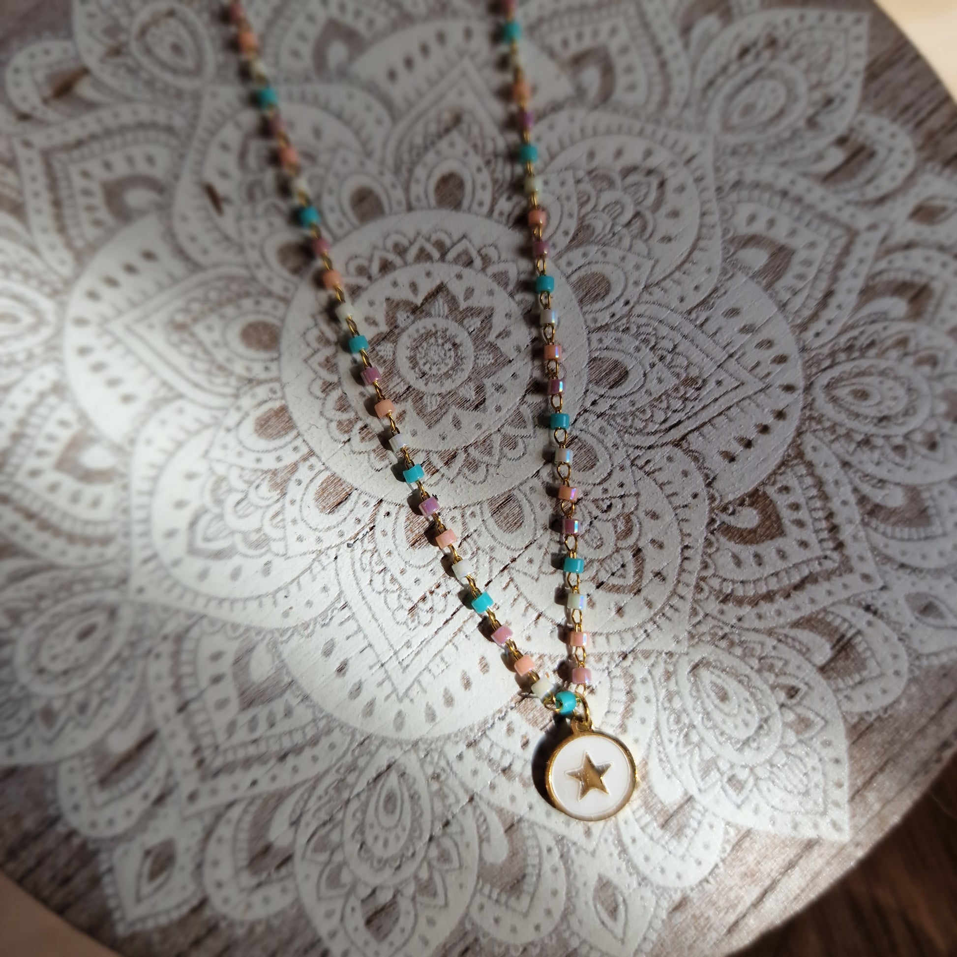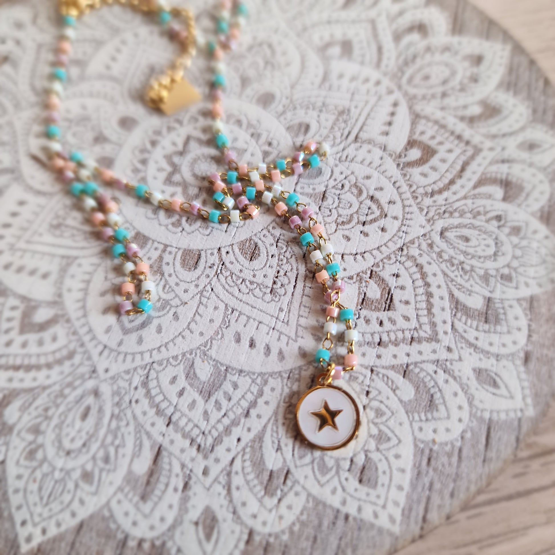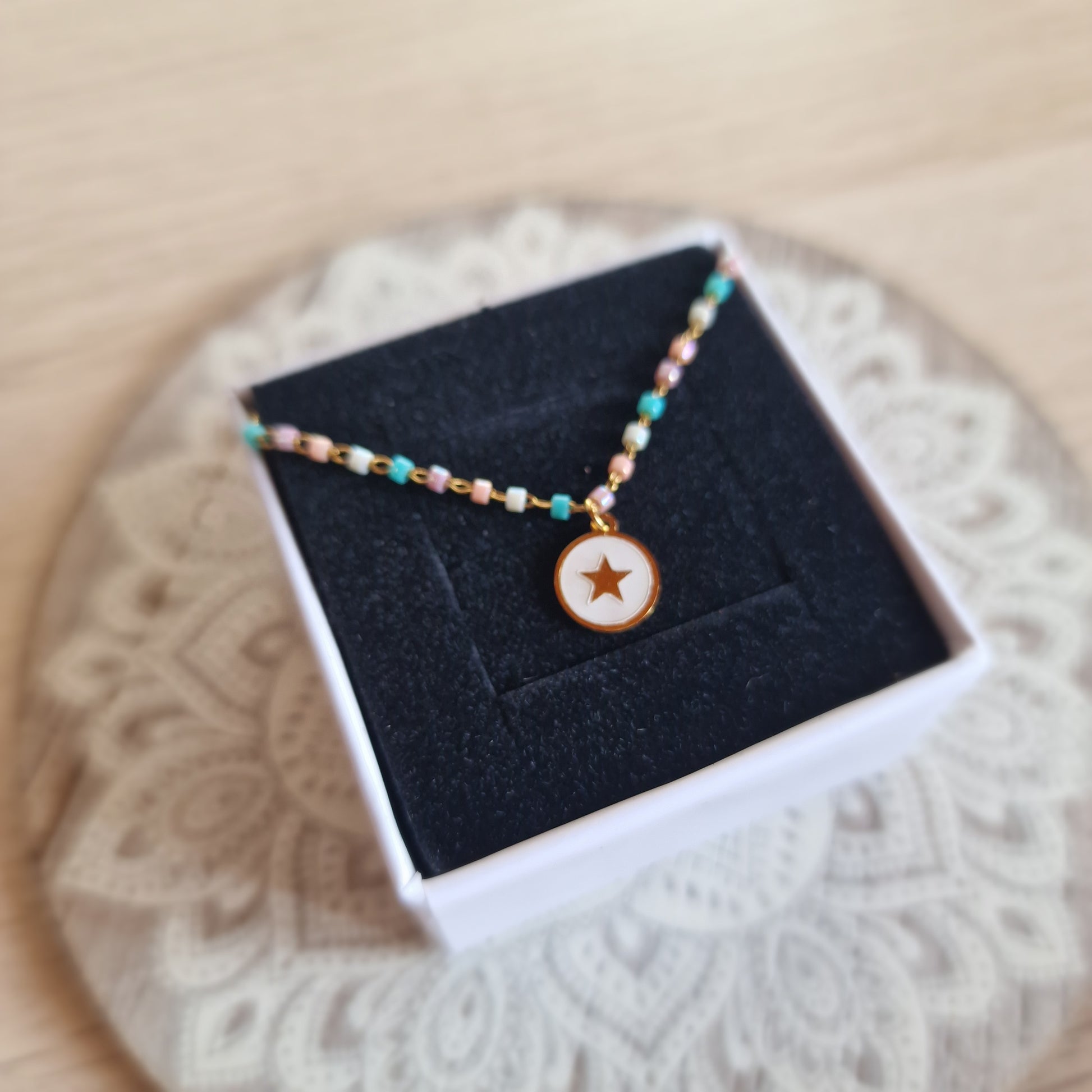 Esta encantadora gargantilla de acero dorado destaca por su diseño lleno de detalles y color. La cadena incluye pequeños toques multicolor que aportan un aire alegre y moderno, mientras que en el centro cuelga una placa de acero con nácar y una delicada estrella grabada de 0,7 cm, símbolo de guía y esperanza.