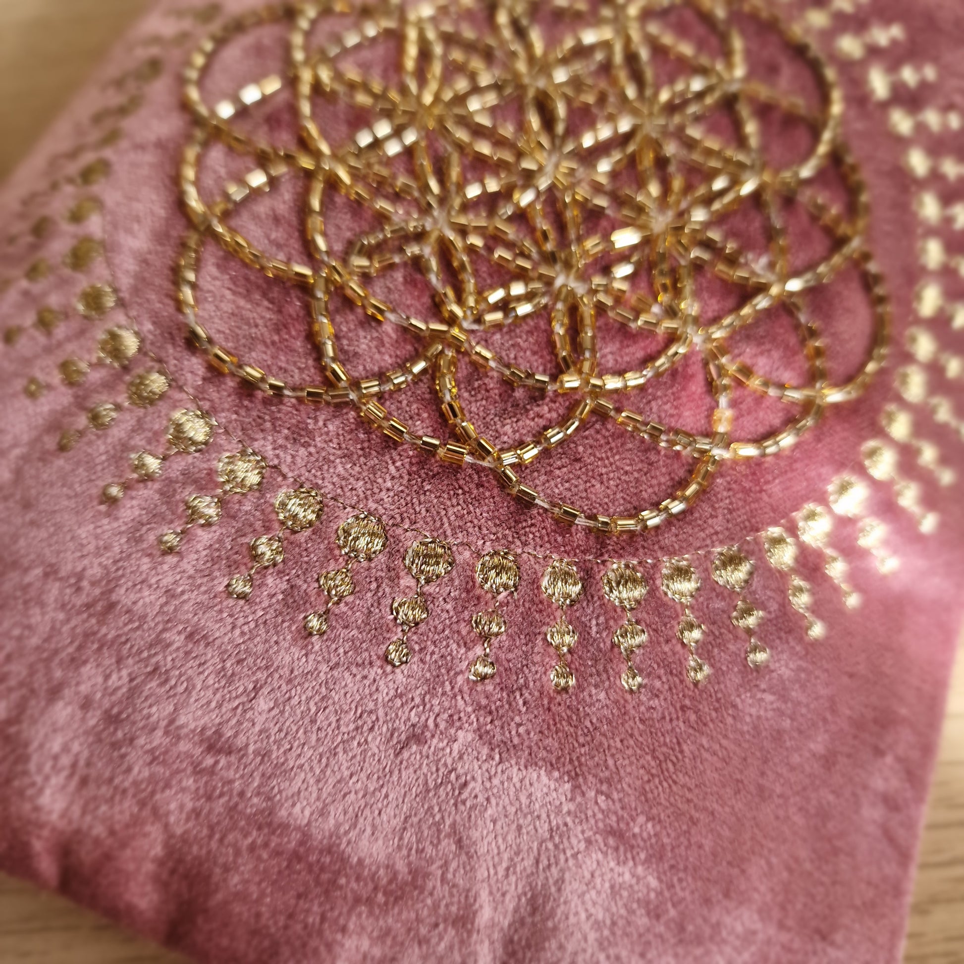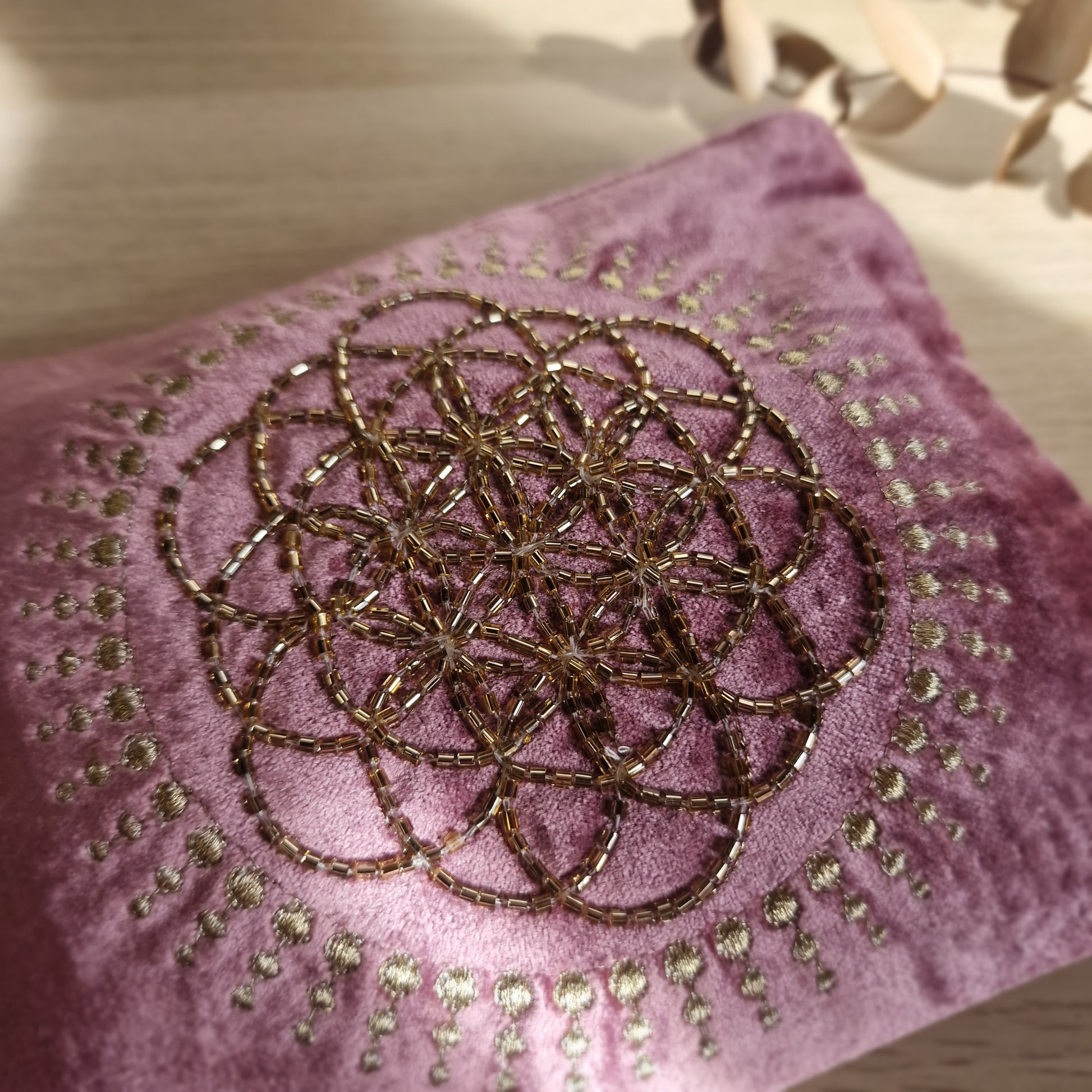 Este precioso neceser de terciopelo destaca por su bordado de la Flor de la Vida, símbolo de conexión, equilibrio y creación universal. Su diseño combina elegancia y espiritualidad, convirtiéndolo en un accesorio ideal para acompañarte en tu día a día.