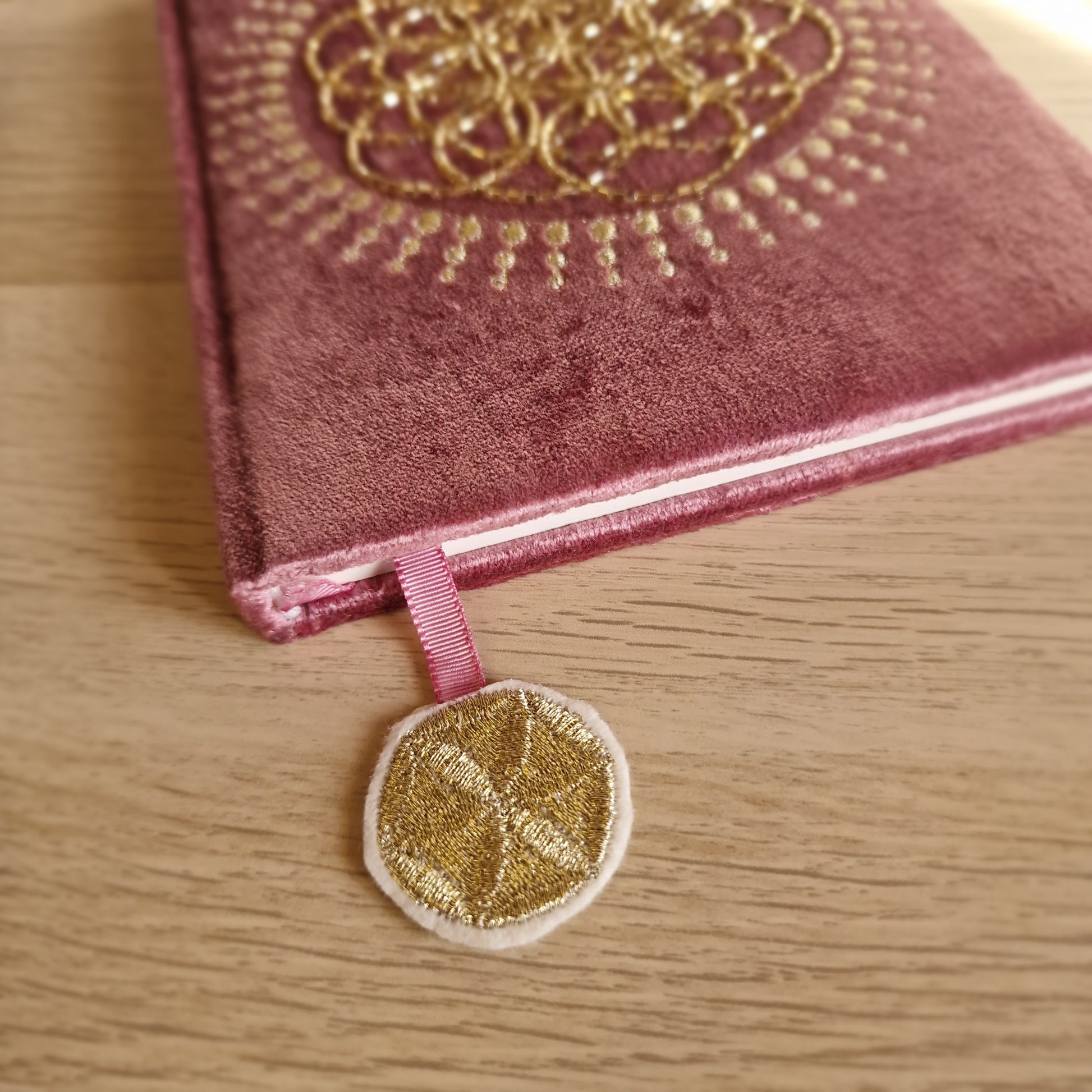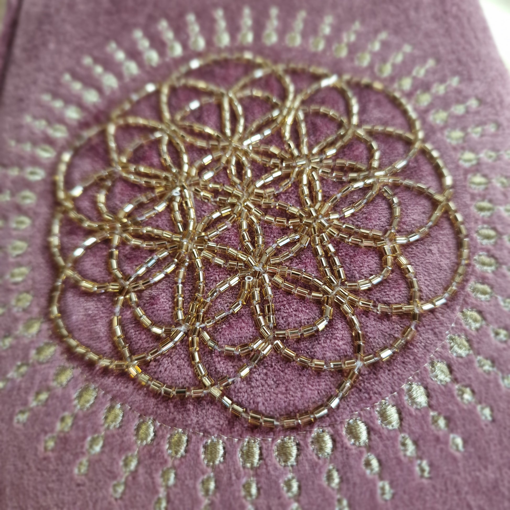 Este elegante cuaderno de terciopelo suave está adornado con un bordado de la Flor de la Vida, símbolo ancestral de la geometría sagrada que representa la unidad, la armonía y la interconexión de toda la existencia. Su textura aterciopelada y las delicadas cuentas decorativas lo convierten en una pieza especial para tus momentos de inspiración y reflexión.