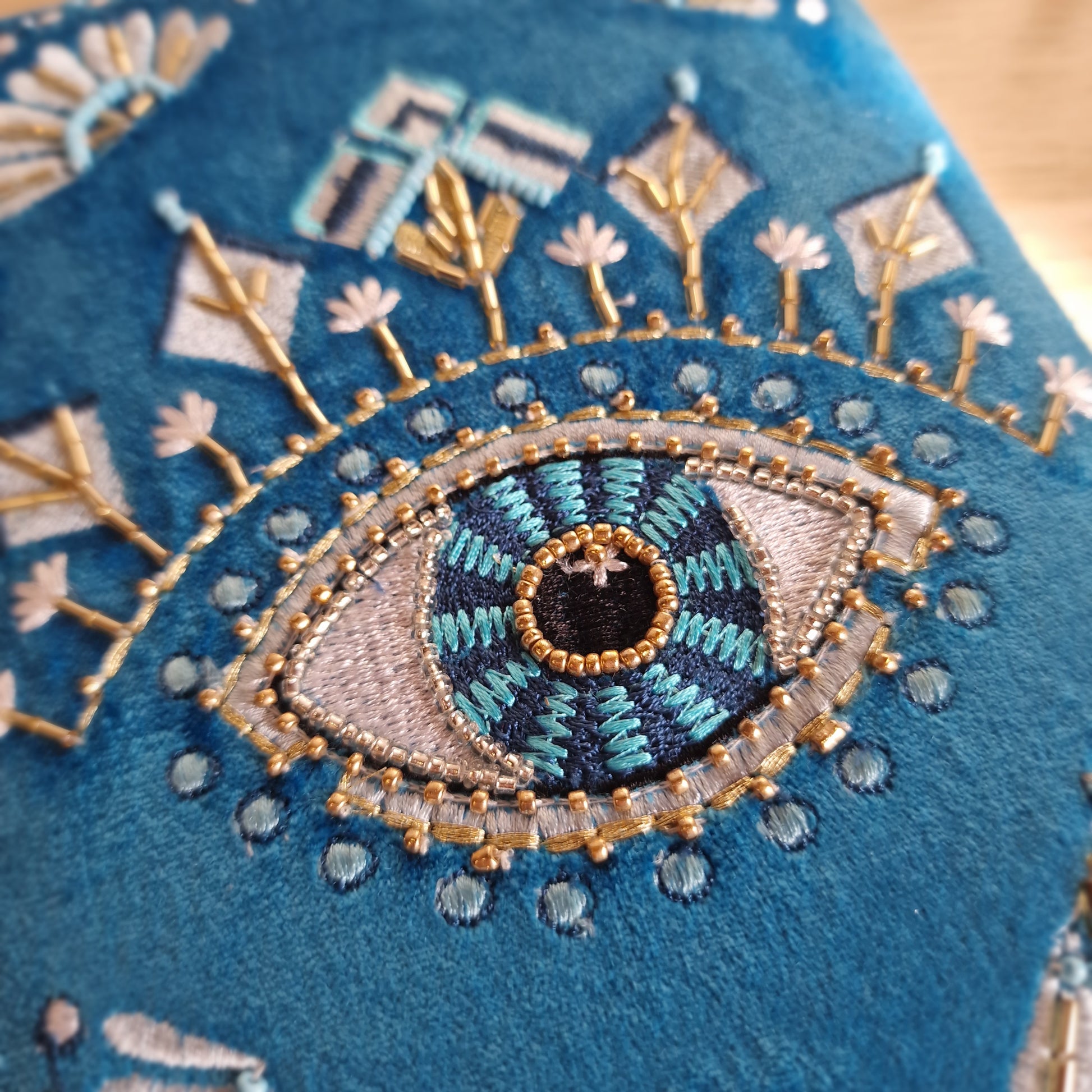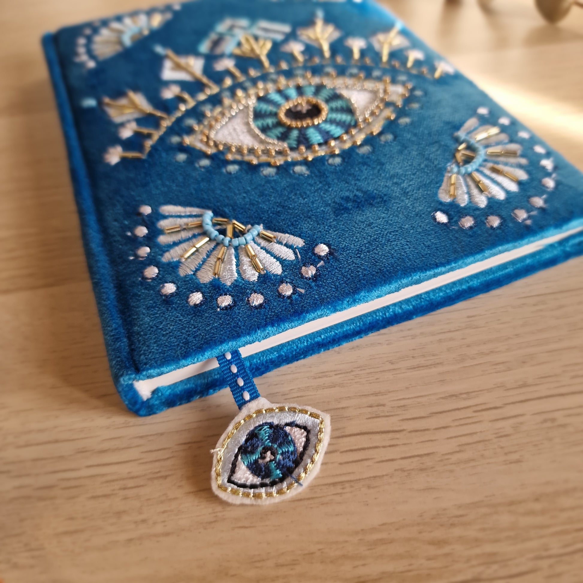 Este cuaderno de terciopelo azul combina suavidad, simbolismo y elegancia. En su portada destaca el Ojo, un emblema de intuición, protección y conexión con la sabiduría interior, decorado con delicados bordados y pequeñas perlas.