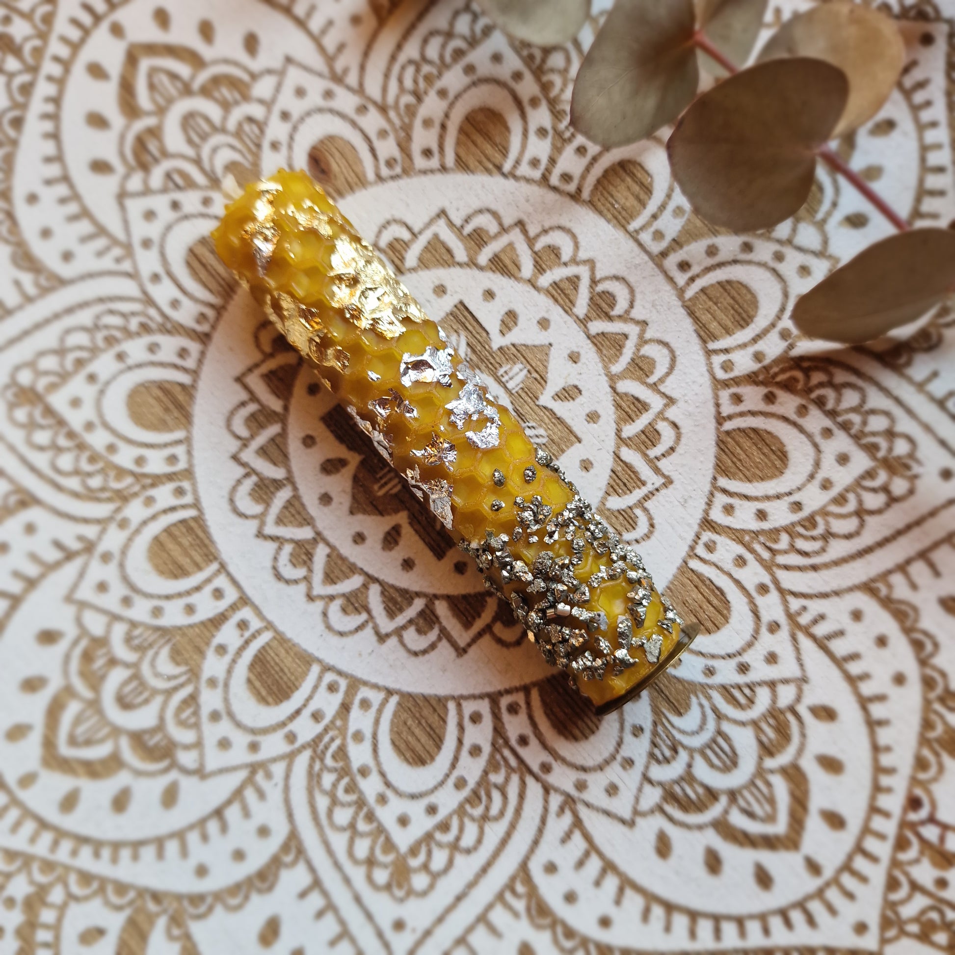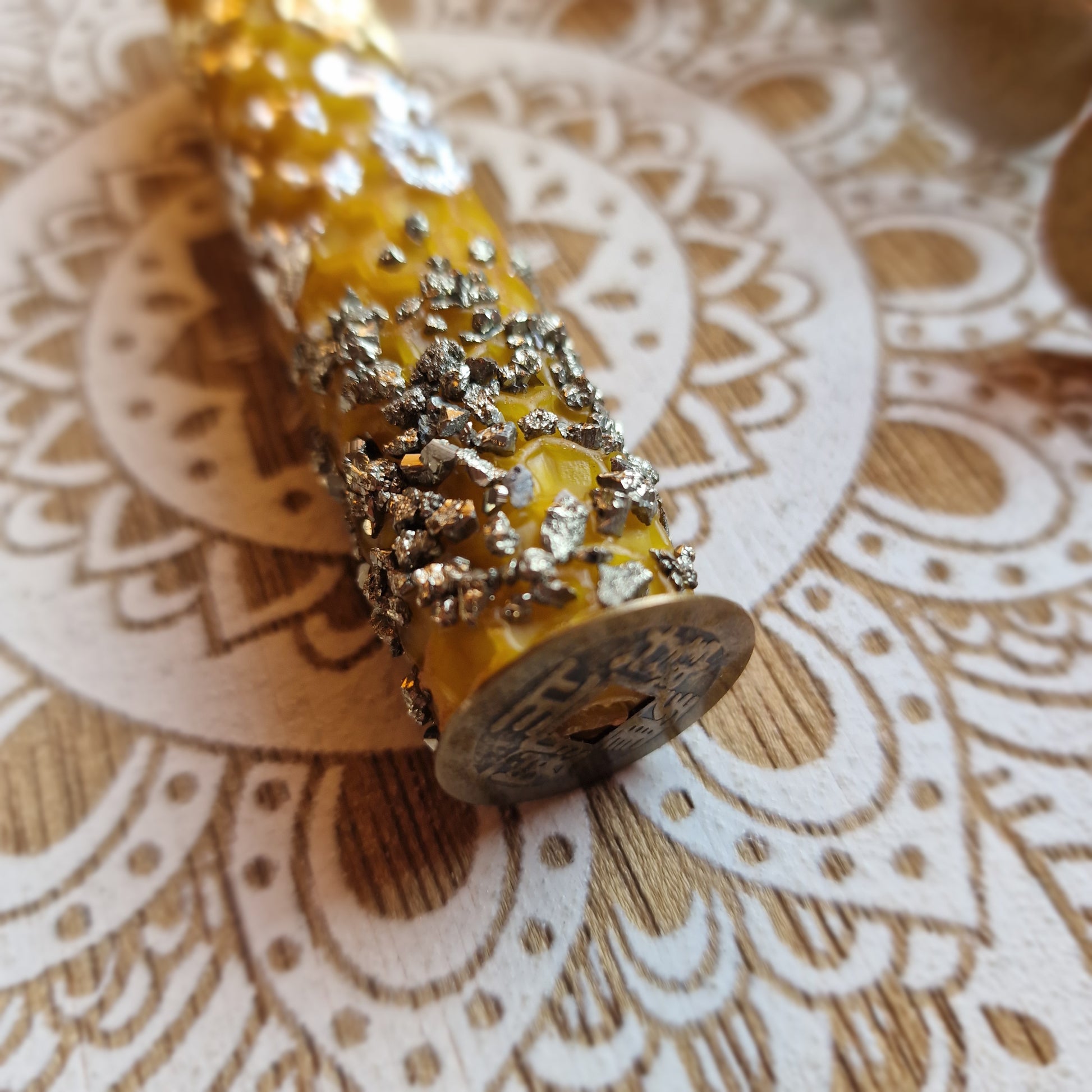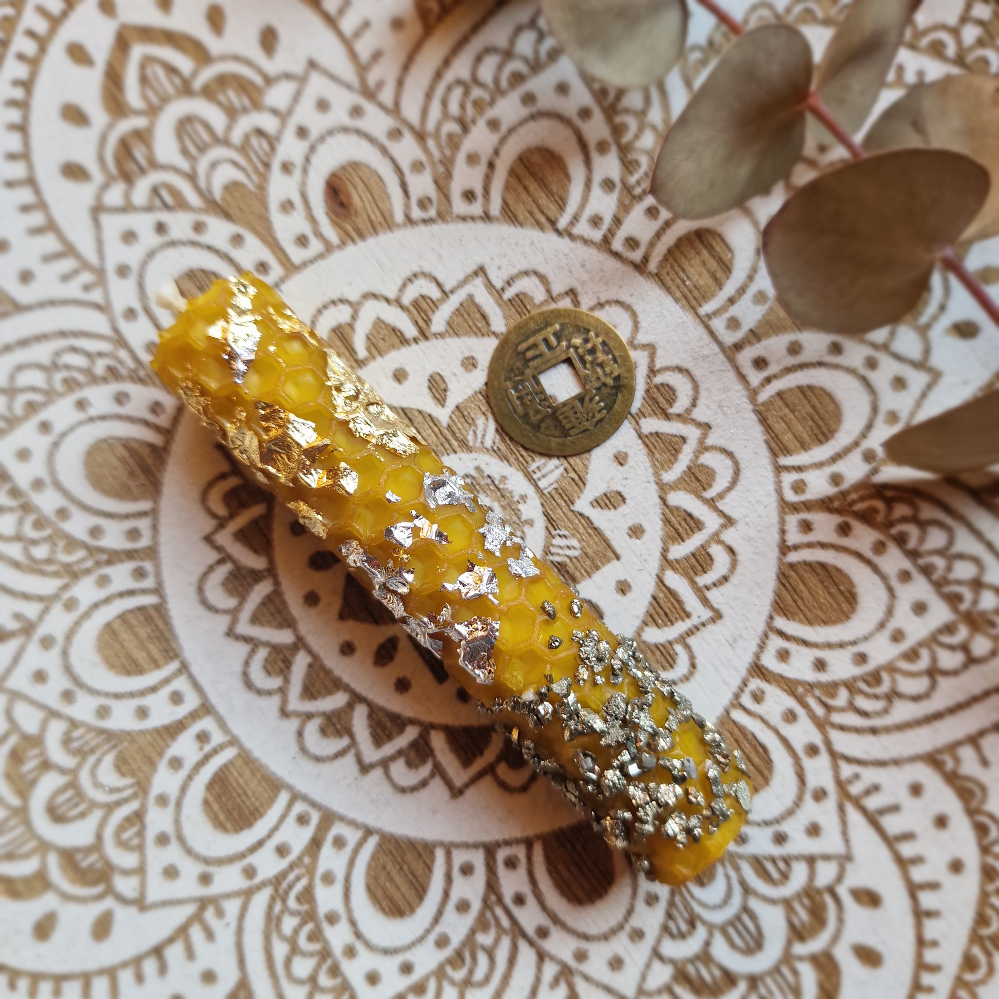 🕯️ Elaborada con cera de abeja, chips de pirita, moneda de la fortuna, pan de oro y papel de plata.