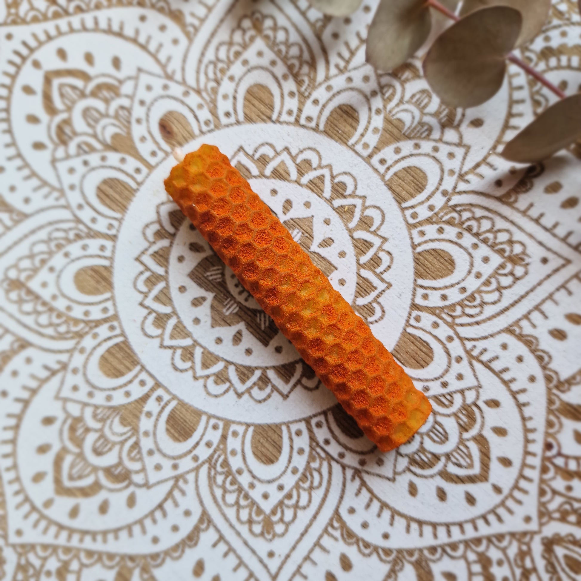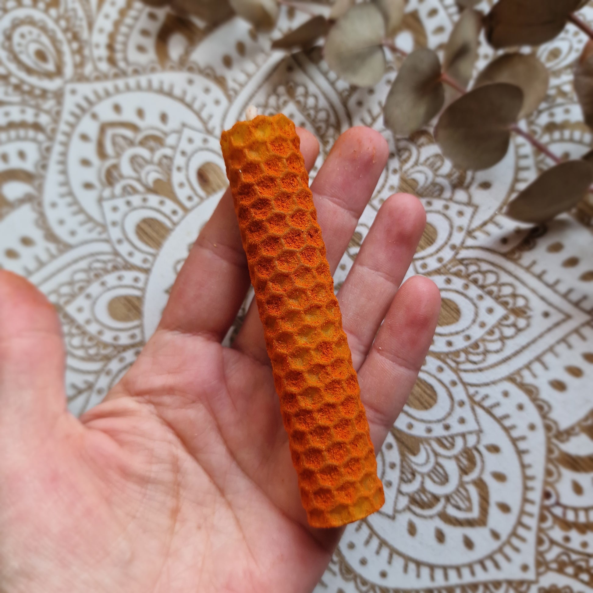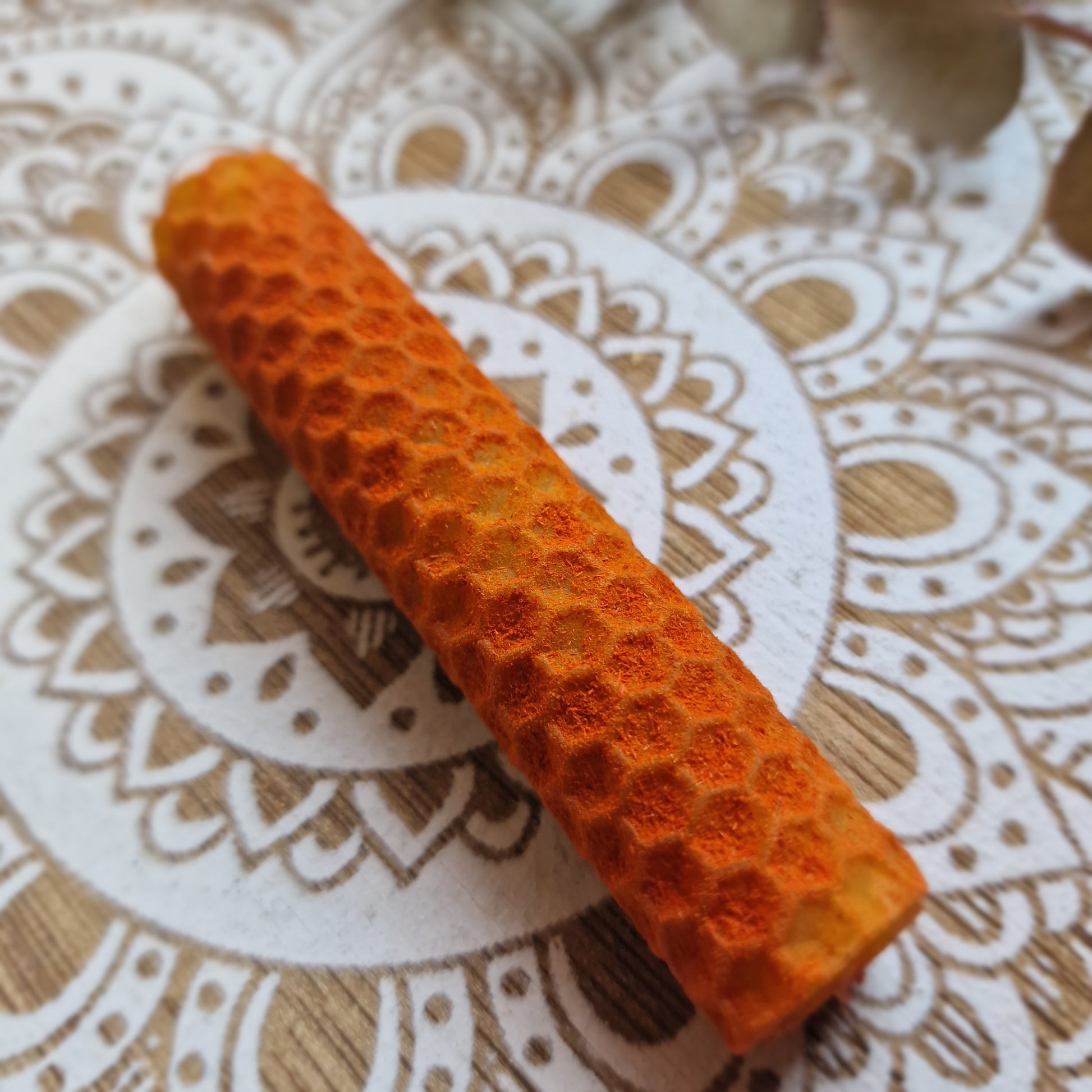 🕯️ Elaborada con cera de abeja natural y polvo de sándalo.