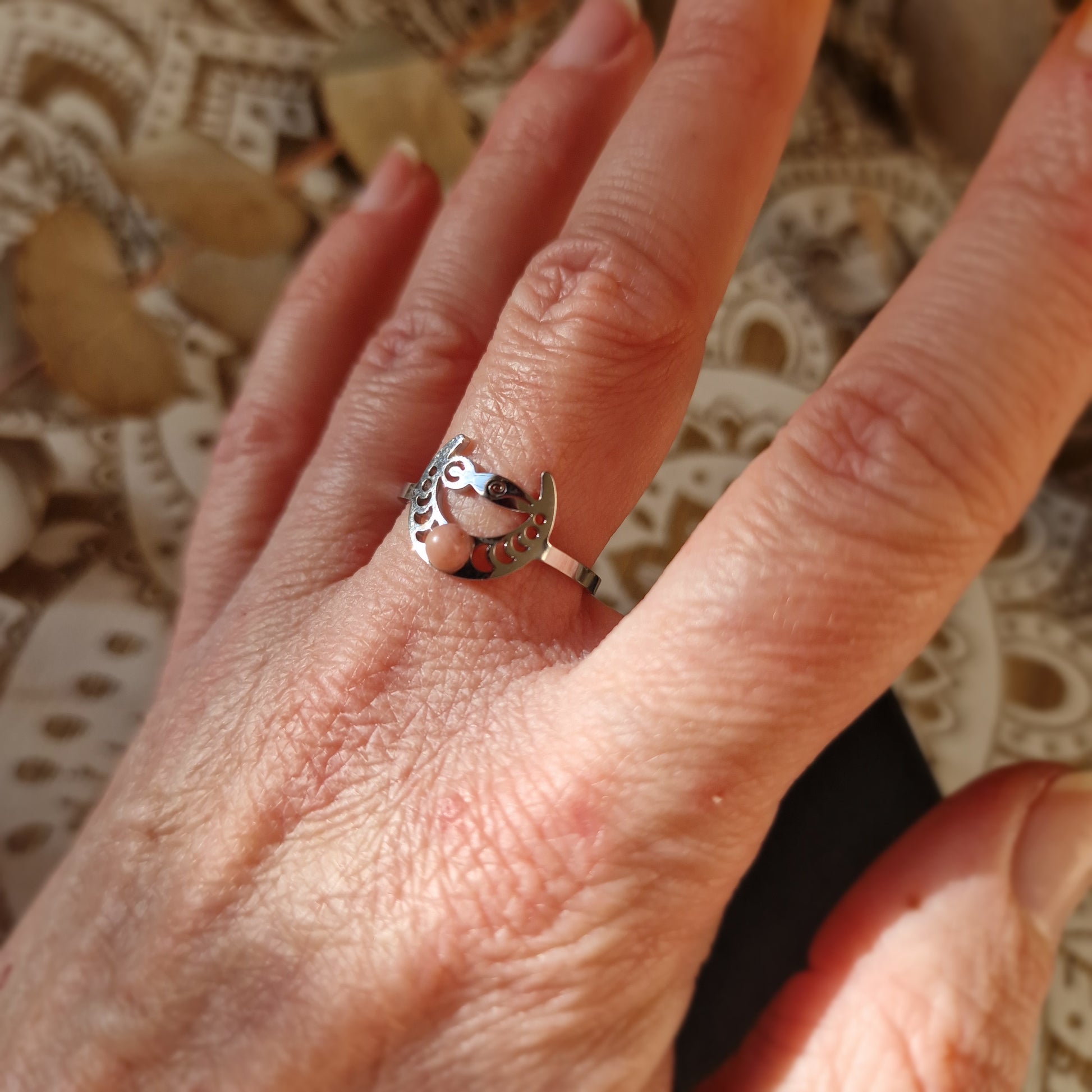 Este anillo ajustable de acero plateado presenta un diseño simbólico en forma de luna con las fases lunares grabadas. De un extremo al otro aparece la figura de la diosa de la fertilidad, representando la energía creadora, los ciclos de la vida y la conexión con lo femenino. En el centro de la luna se sitúa una rodonita natural redonda que aporta un delicado tono rosado al conjunto.