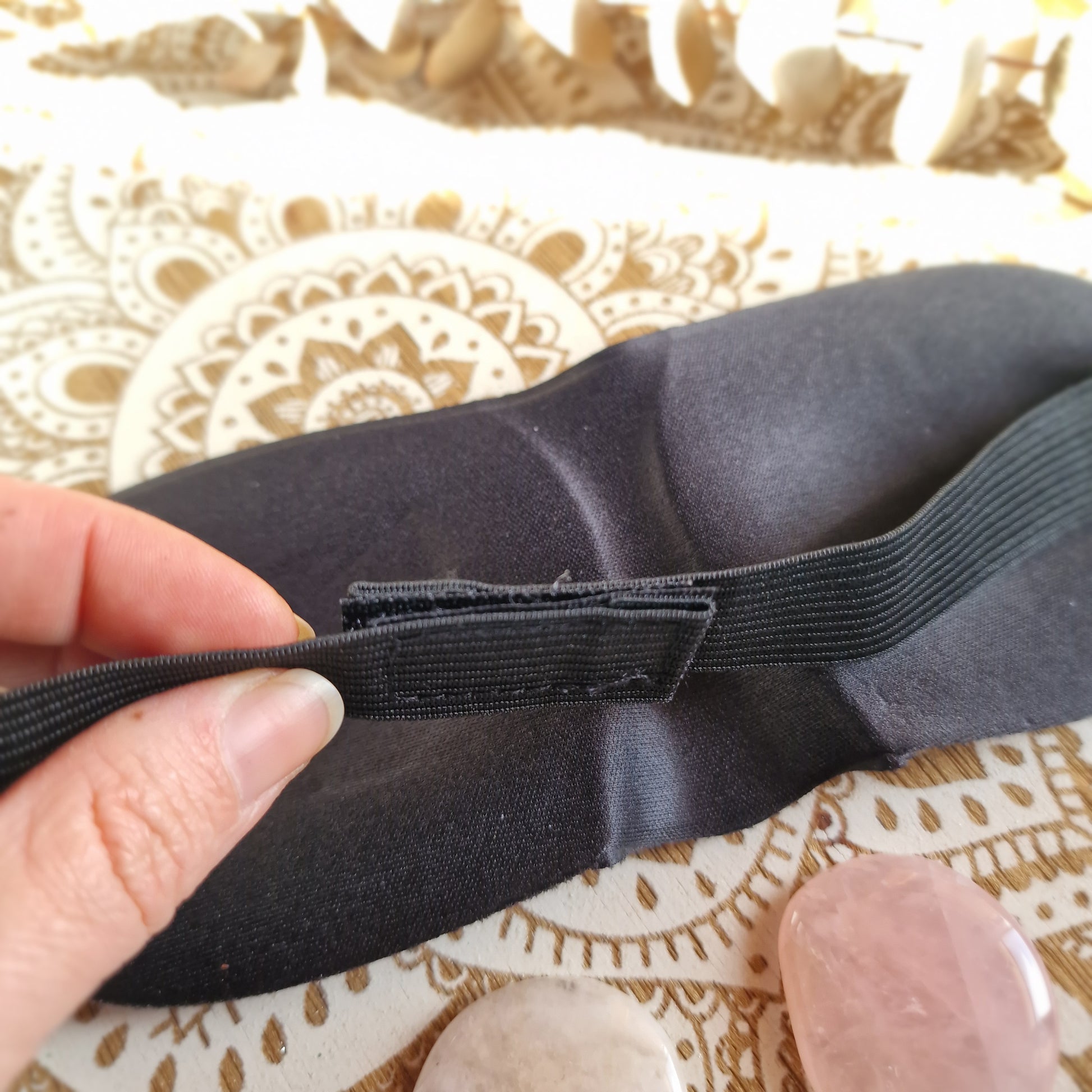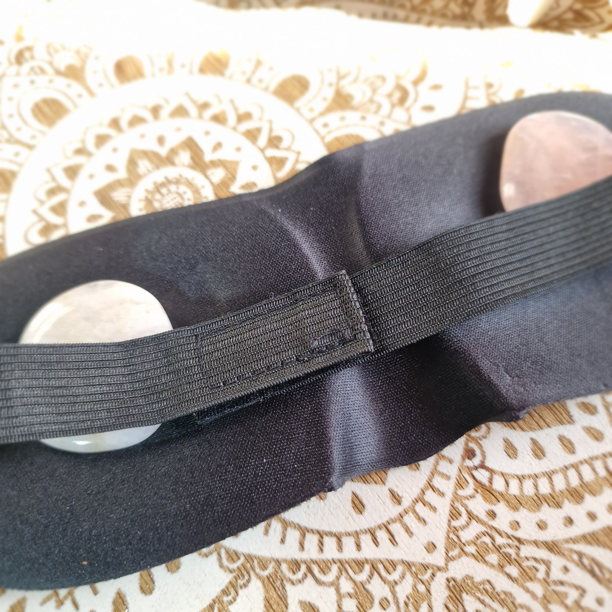 Este antifaz acolchado de color negro, con goma elástica ajustable, está diseñado específicamente para terapias de relajación ocular y momentos de descanso profundo. Incorpora dos rodados de cuarzo rosa natural, colocados estratégicamente para apoyar suavemente la zona de los ojos.