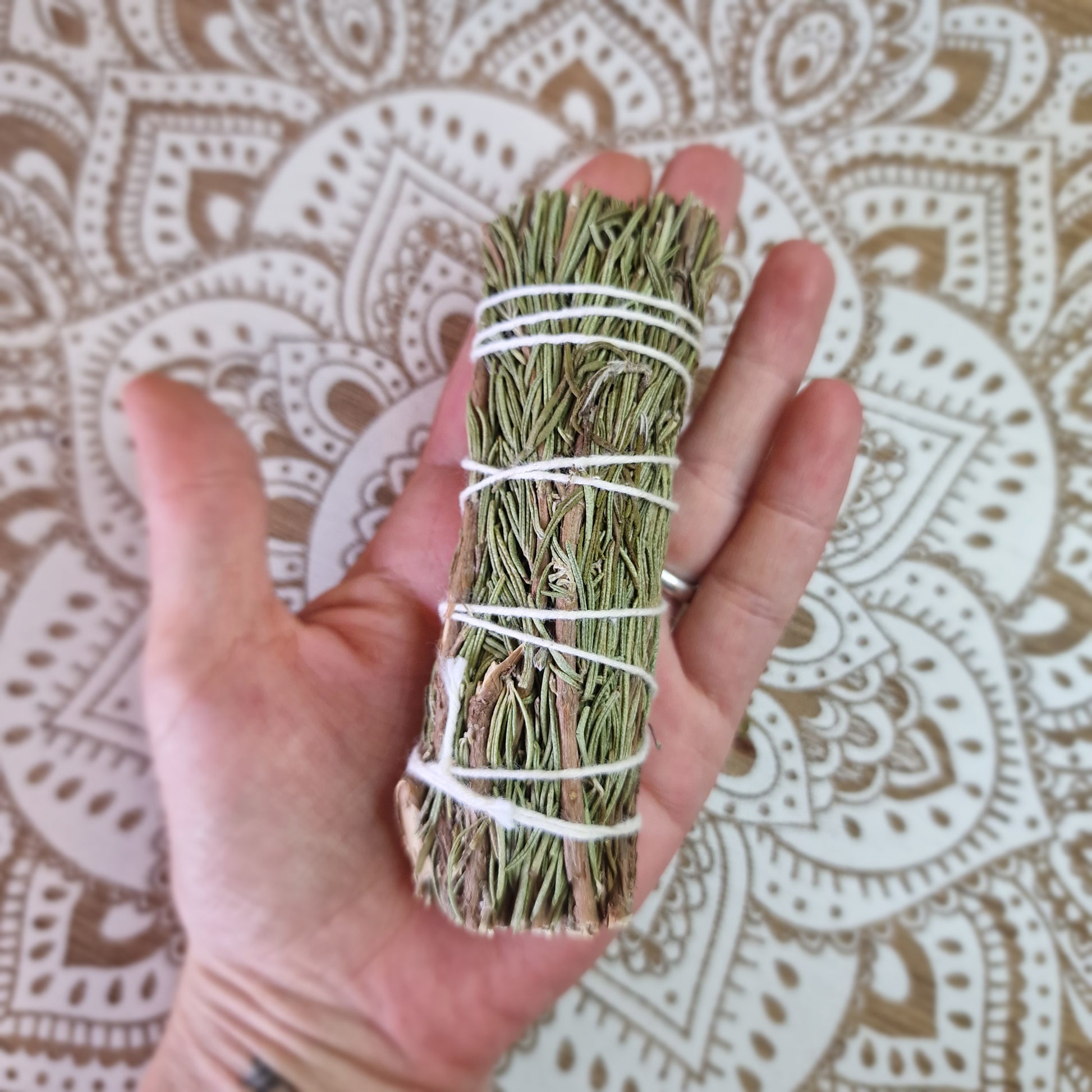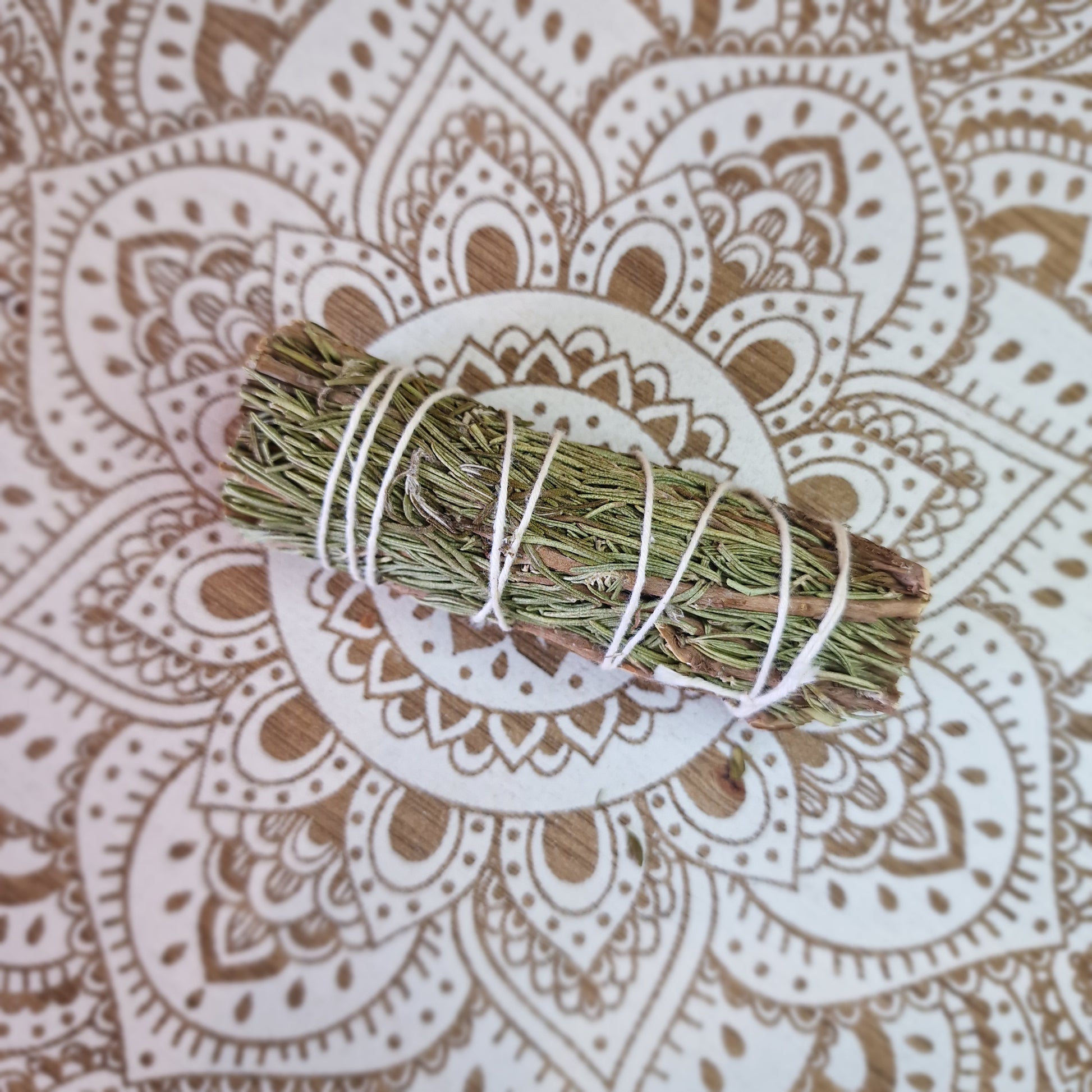 A medida que el humo asciende, se siente como si la energía purificadora del romero estuviera limpiando el entorno, eliminando cualquier rastro de negatividad. El aroma terroso y levemente resinado del romero crea una atmósfera que inspira claridad mental y concentración.
