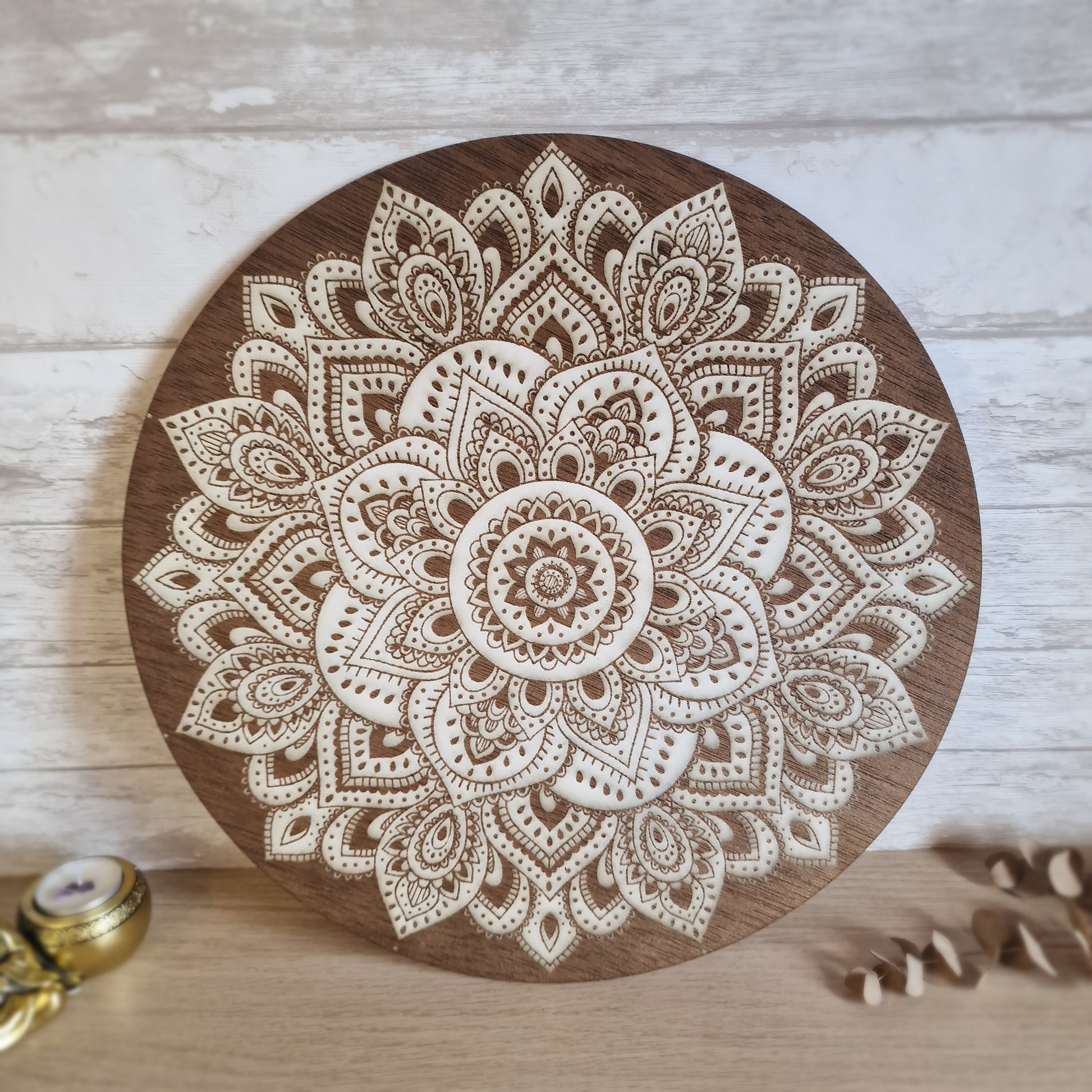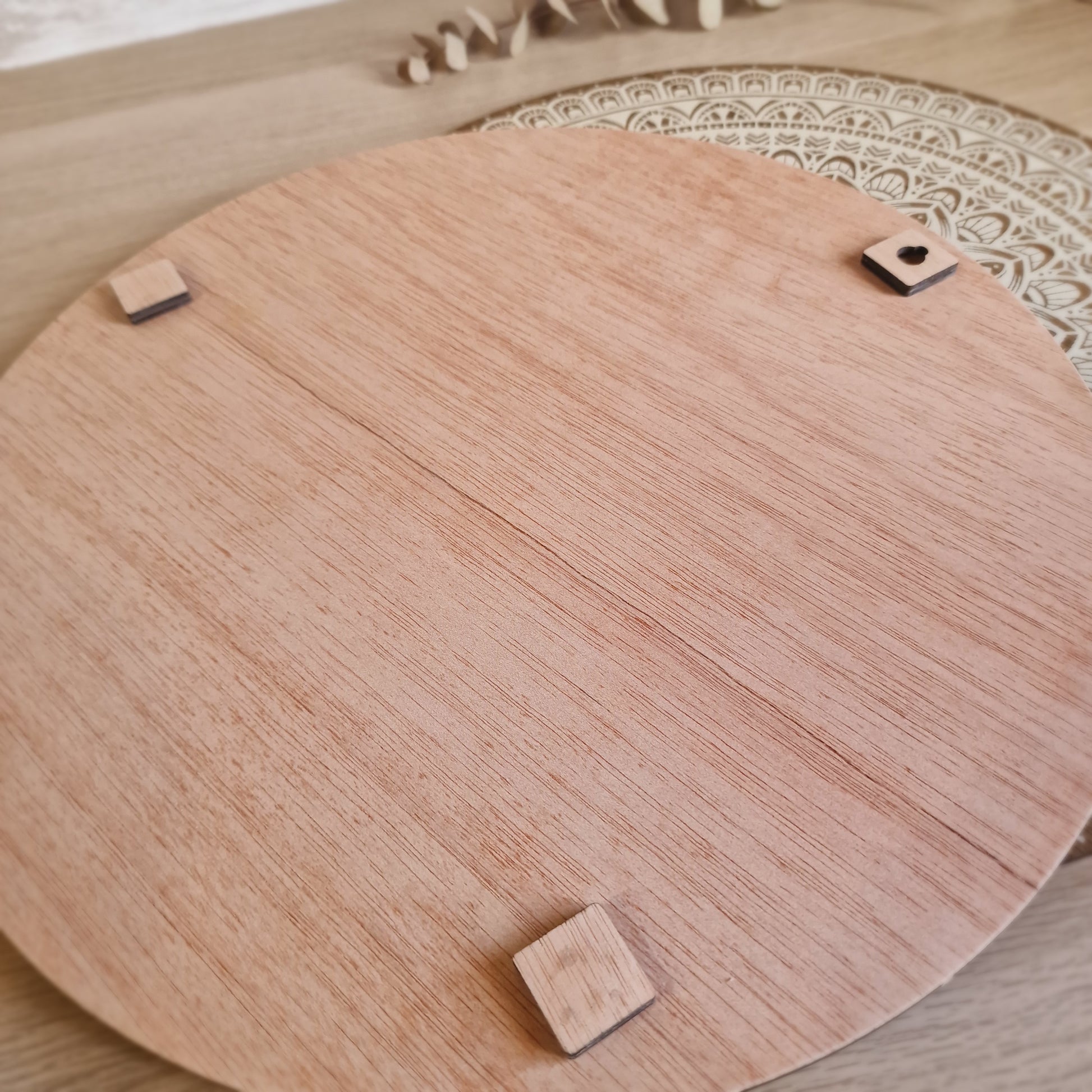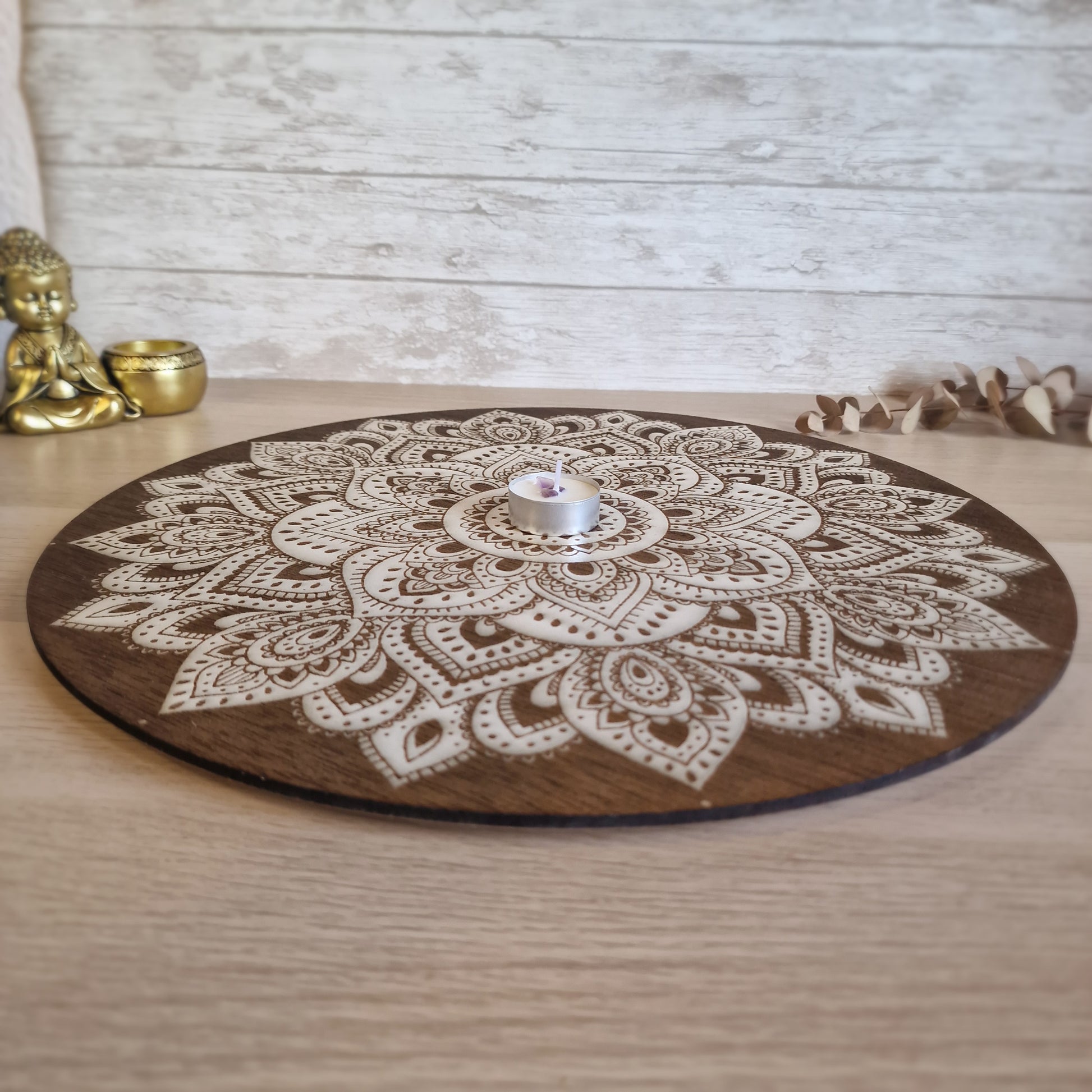 Una pieza artesanal de gran formato, elaborada en madera de abedul con un delicado mandala grabado y pintado en tonos blanco, negro o natural , perfecta para dar presencia y simbolismo a tu altar o decorar cualquier rincón de tu hogar.