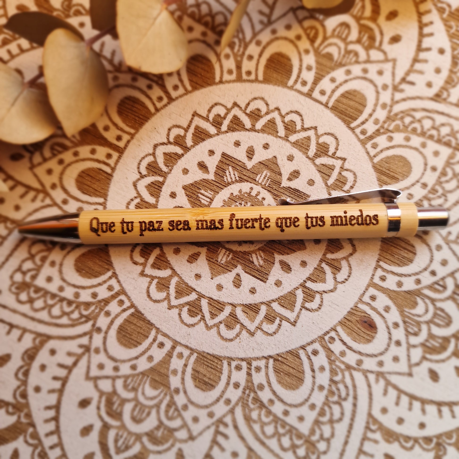Bolígrafo de bambú grabado con una frase motivadora, ideal para acompañarte en el día a día. Ligero y cómodo, con tinta negra para una escritura fluida y agradable.