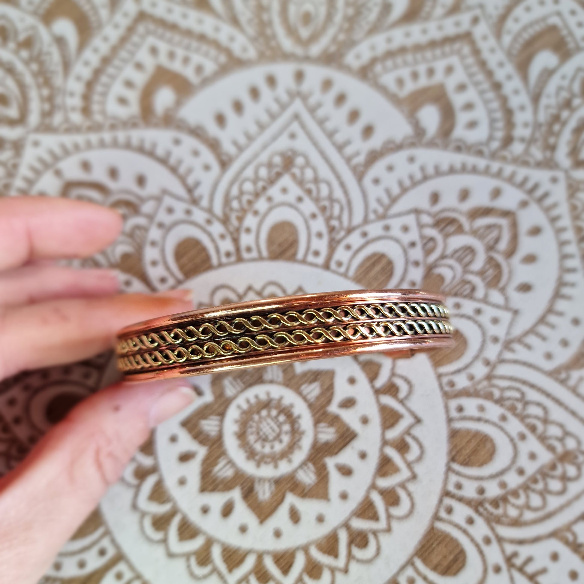 Un brazalete creado en cobre, rematado con pequeños imanes integrados en cada extremo. Su diseño abierto y ajustable permite llevarlo cómodamente durante todo el día, acompañándote como un recordatorio de equilibrio y bienestar.