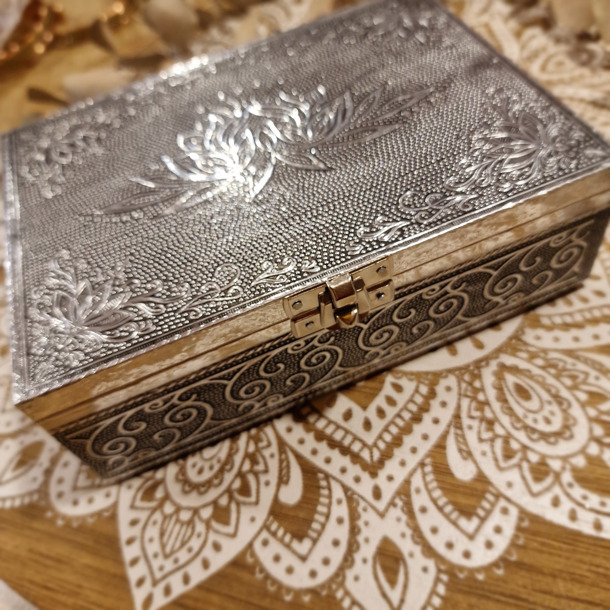 Con unas medidas de 18 x 13 x 6 cm, es el tamaño perfecto para guardar joyas, minerales, cartas de oráculo, recuerdos especiales o cualquier pequeño tesoro que desees mantener a salvo y con estilo.