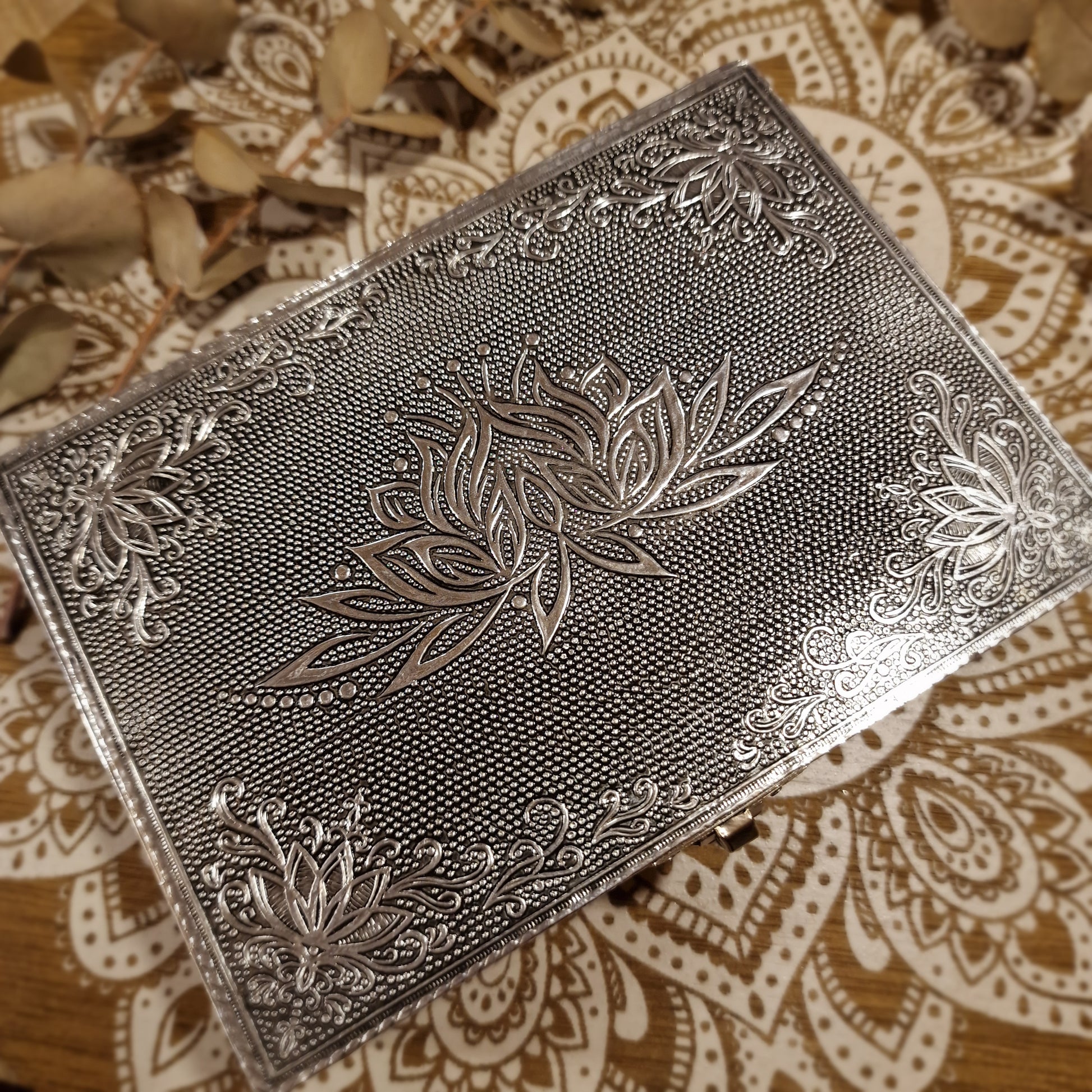 Esta elegante caja decorativa combina la calidez de la madera MDF con la luminosidad de su cubierta de aluminio impreso, donde destaca un refinado diseño de flor de loto. Su interior, forrado con fieltro negro, protege delicadamente todo lo que guardes, mientras que sus pequeñas patas de goma aportan estabilidad y evitan arañazos en las superficies.