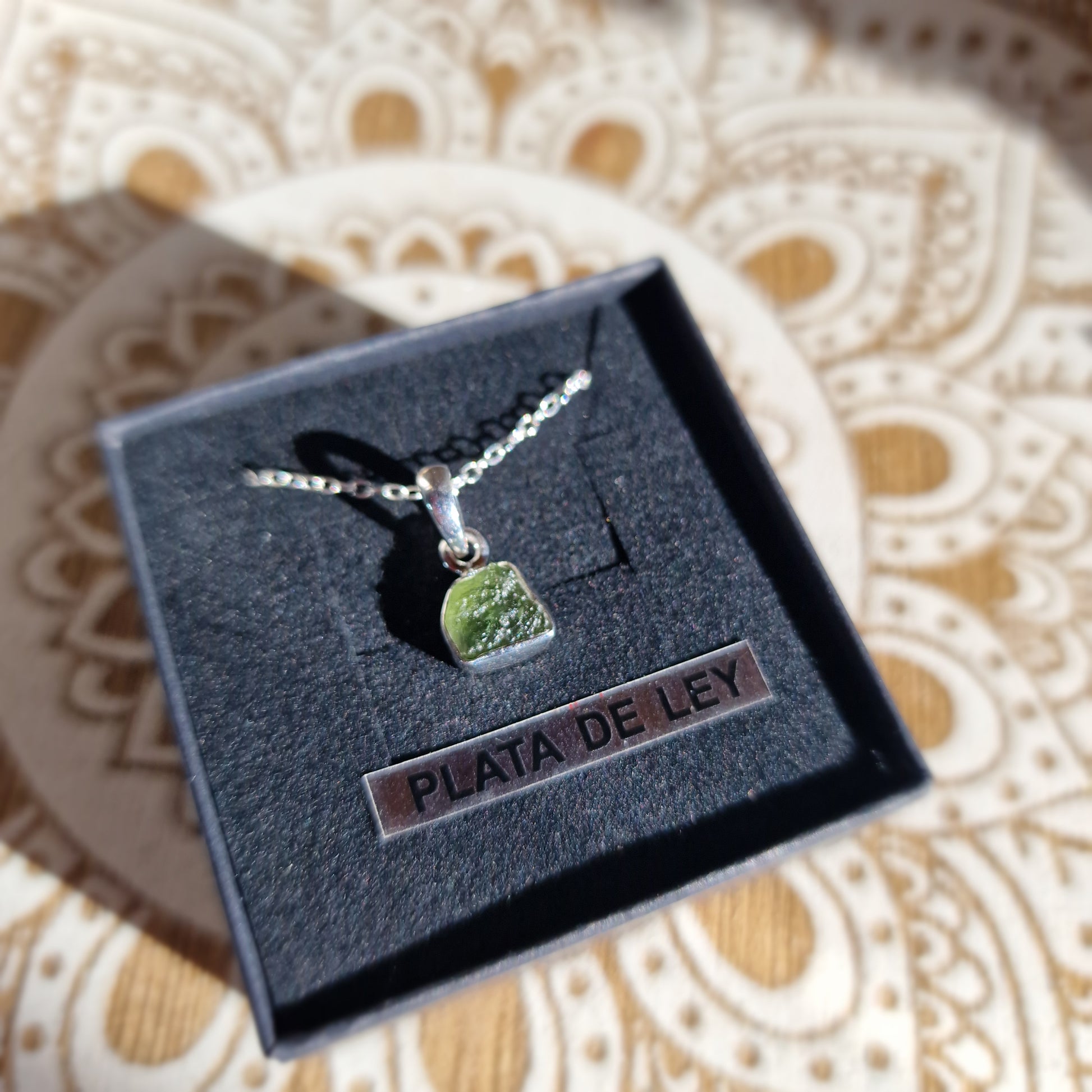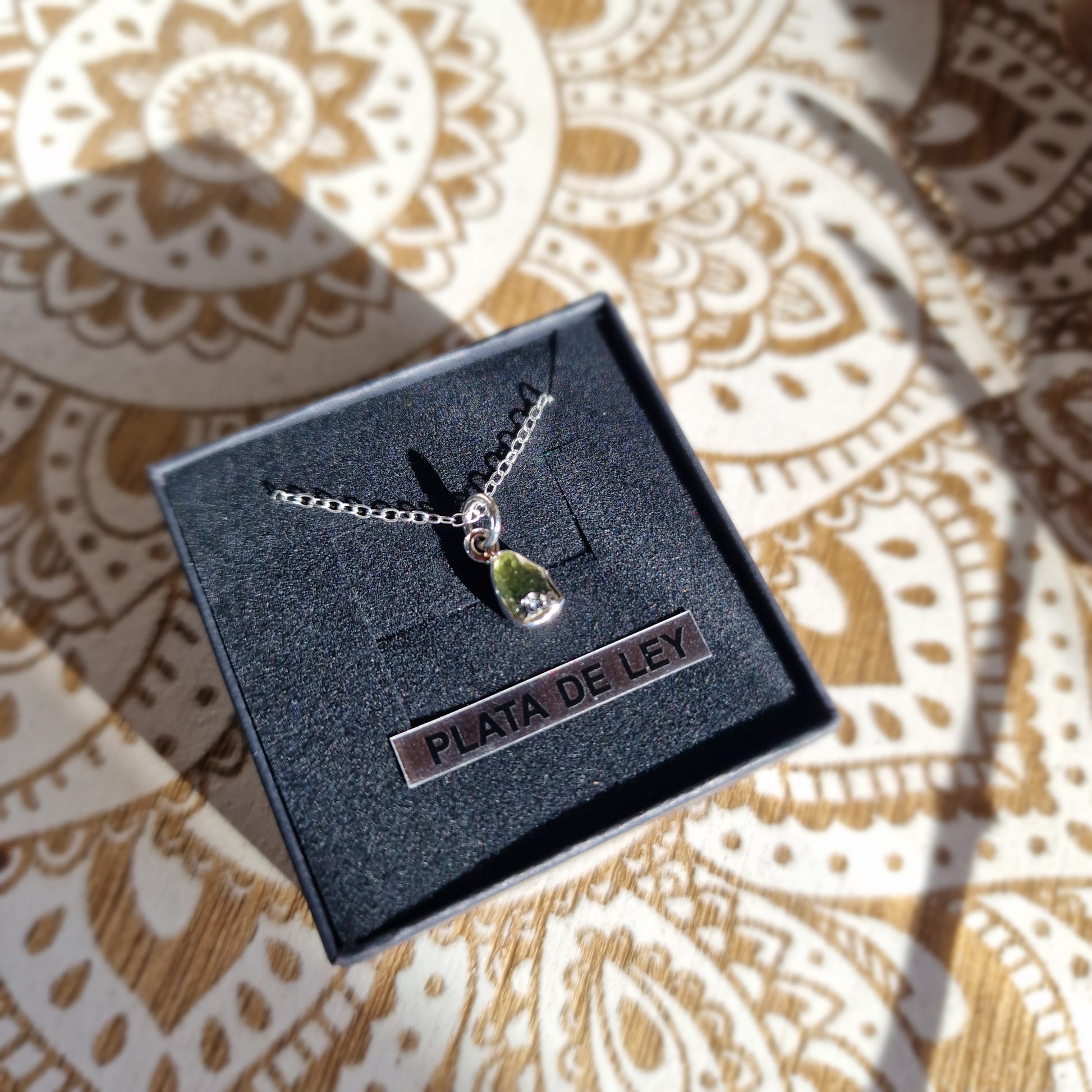 La moldavita es un vidrio natural de origen meteorológico, formado hace aproximadamente 15 millones de años tras el impacto de un meteorito en la región del actual río Moldava, en la República Checa. Su color verde, sus formas irregulares y su procedencia única hacen de cada colgante una pieza irrepetible.