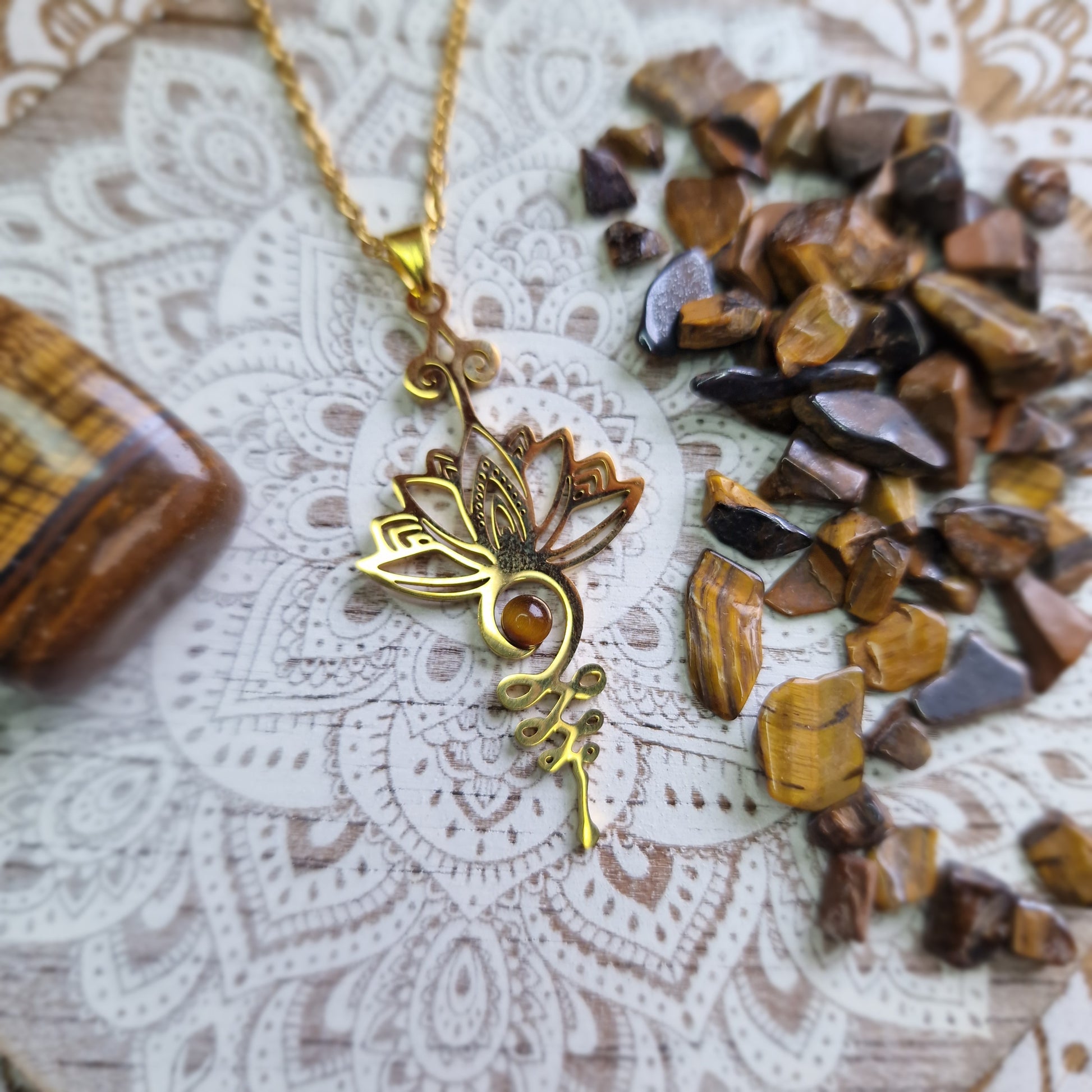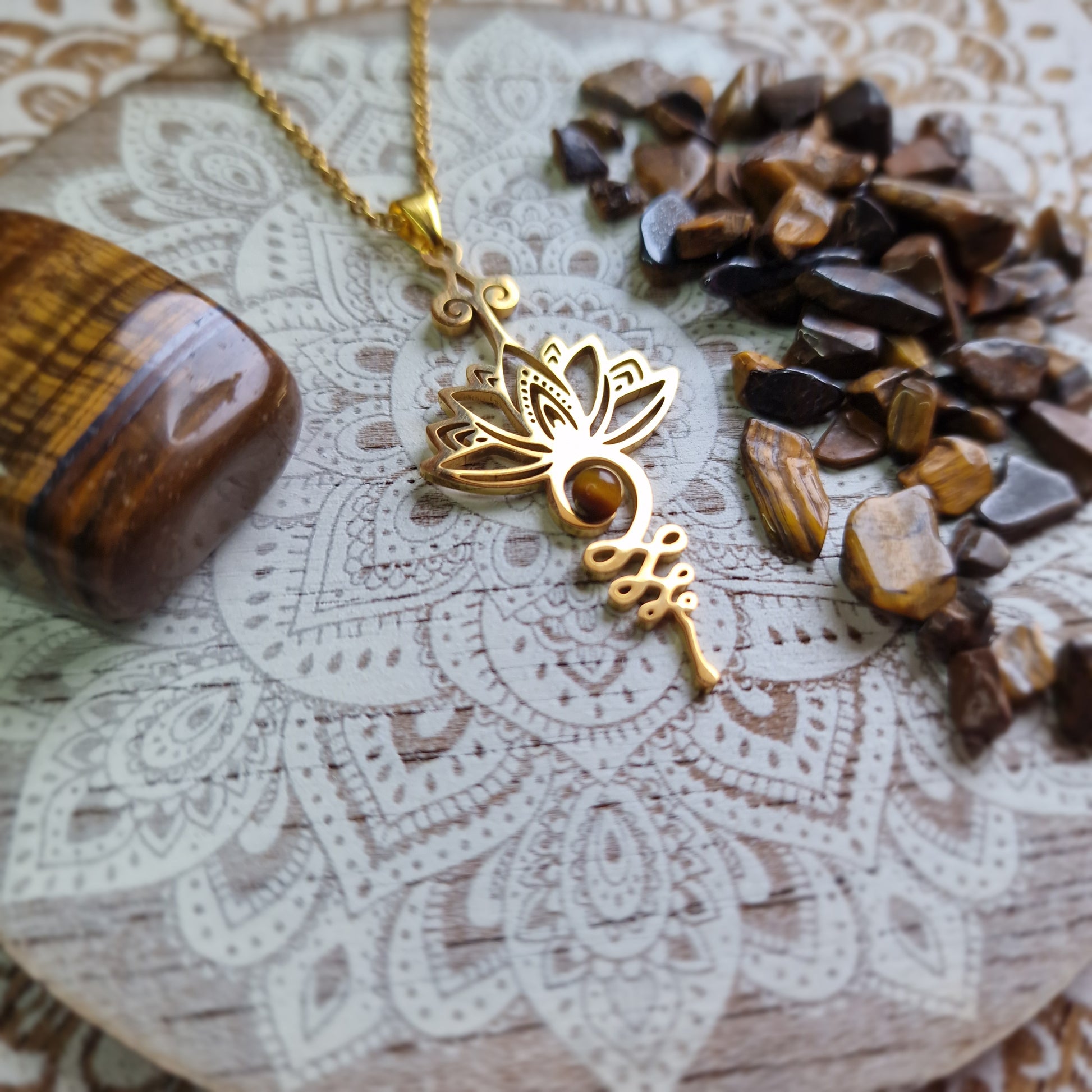 Este hermoso colgante de acero inoxidable dorado presenta el símbolo Unalome, un diseño cargado de significado espiritual, acompañado por un mineral de ojo de tigre en el centro.