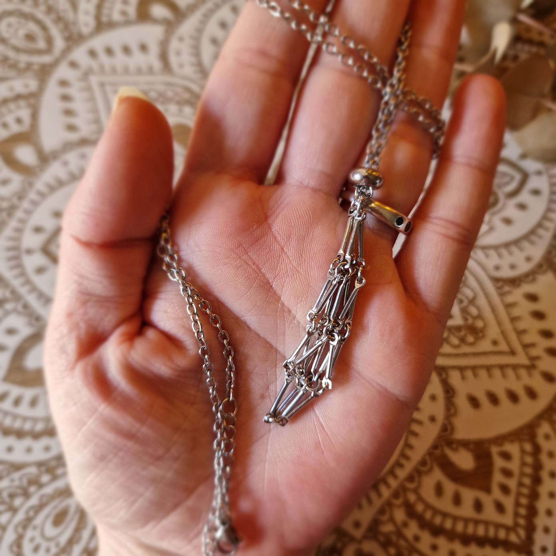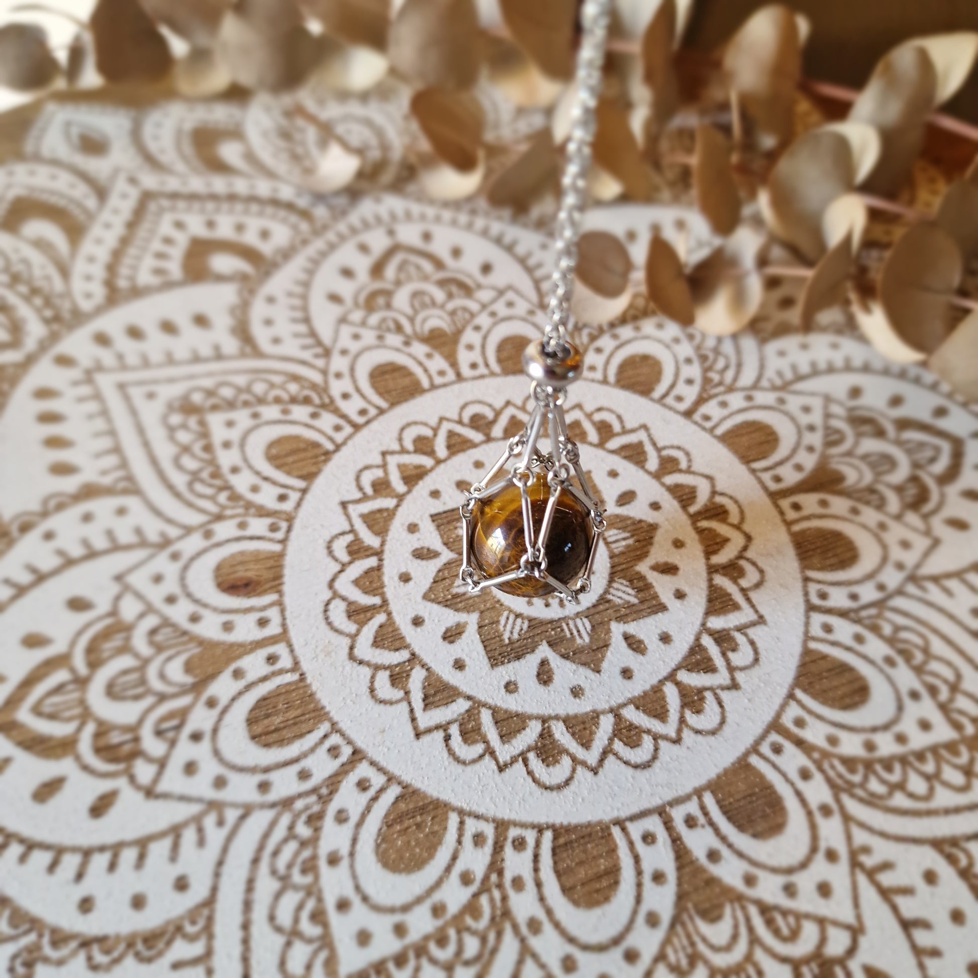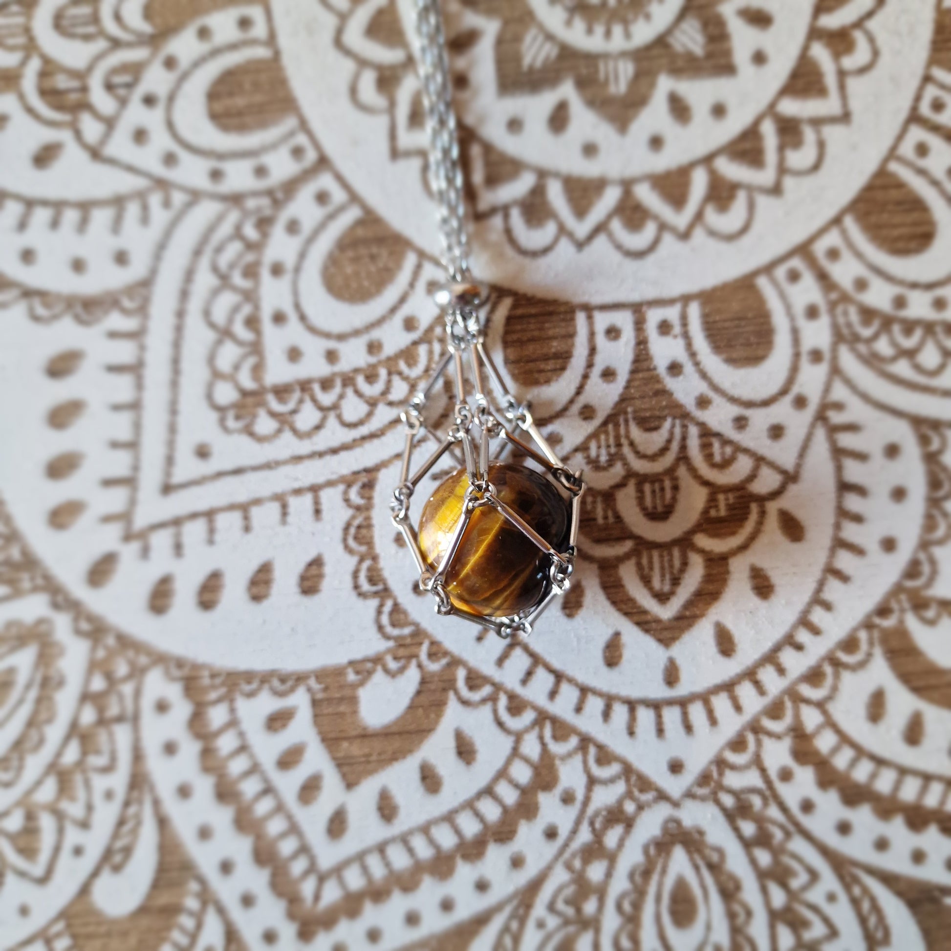 Este colgante tipo jaulita está fabricado en acero inoxidable y está diseñado para que puedas colocar en su interior el mineral que prefieras. Permite introducir esferas pequeñas, rodados o incluso piezas en bruto, adaptándose a diferentes formas.