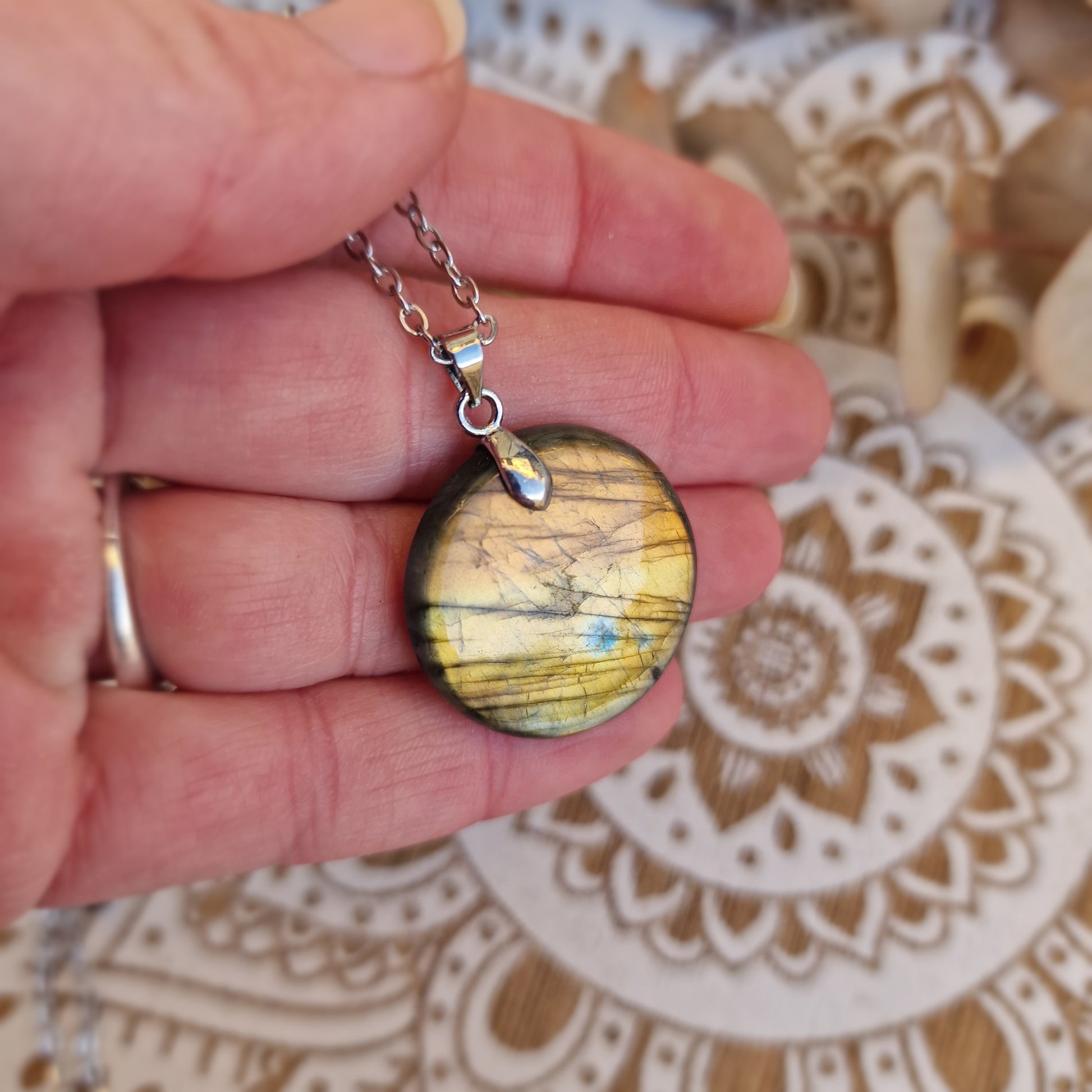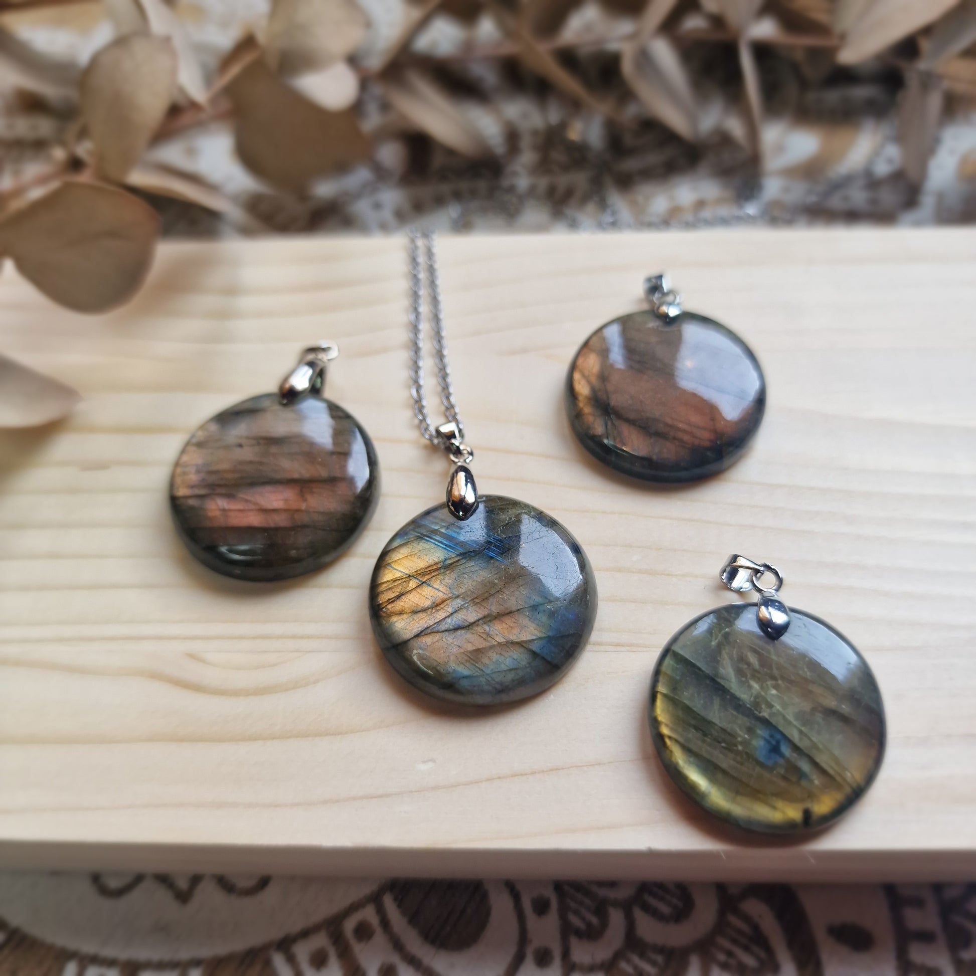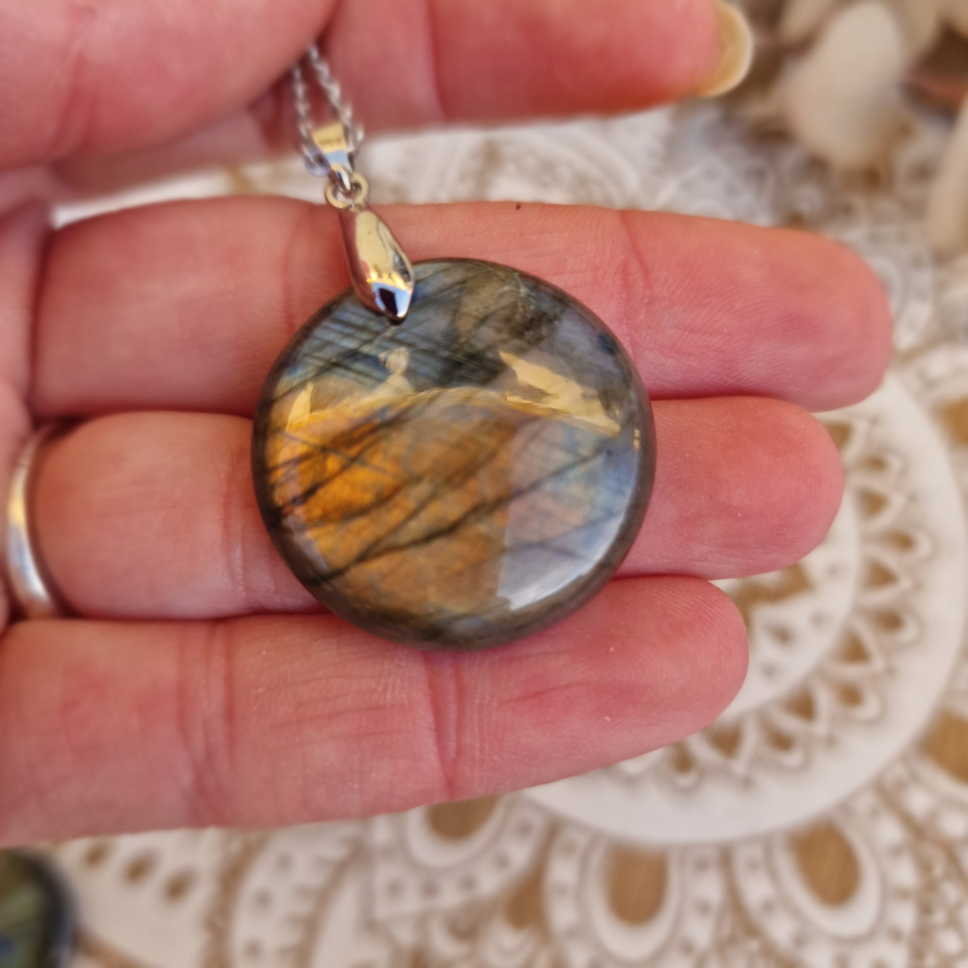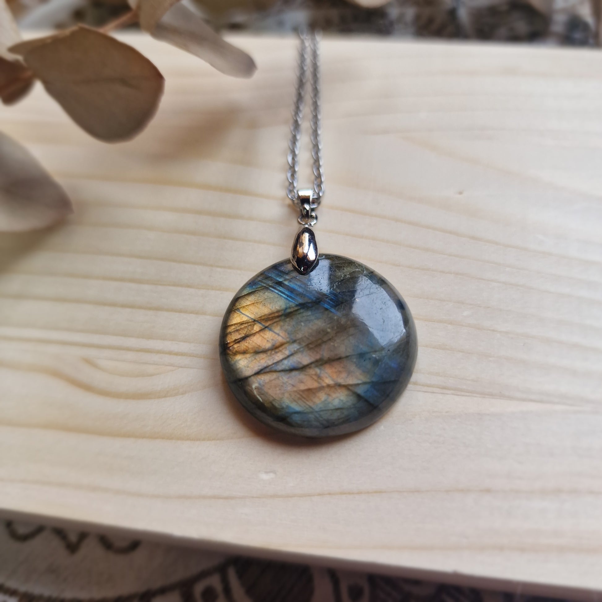 Este colgante está compuesto por una labradorita rosa en forma de rodado plano redondo de 2,6 cm de diámetro aproximadamente, pulido y suave al tacto. Incluye cadena de acero de 50 cm lista para llevar.
