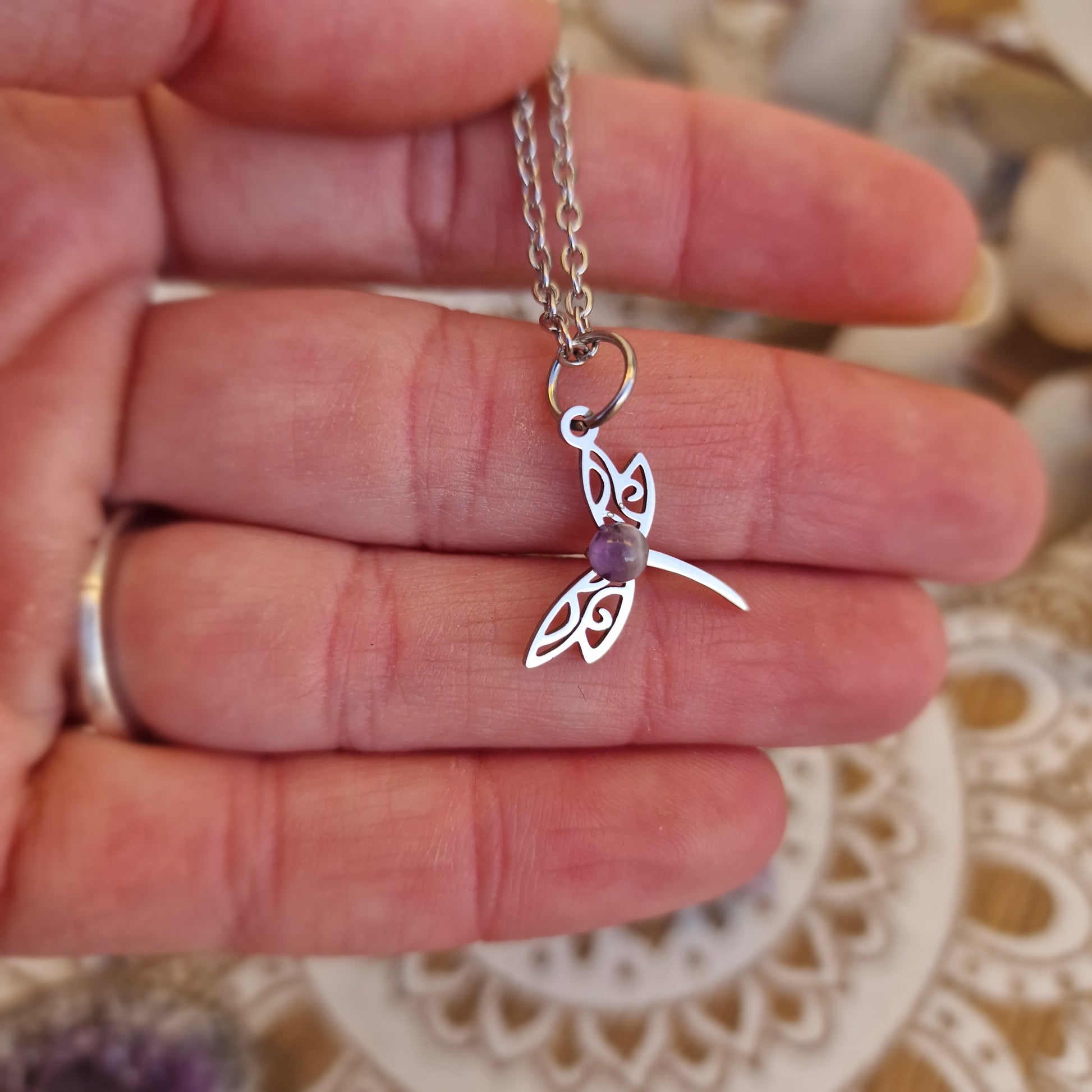 Este colgante de acero inoxidable en forma de libélula mide aproximadamente 1,8 cm e incorpora en el centro una amatista de 4 mm. Incluye cadena de acero a juego, lista para llevar.