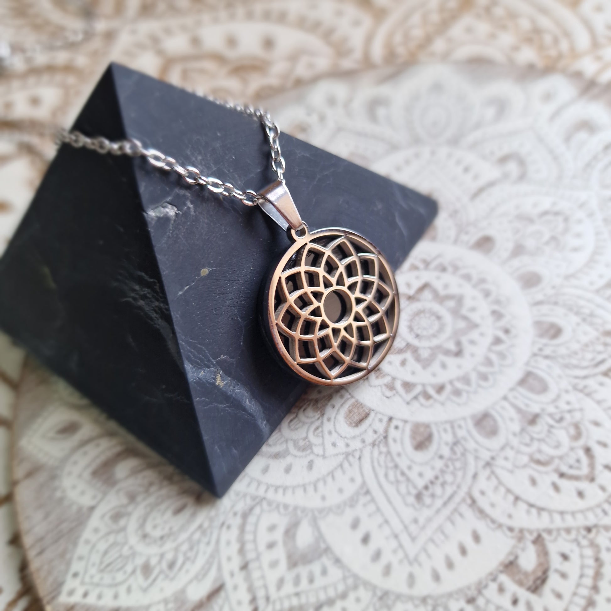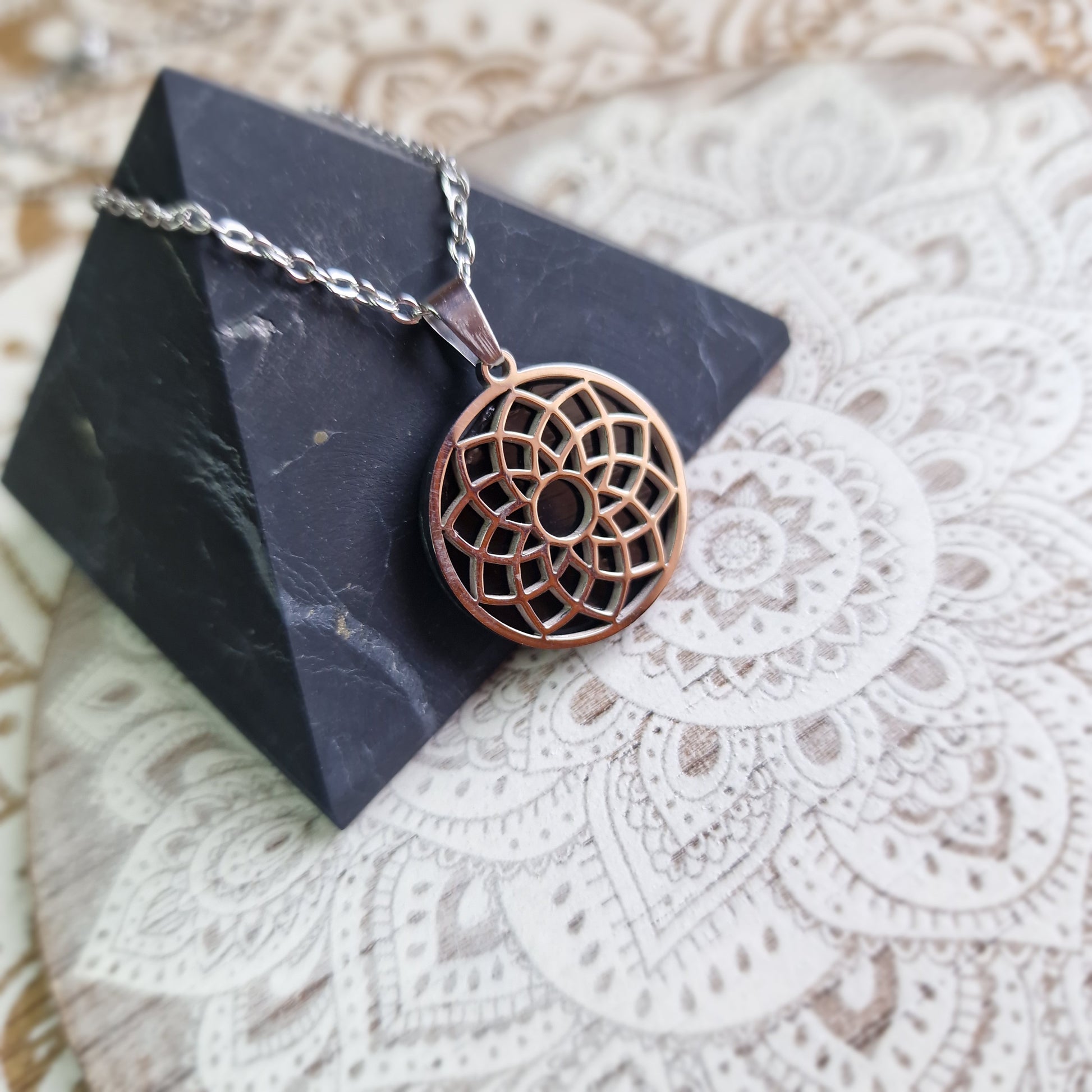 Este elegante colgante de acero inoxidable plateado presenta el símbolo sagrado del chakra Sahasrara (chakra coronilla), con un diámetro de 2 cm. Su diseño representa la conexión con la conciencia superior, la plenitud espiritual y la unión con el universo.