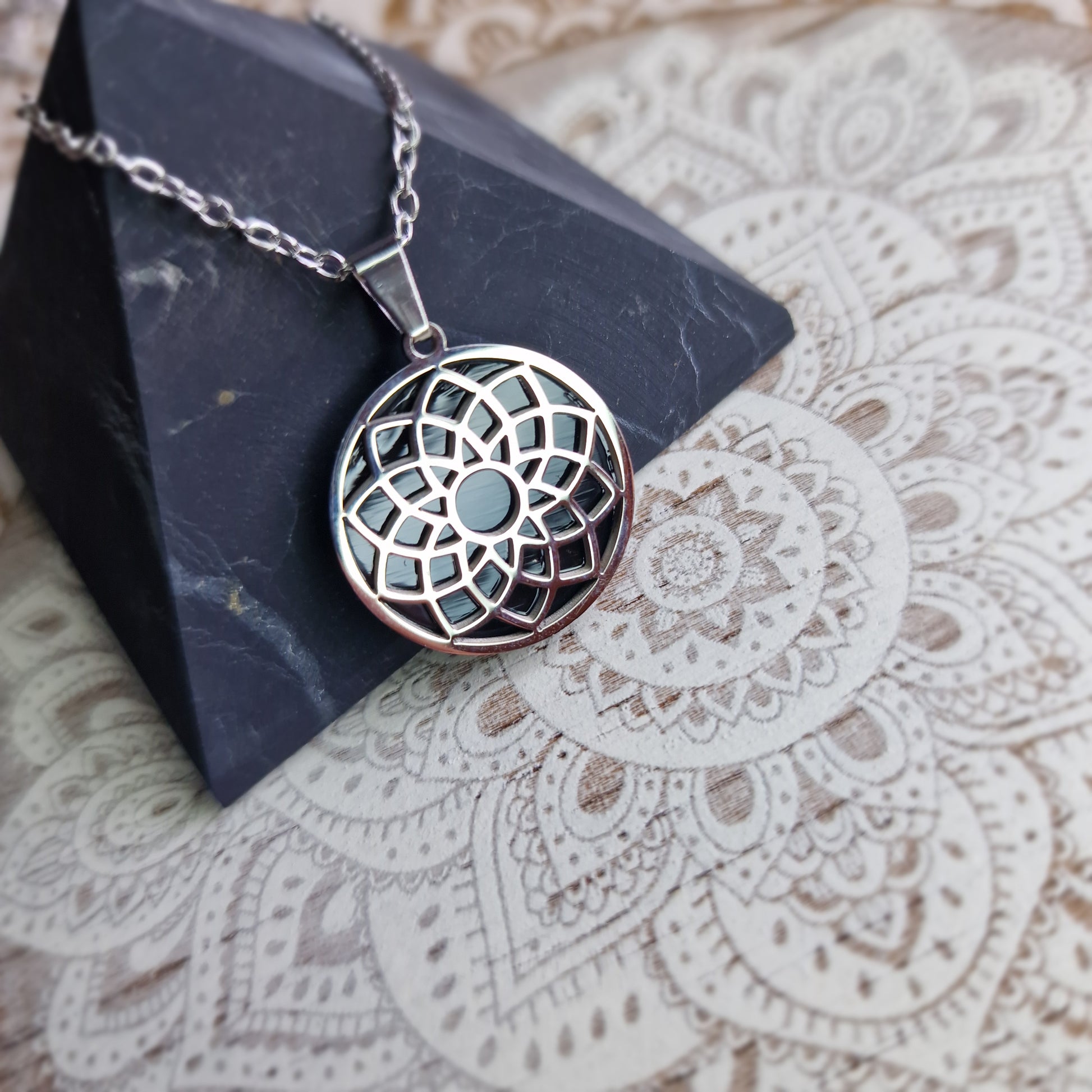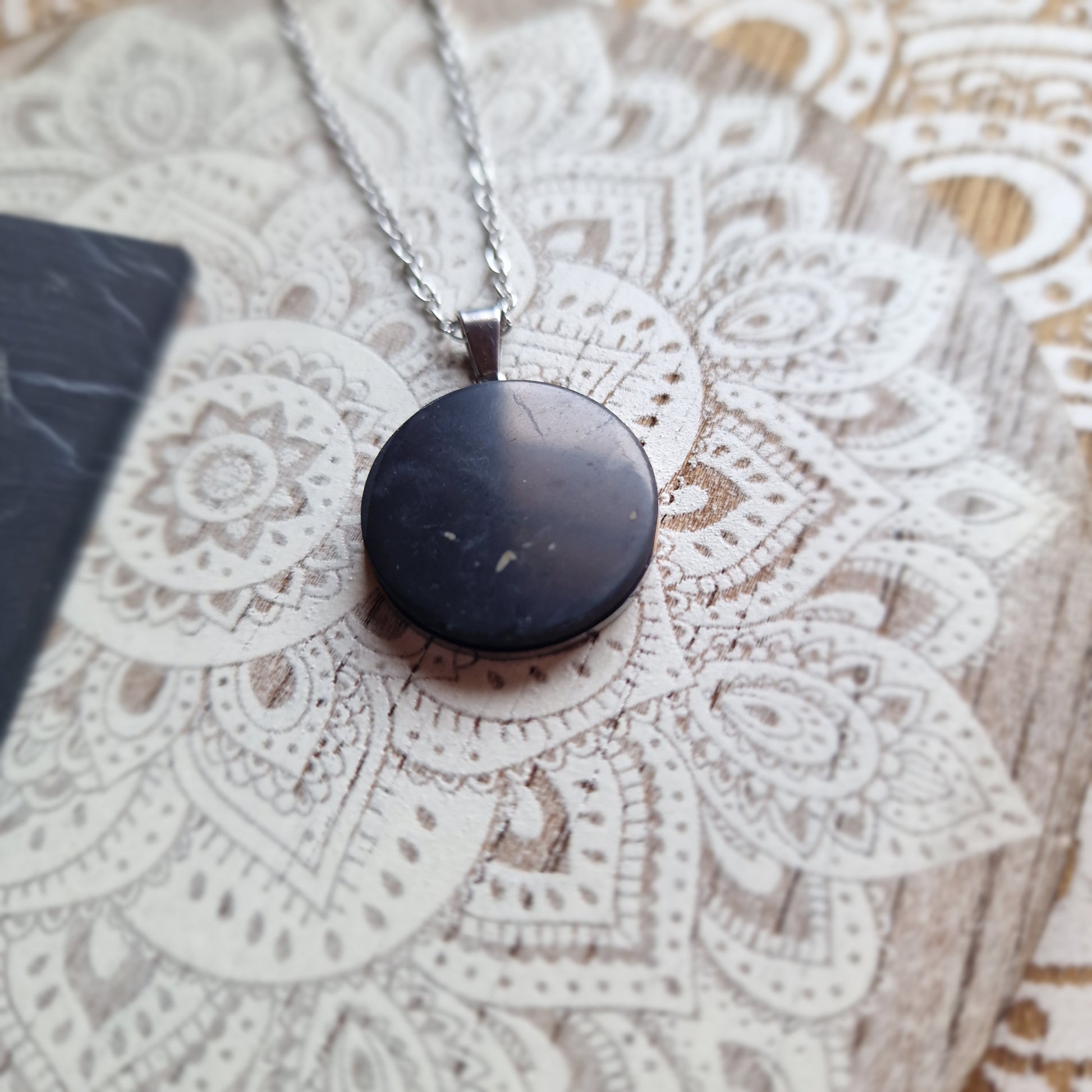 En la parte trasera, el colgante incorpora shungita natural, un mineral apreciado en la tradición por sus propiedades protectoras y purificadoras, especialmente frente a energías negativas y radiaciones electromagnéticas.
