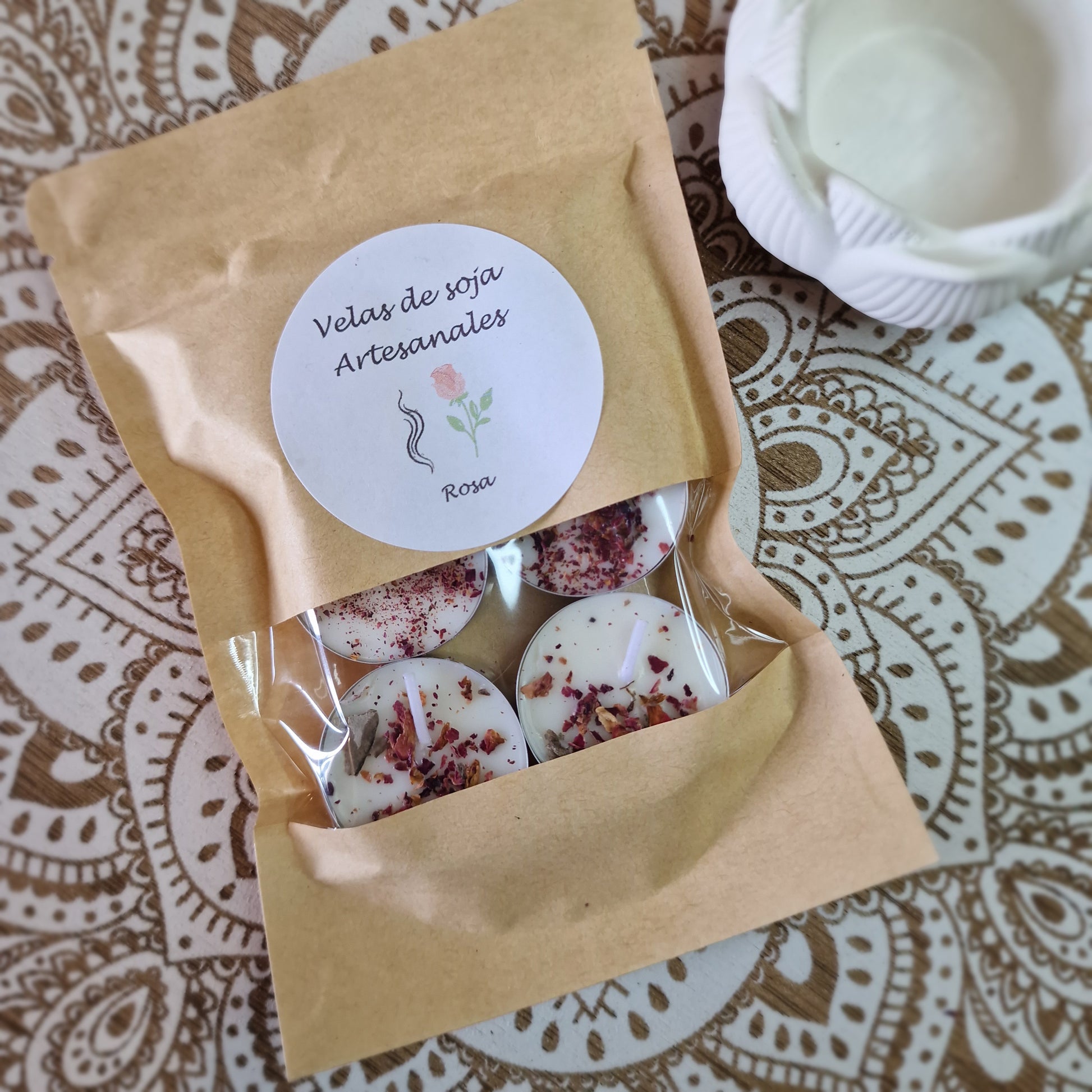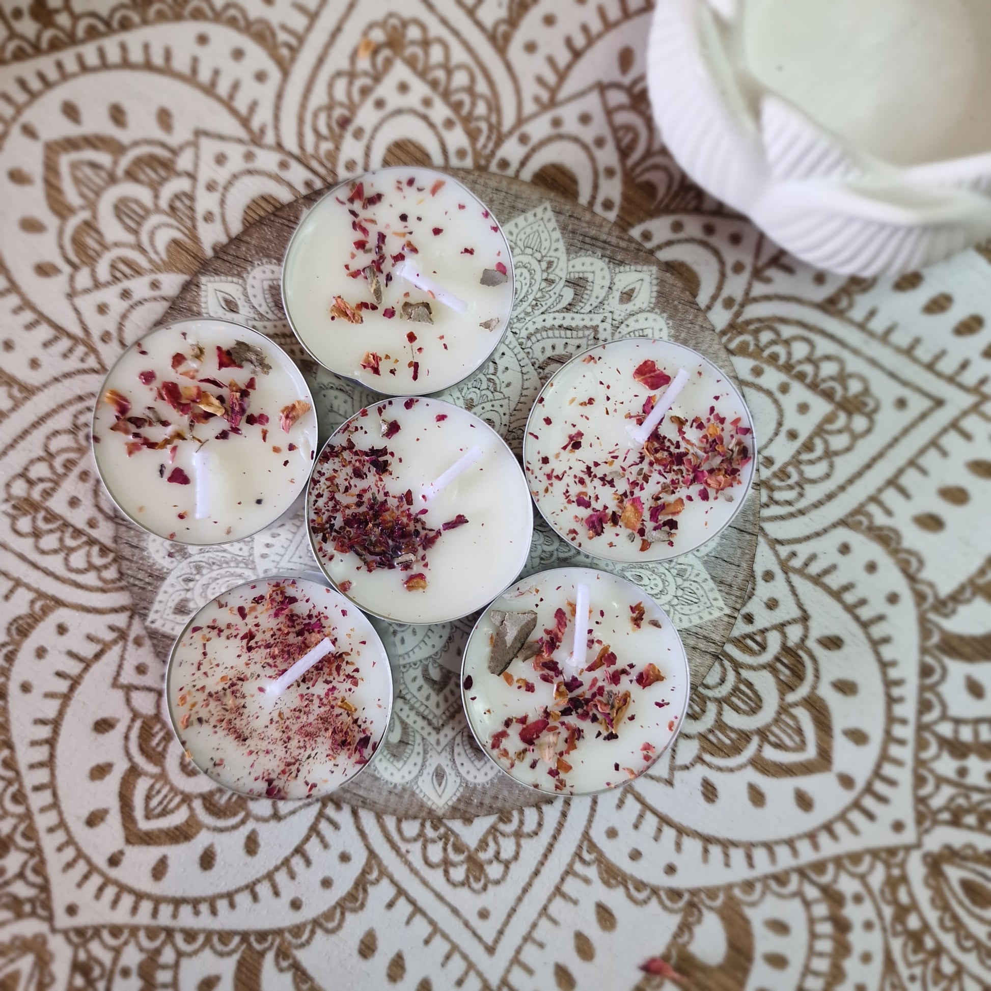 Pack de 6 Velitas de Té Artesanales – Rosa y Pétalos de Rosa para el Amor y la Armonía