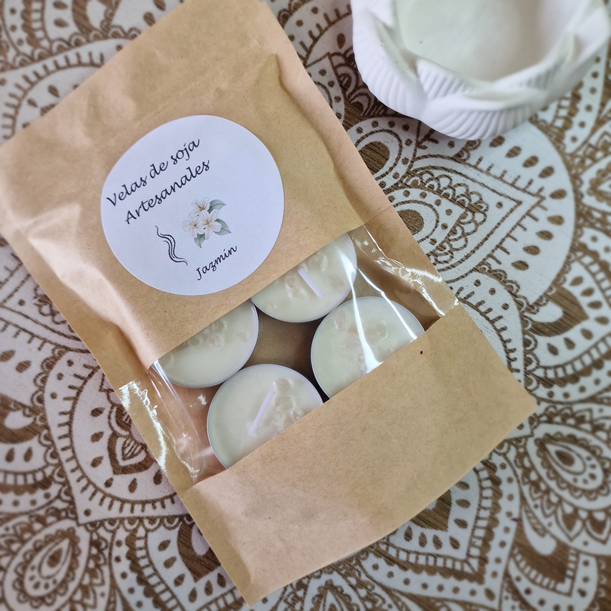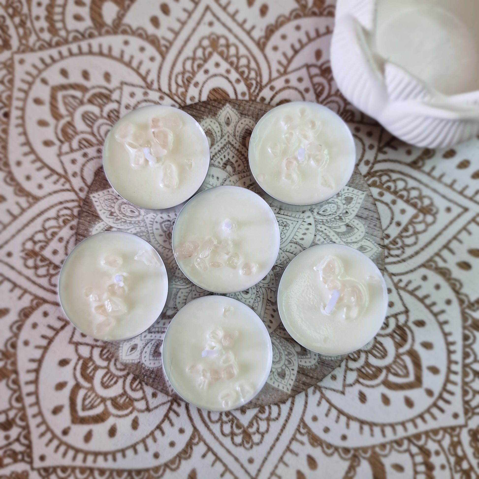 Pack de 6 Velitas de Té Artesanales – Jazmín y Cuarzo Rosa para el Amor y la Armonía Interior*