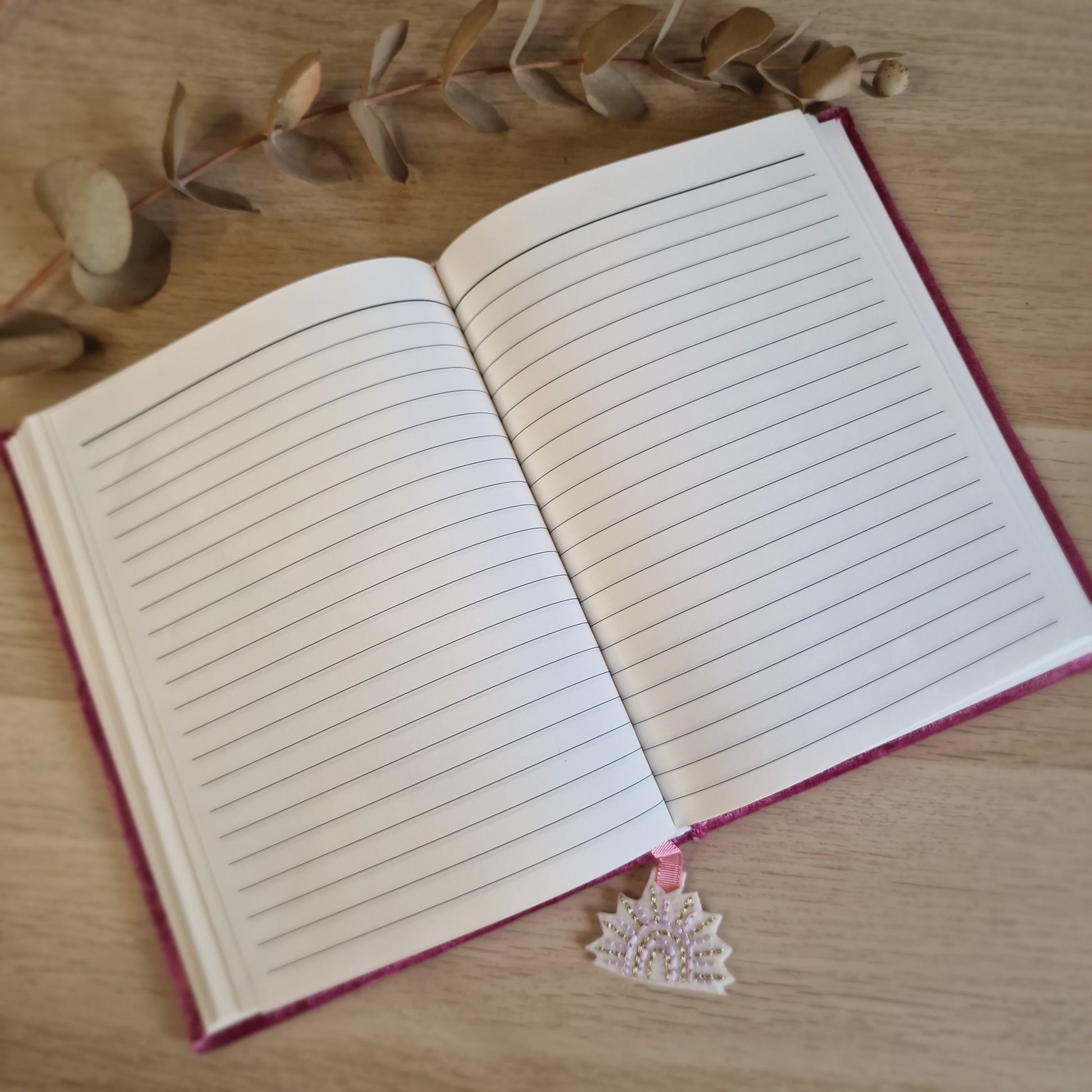 Este cuaderno de terciopelo en tono morado destaca por su delicado bordado de arcoíris, símbolo de esperanza, transformación y nuevos comienzos. Un diseño que invita a recordar que, incluso después de los momentos más intensos, siempre hay espacio para la luz y la armonía.