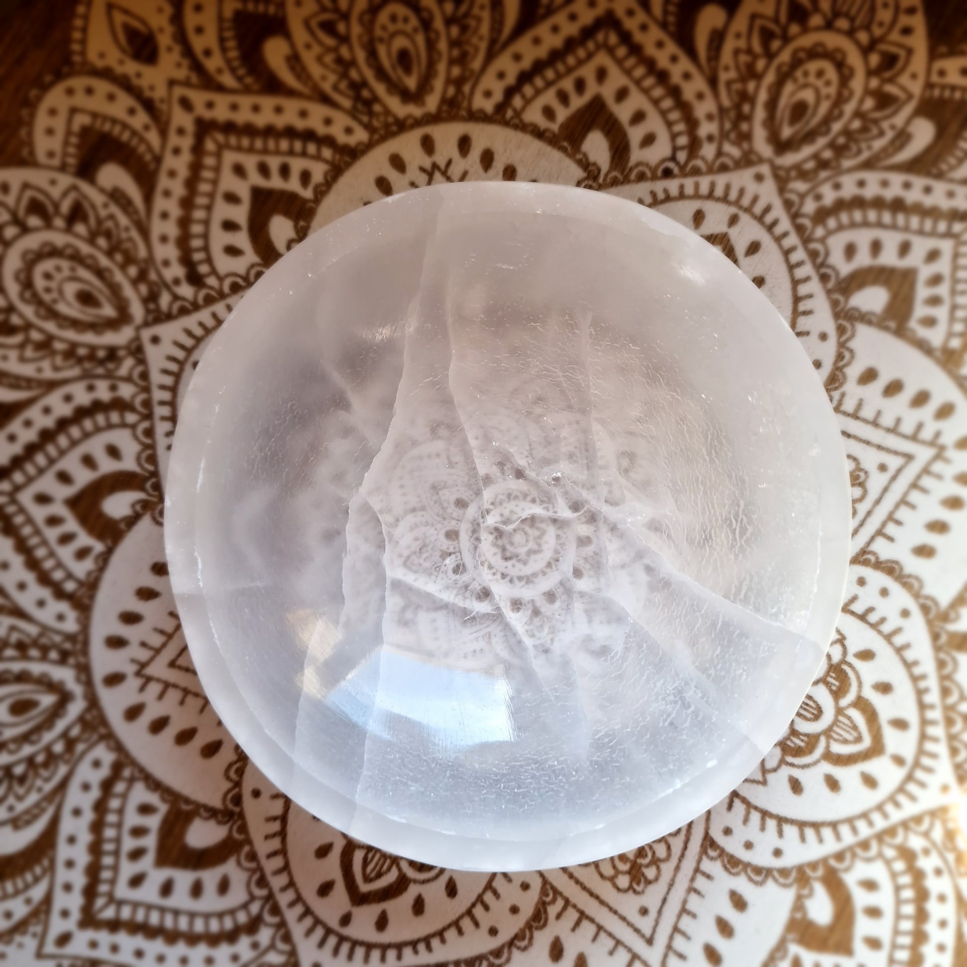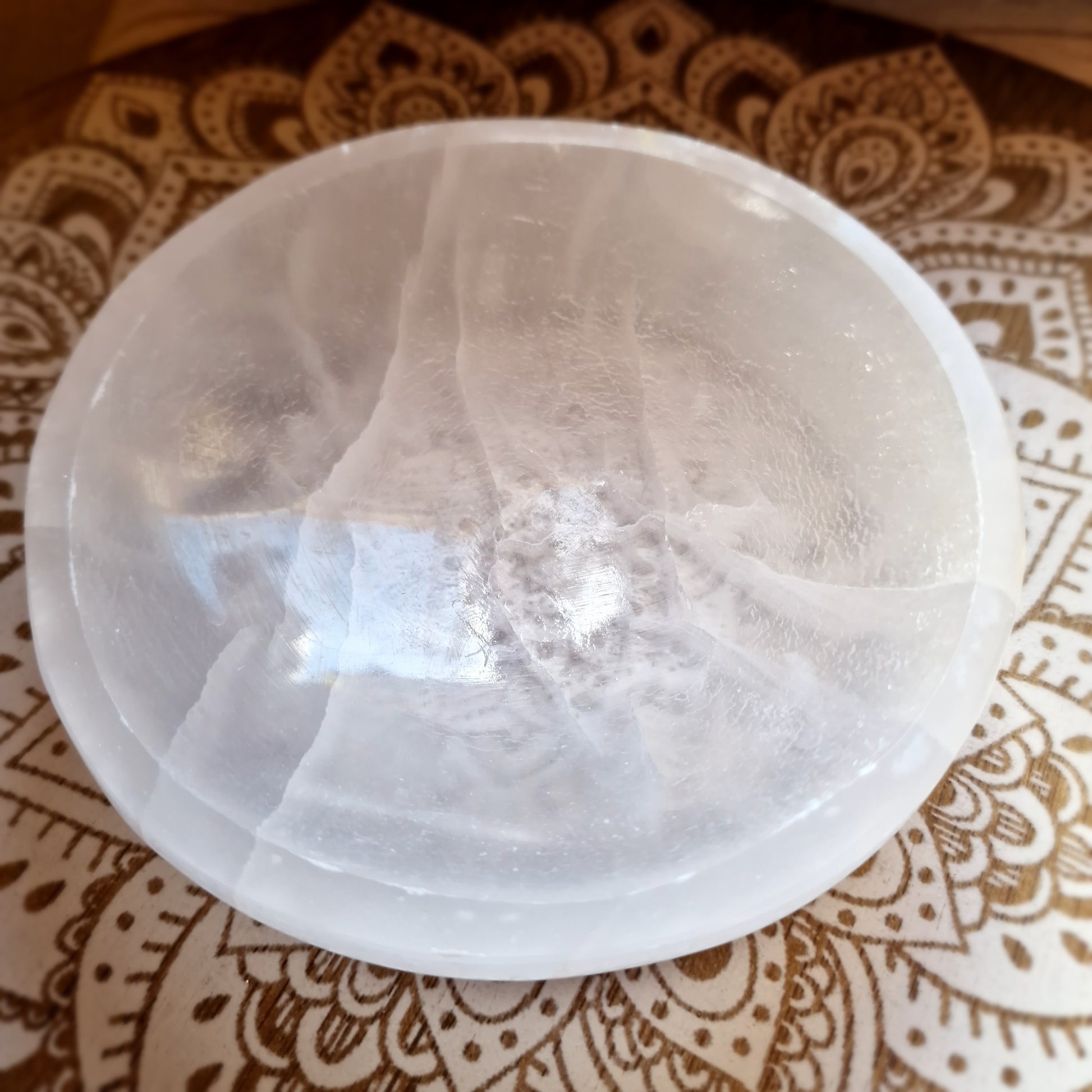 Al ser un mineral natural, cada cuenco presenta variaciones en vetas, textura y pequeñas grietas, lo que no representa fallos sino parte de su naturaleza. La selenita es frágil y sensible a la humedad, por lo que se recomienda manipularla con cuidado y mantenerla alejada del agua.