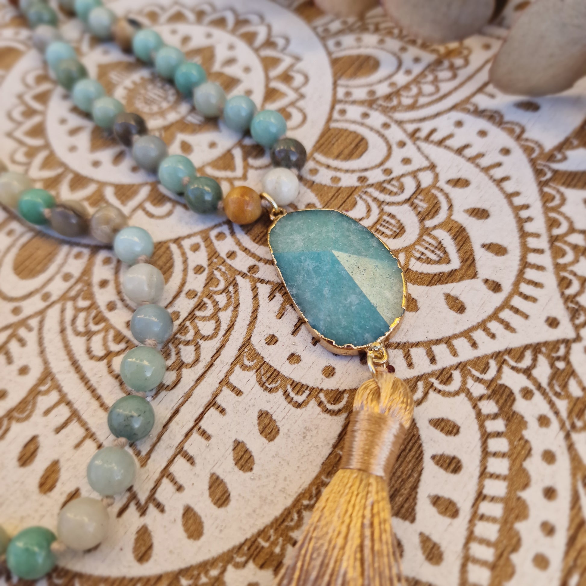 Este japa mala está compuesto por 108 bolas de amazonita de 8 mm, una medida clásica para la práctica de meditación y repetición de mantras. Incorpora una amazonita facetada colgante de aproximadamente 3,5 cm y una borla de hilo dorado que aporta un acabado elegante y armonioso.