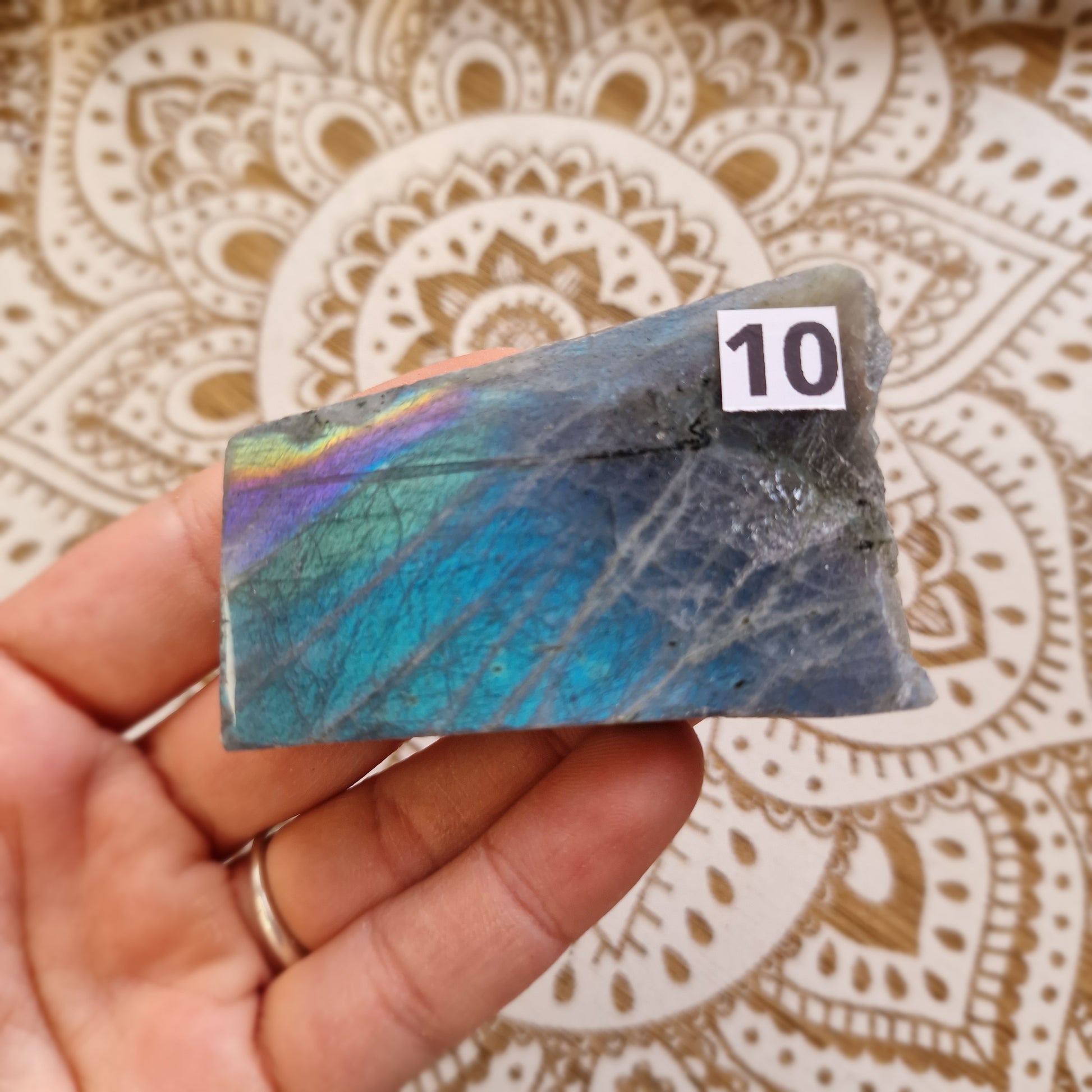 Conocida como la piedra de la transformación y la intuición, la labradorita te ayuda a proteger tu campo energético y a conectar con tu sabiduría interior. Ideal para llevar a tu altar, tu espacio de meditación o tener cerca en momentos de cambio.