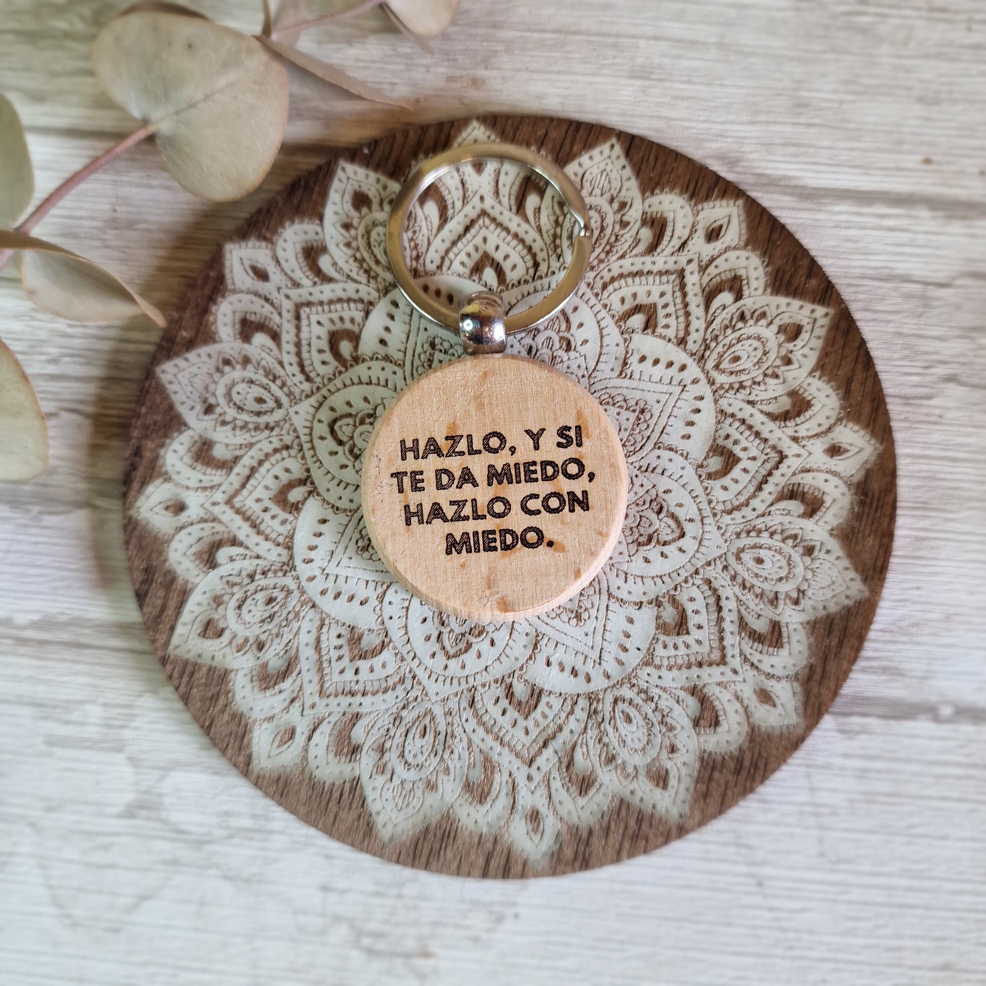 Llaveros de madera (4cm de diametro) grabados con frases motivadoras.