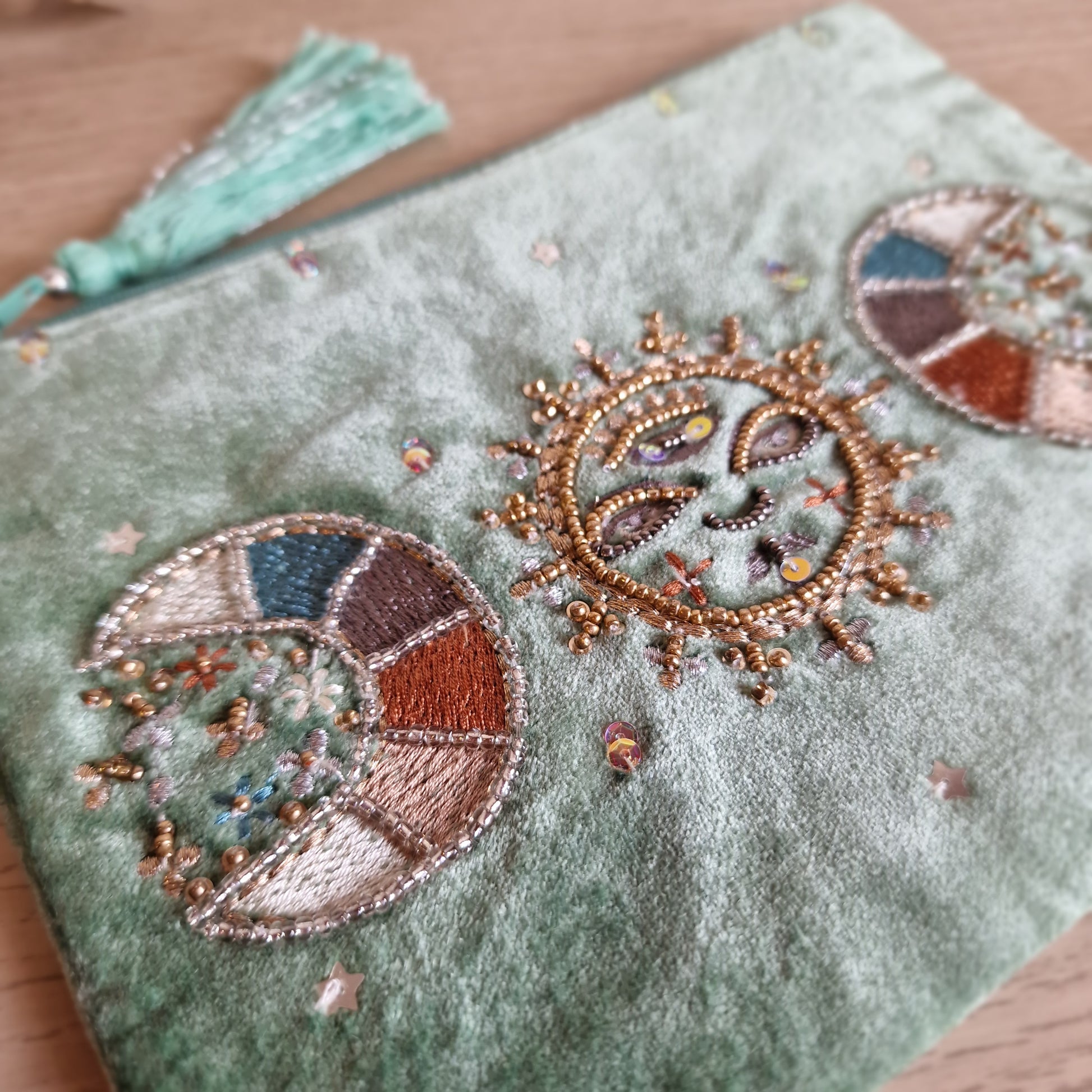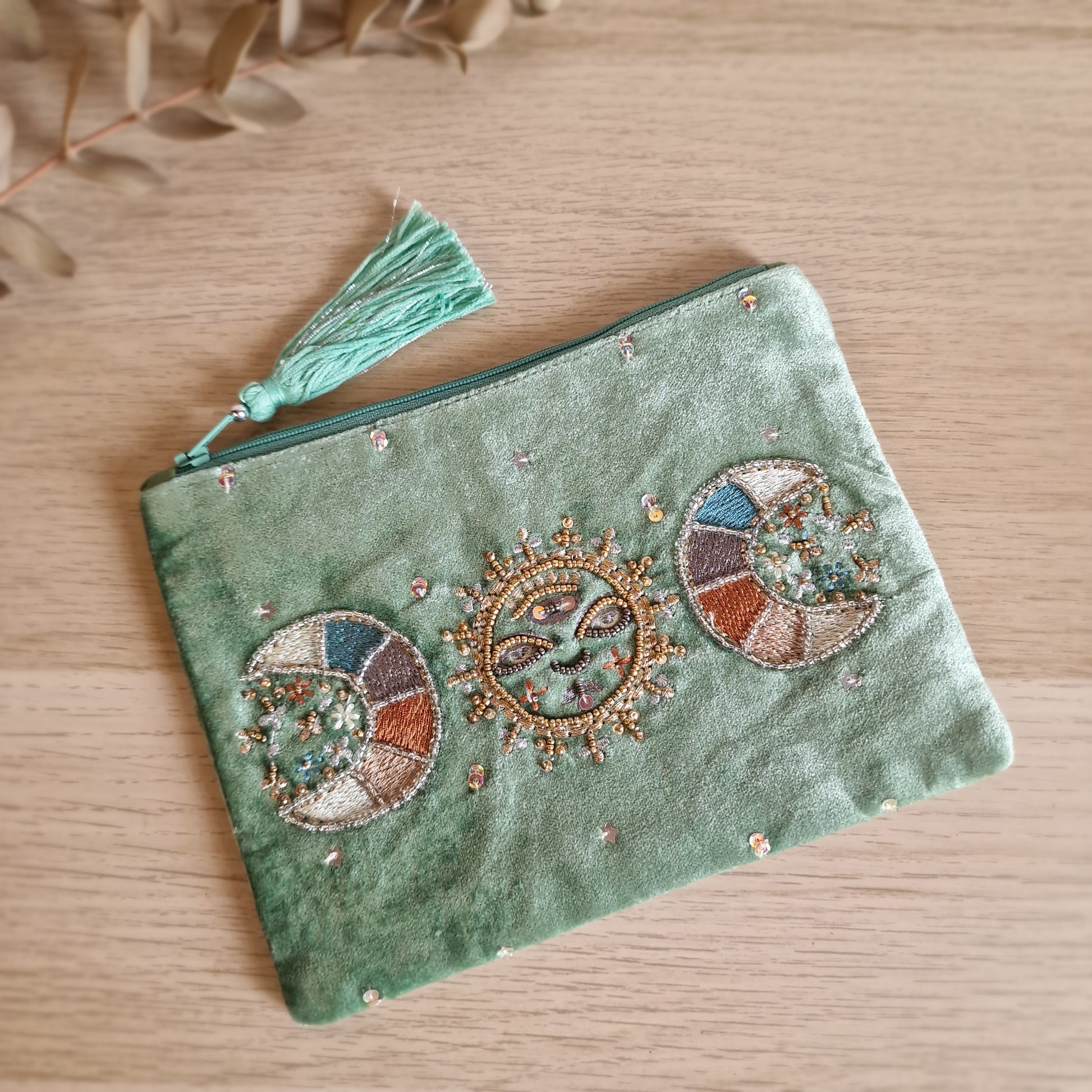 Este delicado neceser de terciopelo en tono menta está decorado con un bordado de fases lunares, acompañado de cuentas decorativas que simbolizan los ciclos, la transformación y el fluir natural de la vida. Un diseño que invita a respetar los ritmos internos y a conectar con los procesos de cambio y renovación.
