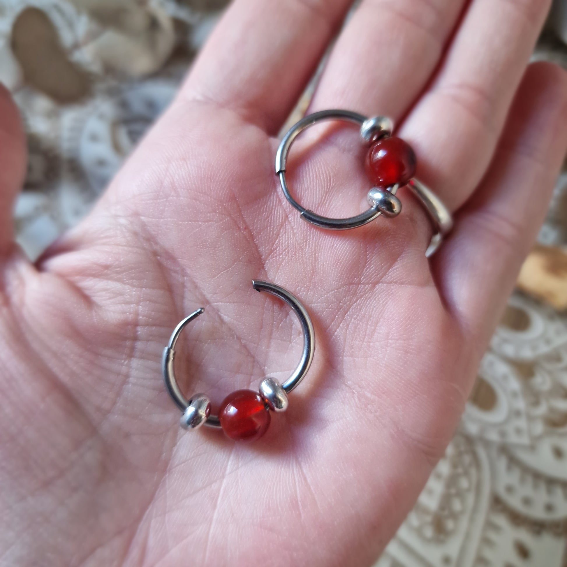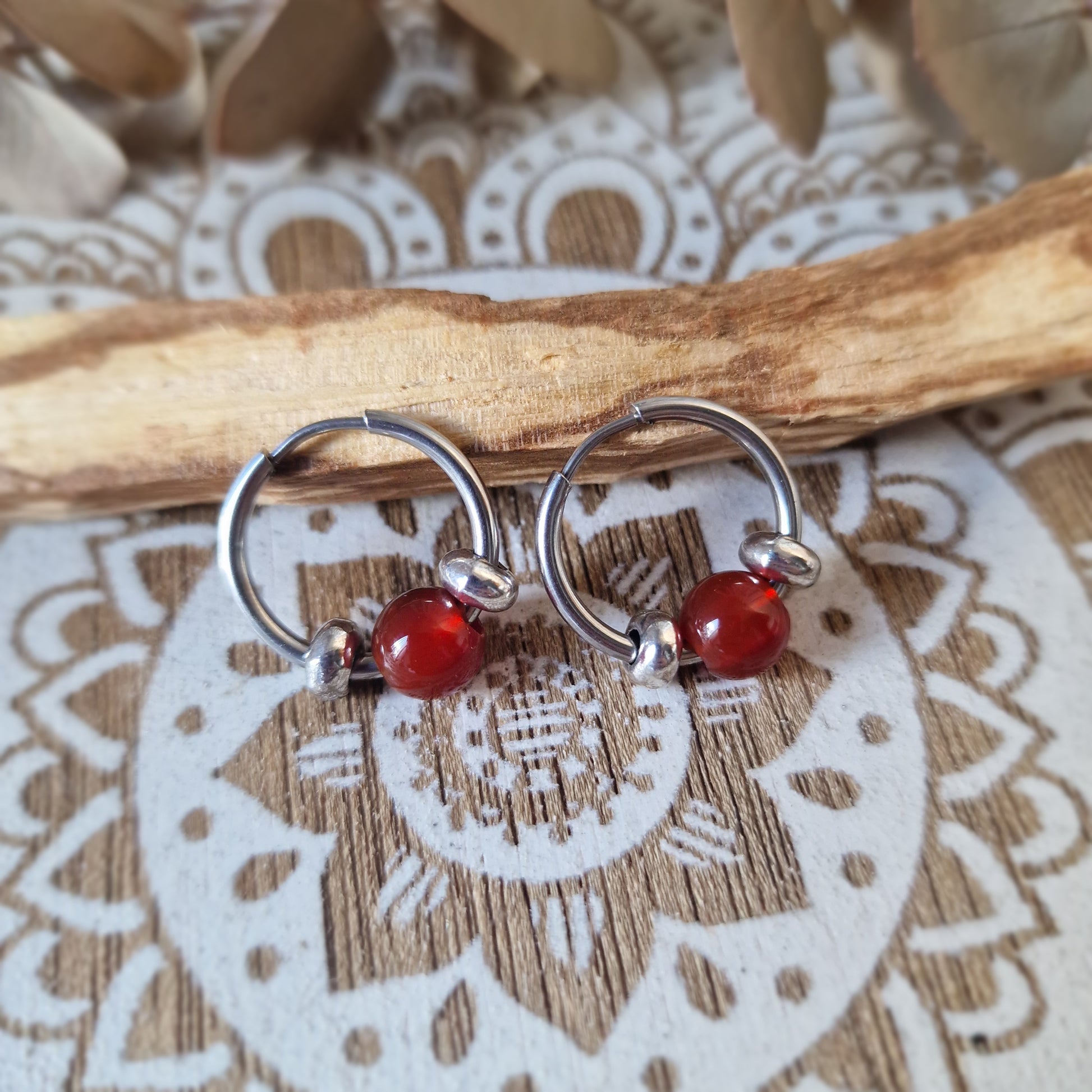 Pendientes de aro elaborados en acero hipoalergénico con una bola central de carneola natural de 8 mm, enmarcada por dos fornituras de acero a cada lado que aportan equilibrio visual y un acabado más definido a la pieza. Un diseño limpio, con carácter, pensado para llevar a diario.