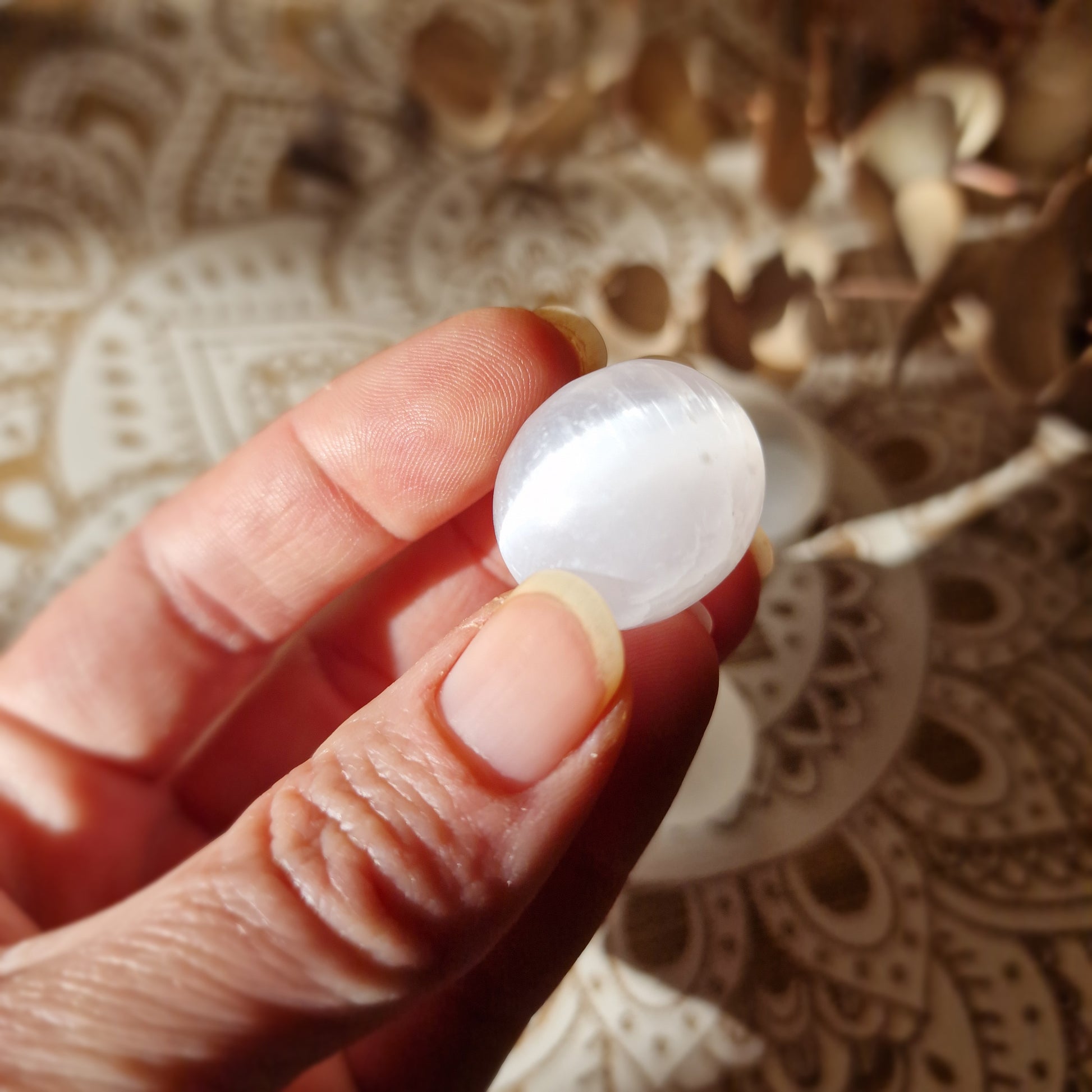 Estas pequeñas esferas de selenita tienen aproximadamente 2 cm de diámetro. Su forma redonda y pulida potencia la suavidad natural del mineral y la convierte en una pieza delicada y luminosa.