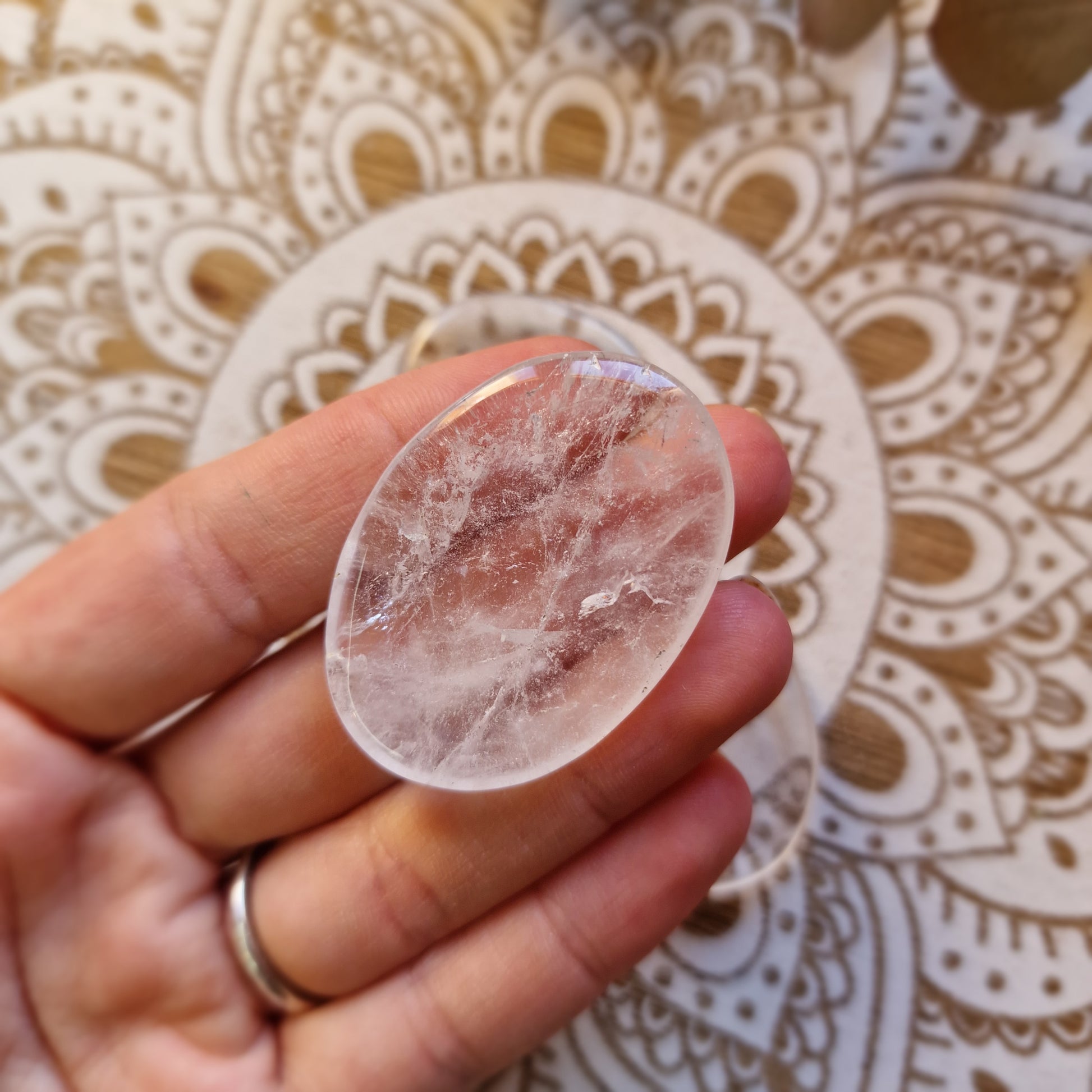 Esta piedra pulida de cuarzo cristal está diseñada con un surco central para colocar el dedo, lo que la convierte en una herramienta perfecta para aliviar el estrés y mantener la mente centrada. Con una medida aproximada de 4 x 3 cm, se adapta cómodamente a la mano, ideal para llevar contigo o tener cerca durante tus momentos de calma o meditación.