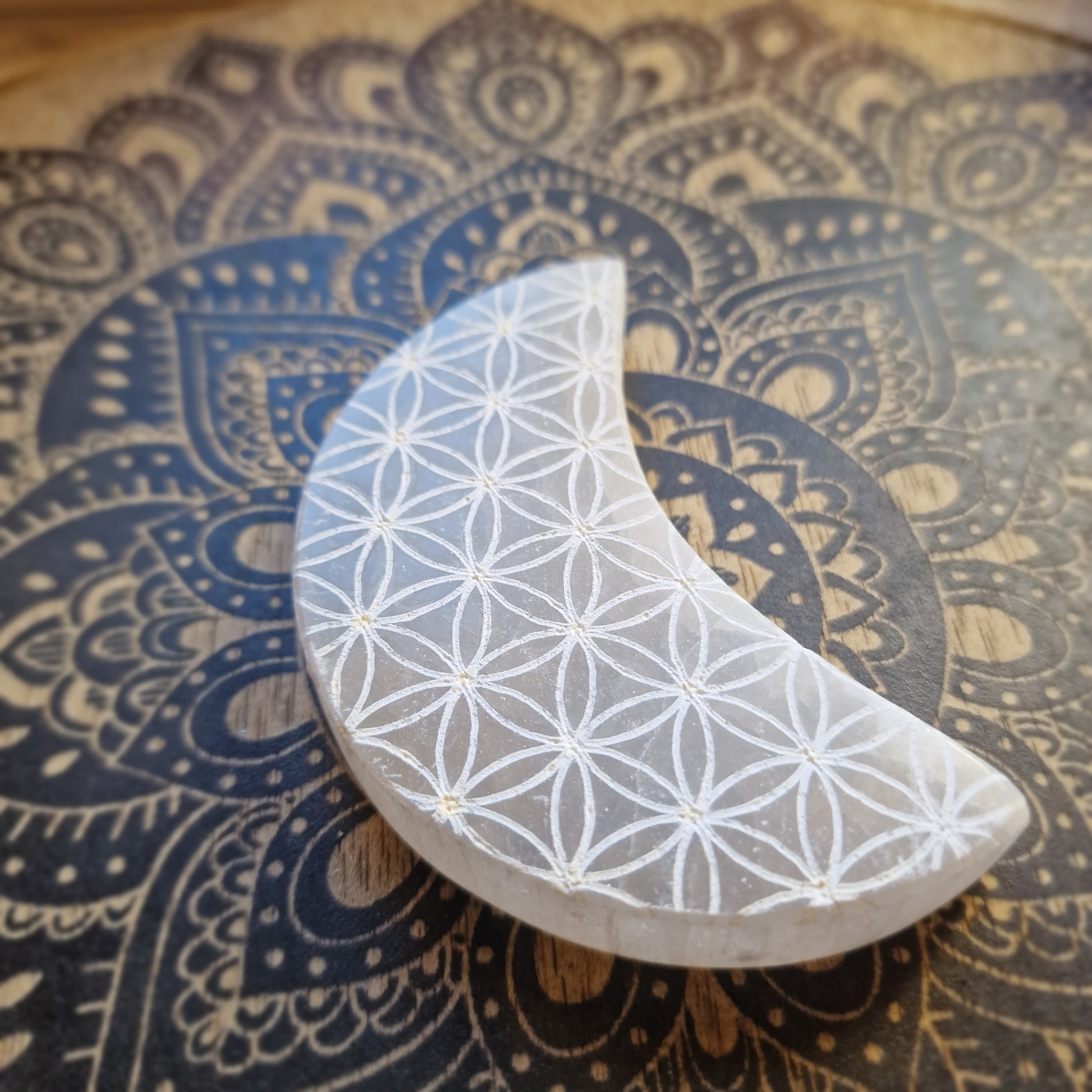 Placa de Selenita Media Luna con Flor de la Vida ~ Luz y purificación energética
