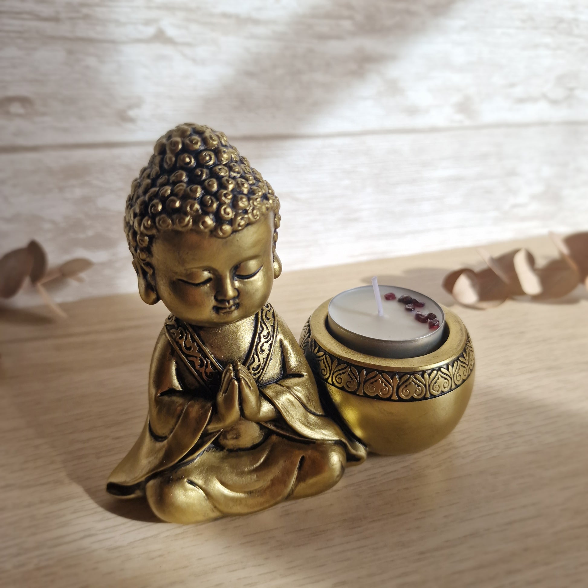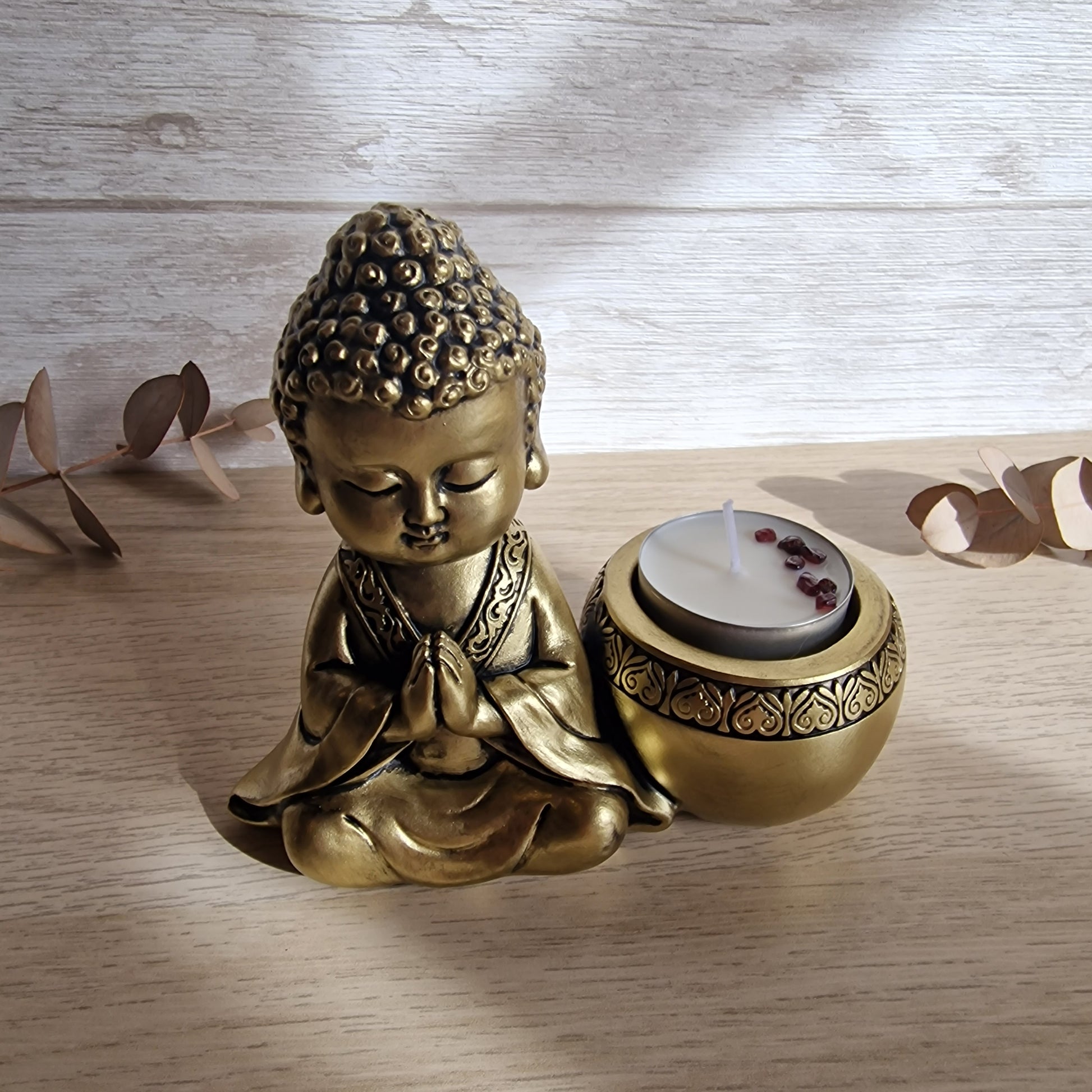 Este elegante portavelas combina la figura de un pequeño Buda orante con un soporte para vela a su lado, creando una atmósfera de calma y recogimiento. Su acabado dorado irradia calidez y armonía, mientras la luz de la vela ilumina suavemente el rostro sereno del Buda, evocando paz interior y contemplación.