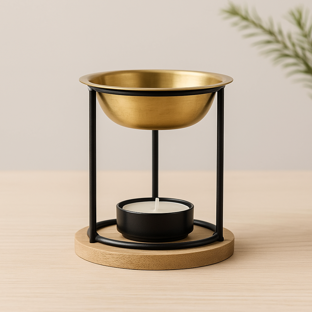 Este elegante quemador combina estructura metálica negra, cazoleta dorada y base de madera, creando una pieza moderna y cálida perfecta para aromatizar cualquier espacio. Su diseño permite utilizarlo tanto con aceites esenciales como con ceras aromáticas, ofreciendo versatilidad y una difusión suave y envolvente del aroma.