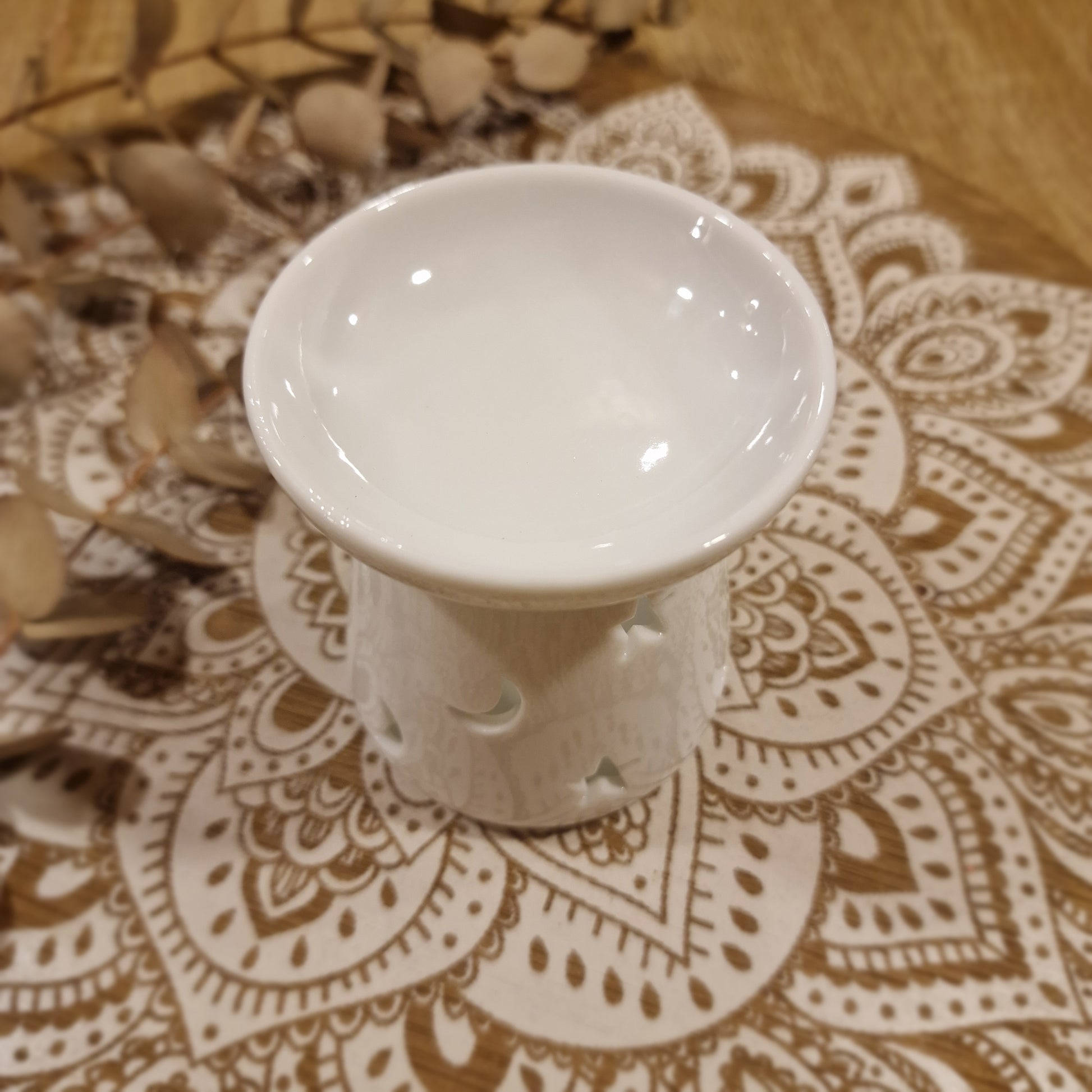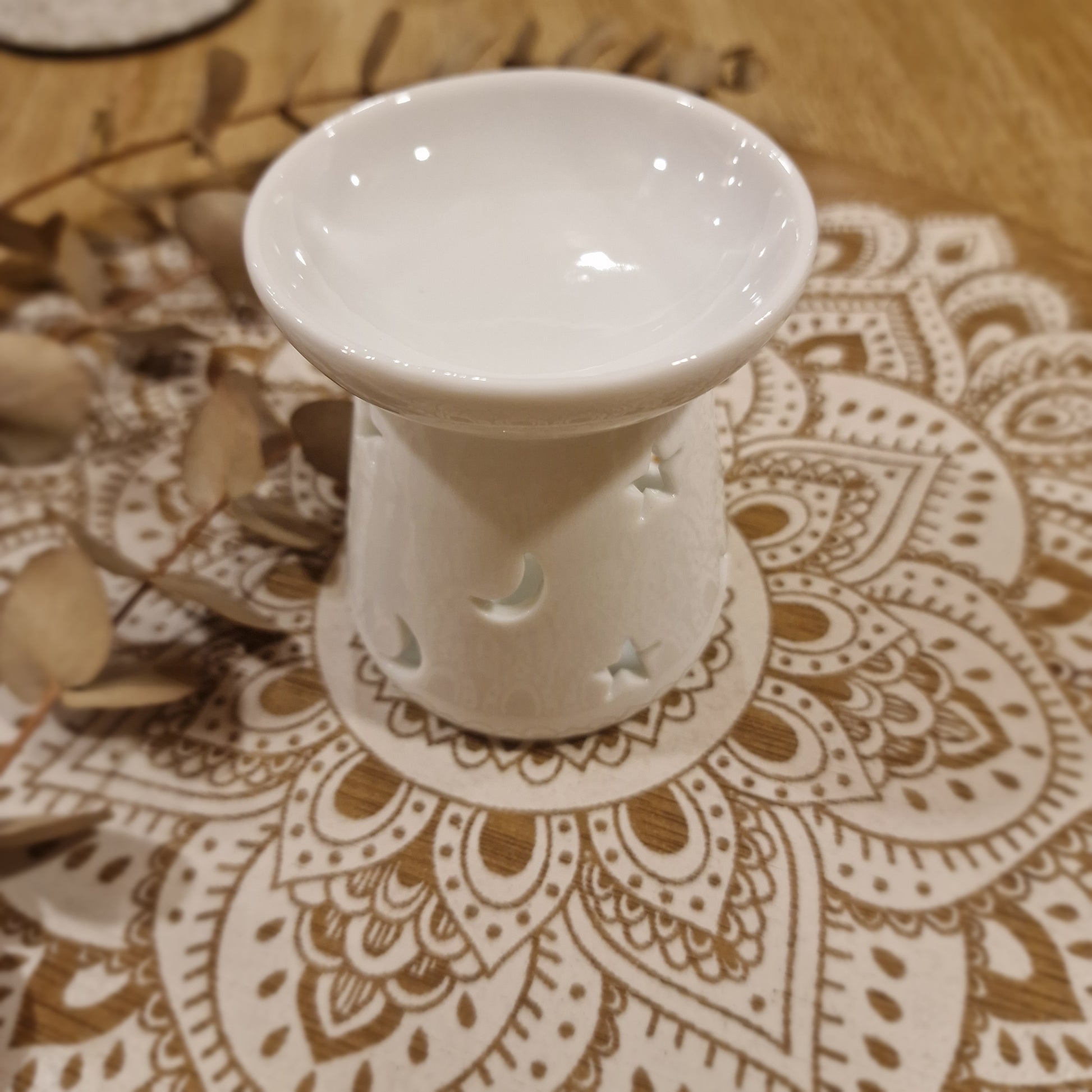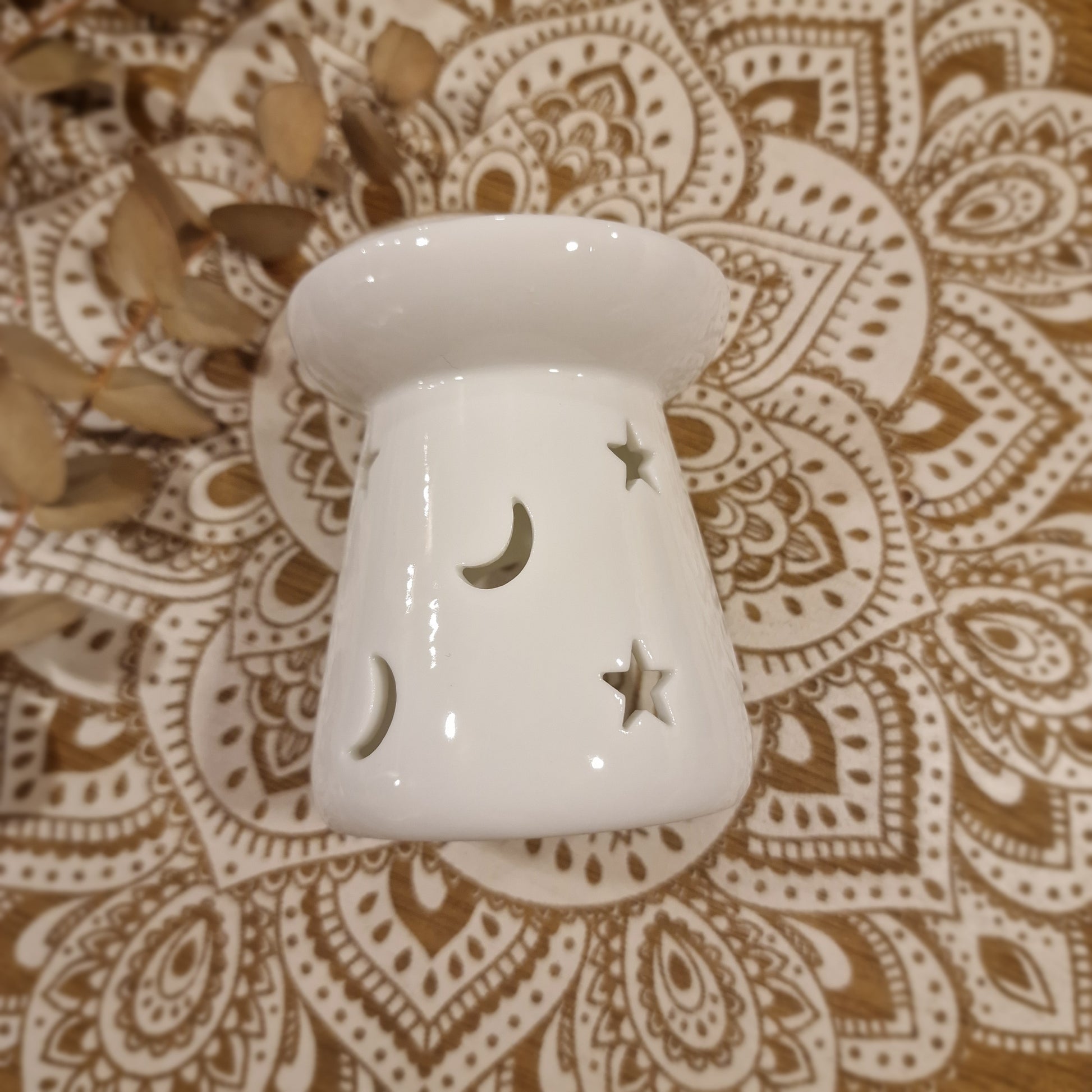 El quemador de aceite esencial "Cielo Nocturno" es una hermosa pieza de cerámica blanca, decorada con delicadas tallas de lunas y estrellas, ideal para llenar tu espacio de calma y magia. Diseñado para usar con tus aceites esenciales favoritos, este quemador te ayuda a crear un ambiente relajante inspirado en la serenidad del cielo nocturno.