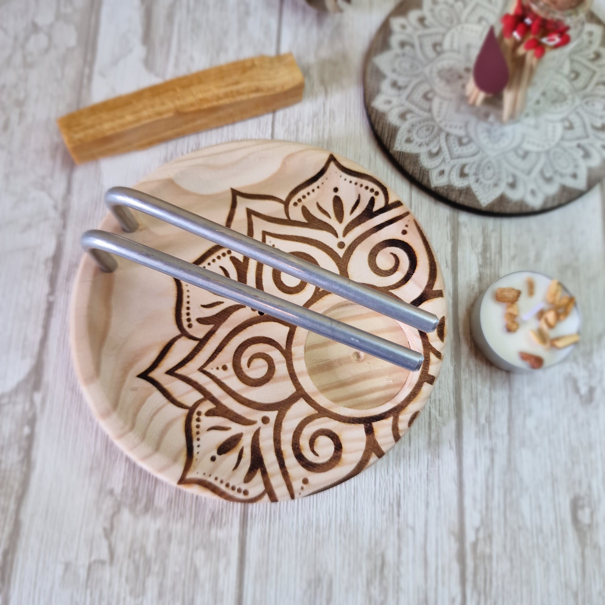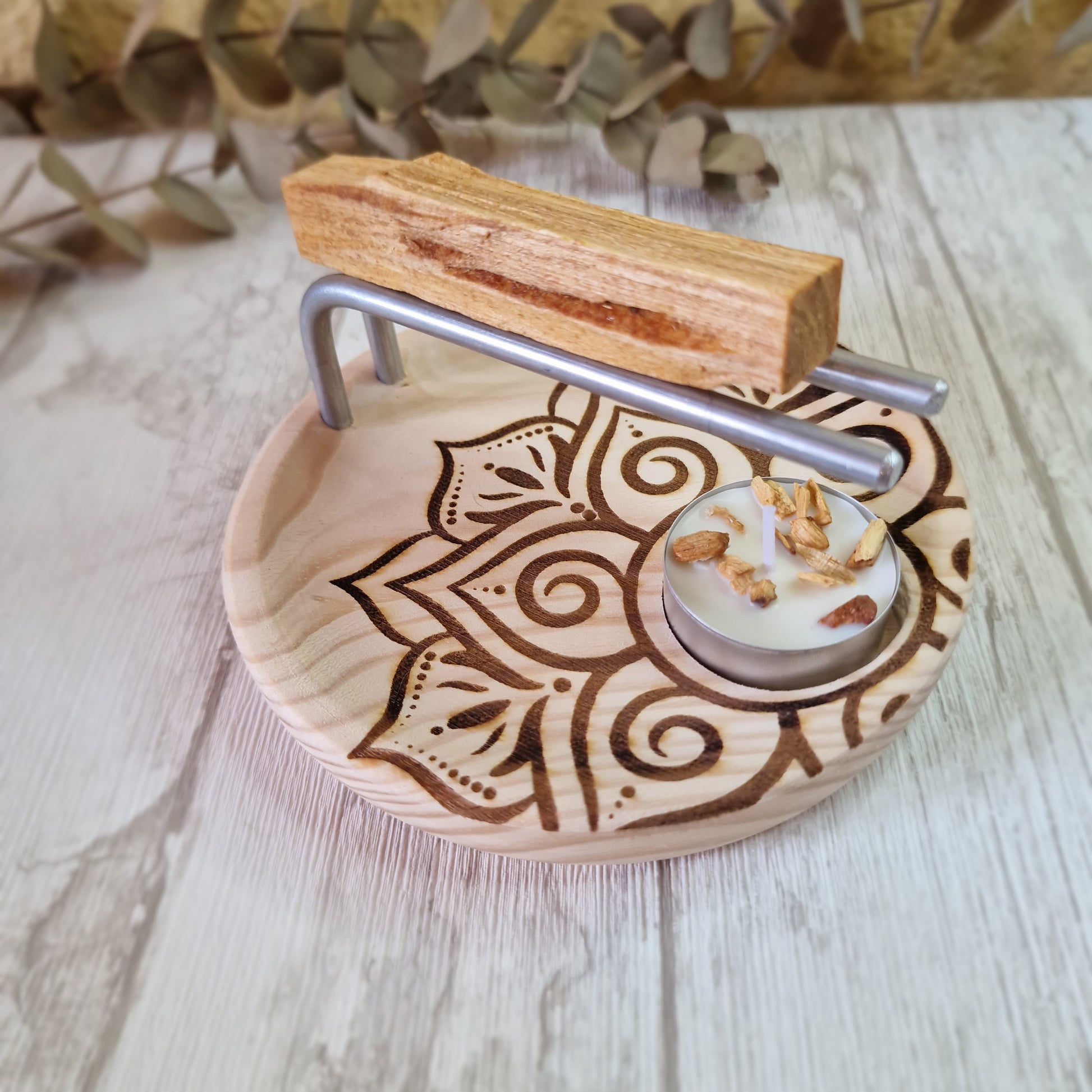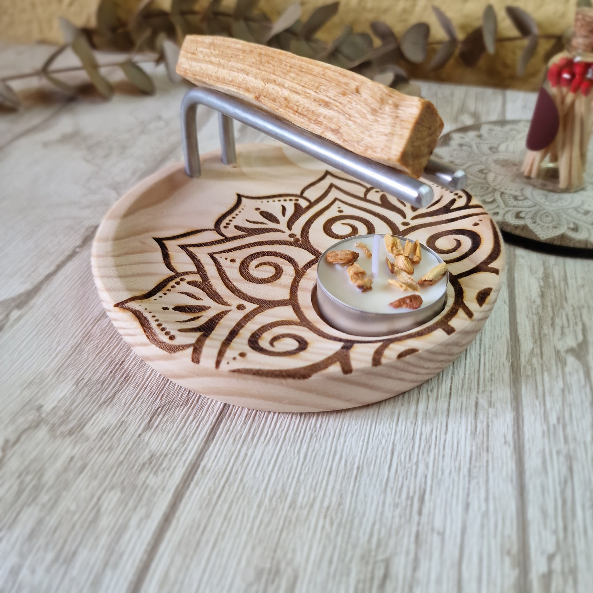 Enciende el Palo Santo como de costumbre, regula la posición de las varillas para conseguir que el Palo se mantenga encendido por un largo tiempo sin coger llama, dependiendo de la altura de la llama de la vela lo pondrás más cerca o más alejado. Cuando deje de salir humo, solo hay que voltar el palo para que continúe su aroma.