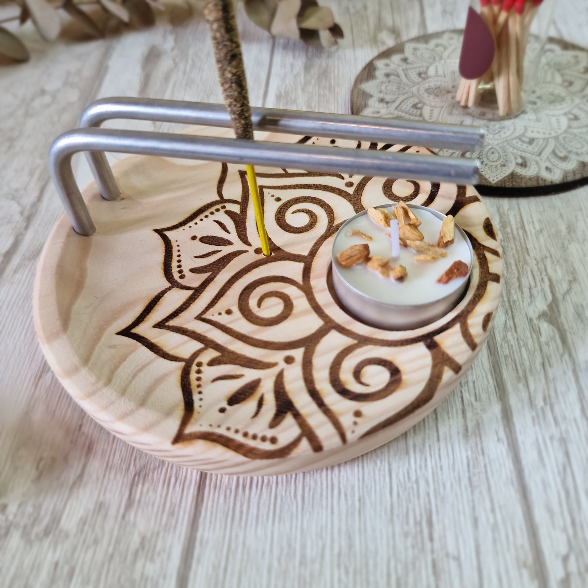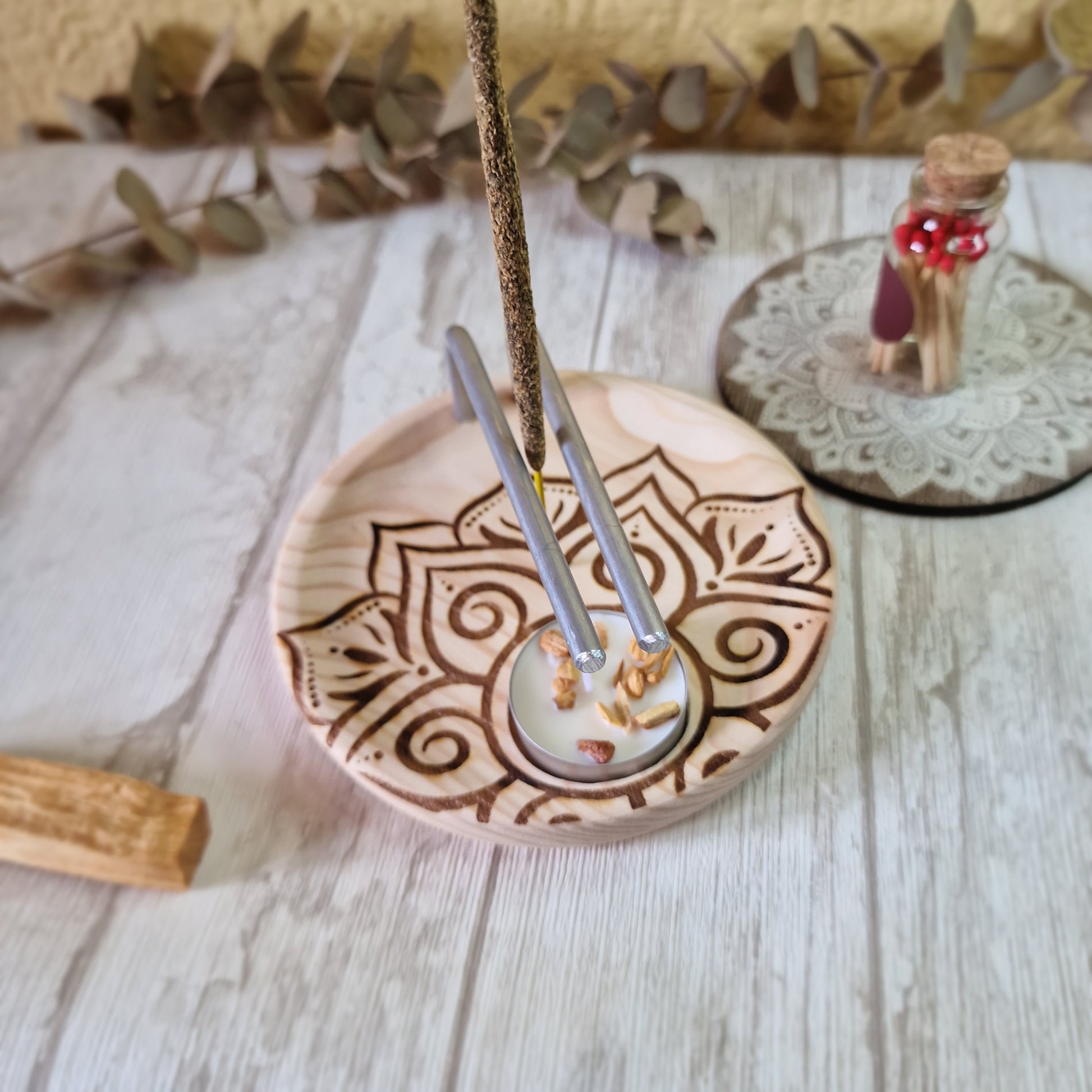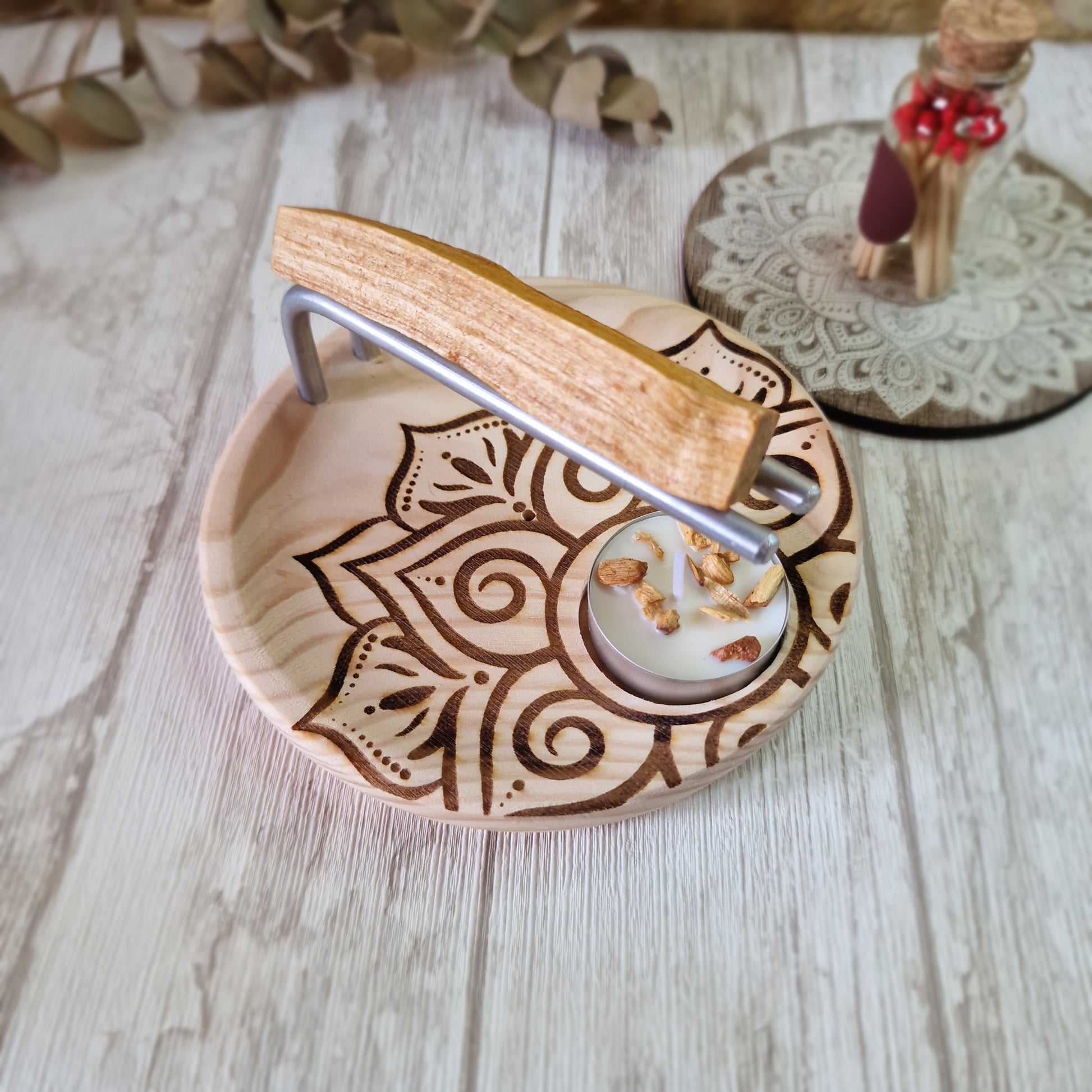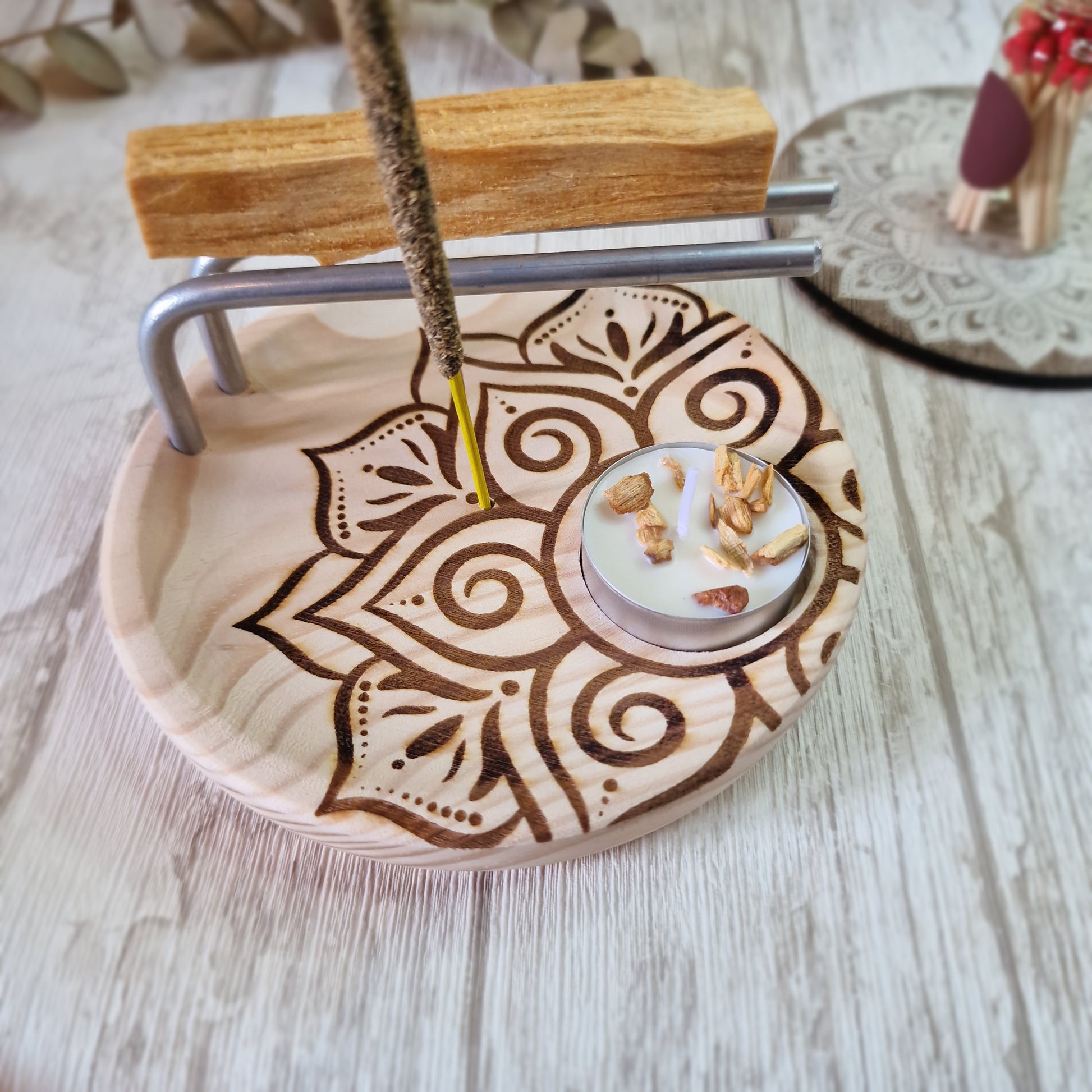 Enciende el Palo Santo como de costumbre, regula la posición de las varillas para conseguir que el Palo se mantenga encendido por un largo tiempo sin coger llama, dependiendo de la altura de la llama de la vela lo pondrás más cerca o más alejado. Cuando deje de salir humo, solo hay que voltar el palo para que continúe su aroma.