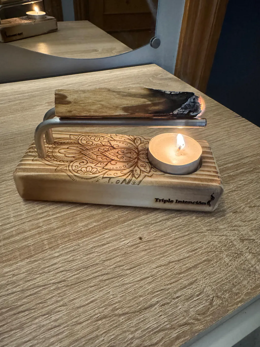 Enciende el Palo Santo como de costumbre, regula la posición de las varillas para conseguir que el Palo se mantenga encendido por un largo tiempo sin coger llama. Cuando deje de salir humo, solo hay que voltear el palo.