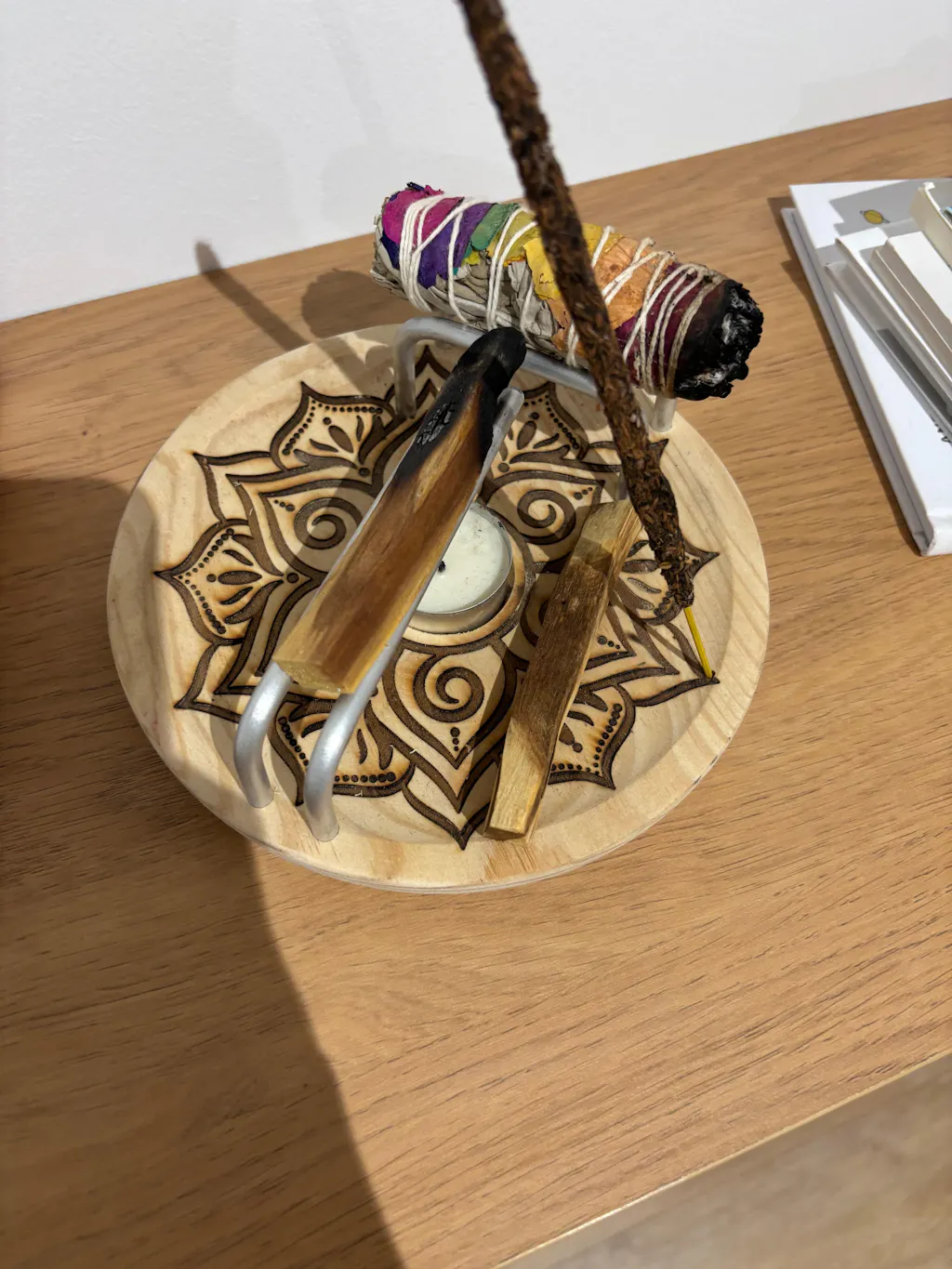 Enciende la salvia Blanca por un extremo y al finalizar déjala en el soporte hasta que se apague por completo.