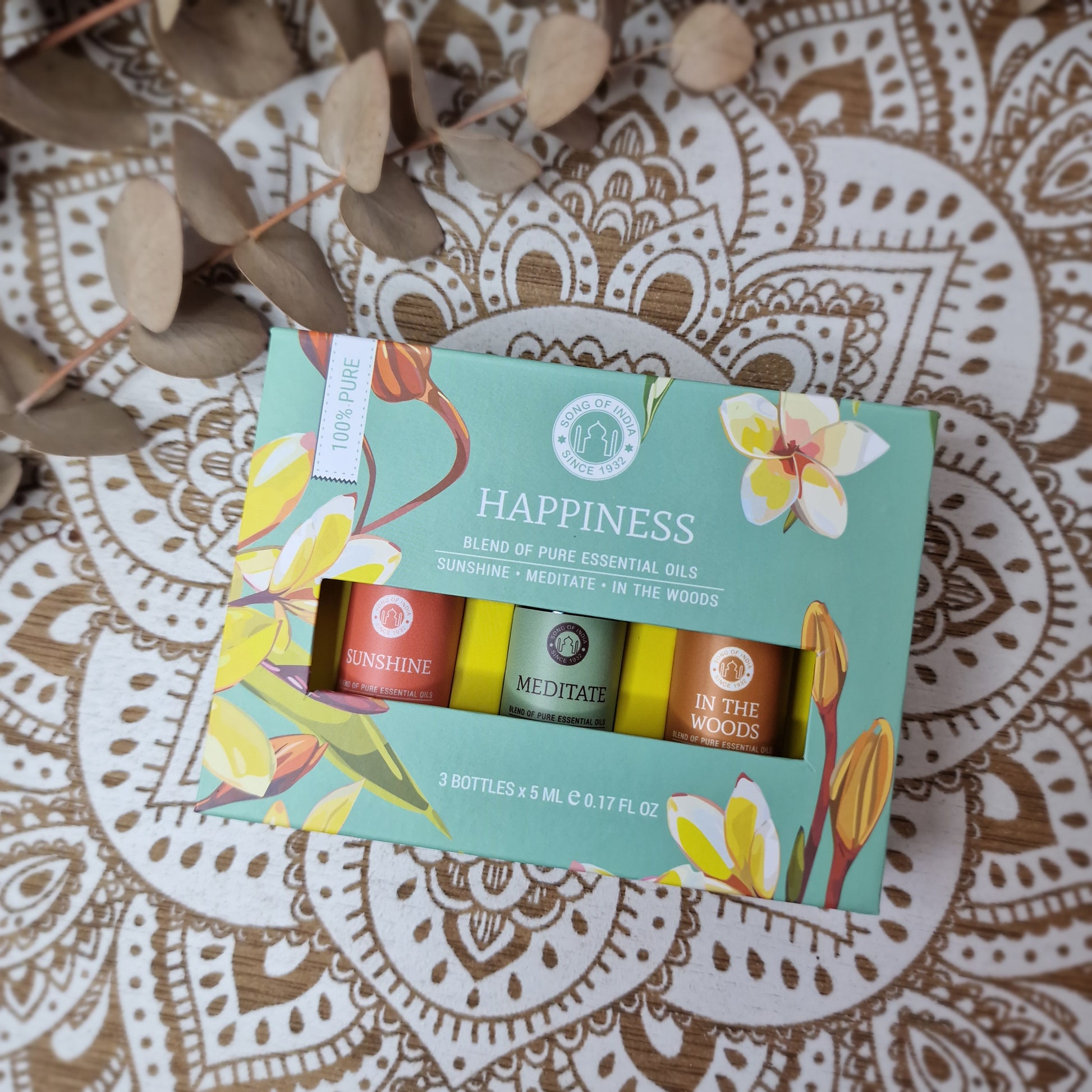 El set Happiness de Song of India reúne tres mezclas de aceites esenciales con aromas frescos, cálidos y amaderados que ayudan a crear un ambiente relajante y equilibrado.