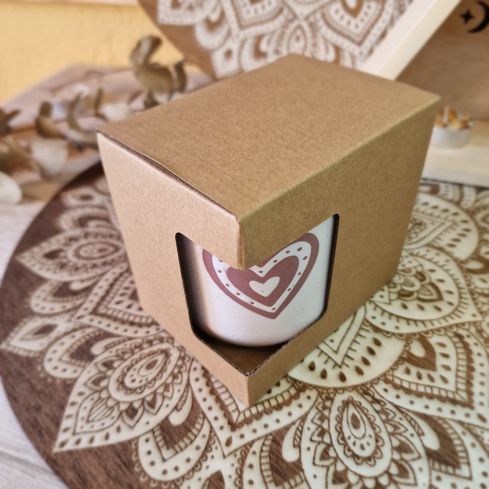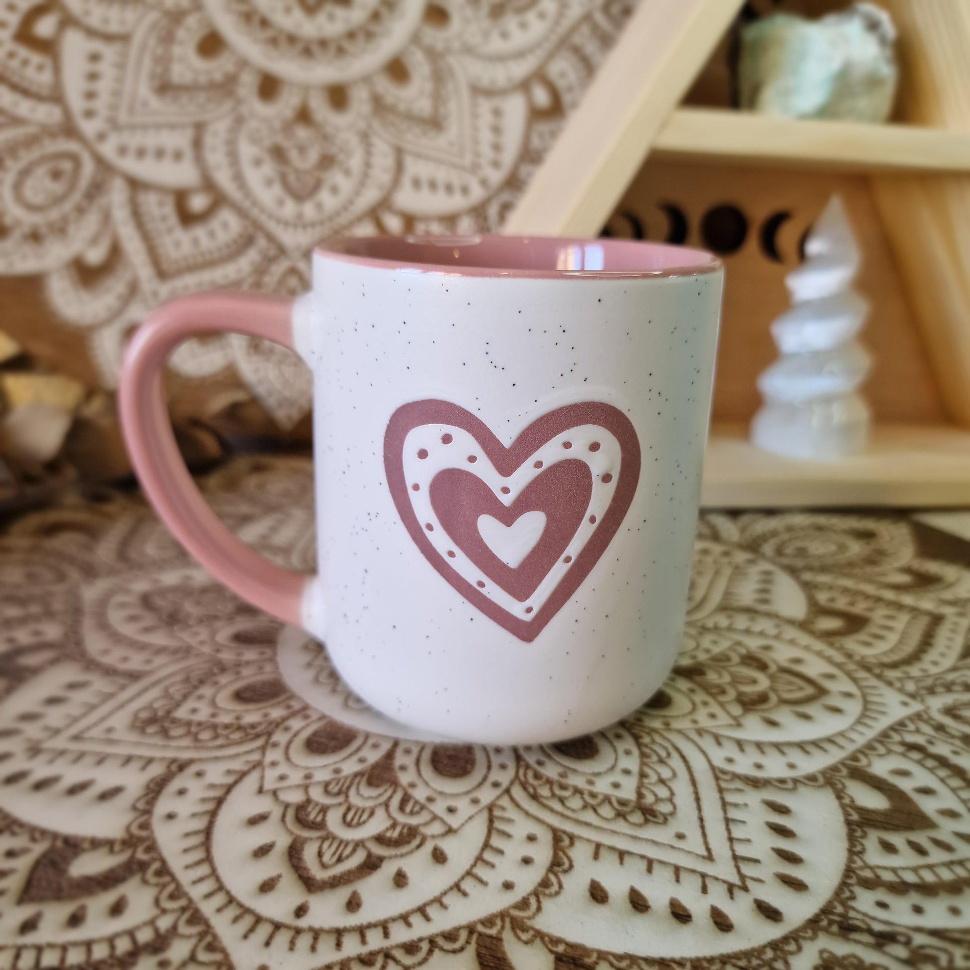 Esta taza de porcelana rústica combina la sencillez del exterior blanco moteado con la dulzura de un corazón rosa en cada lado, símbolo de amor, ternura y conexión emocional. Su asa amplia, también en tono rosa, aporta un detalle delicado y cómodo a la vez.