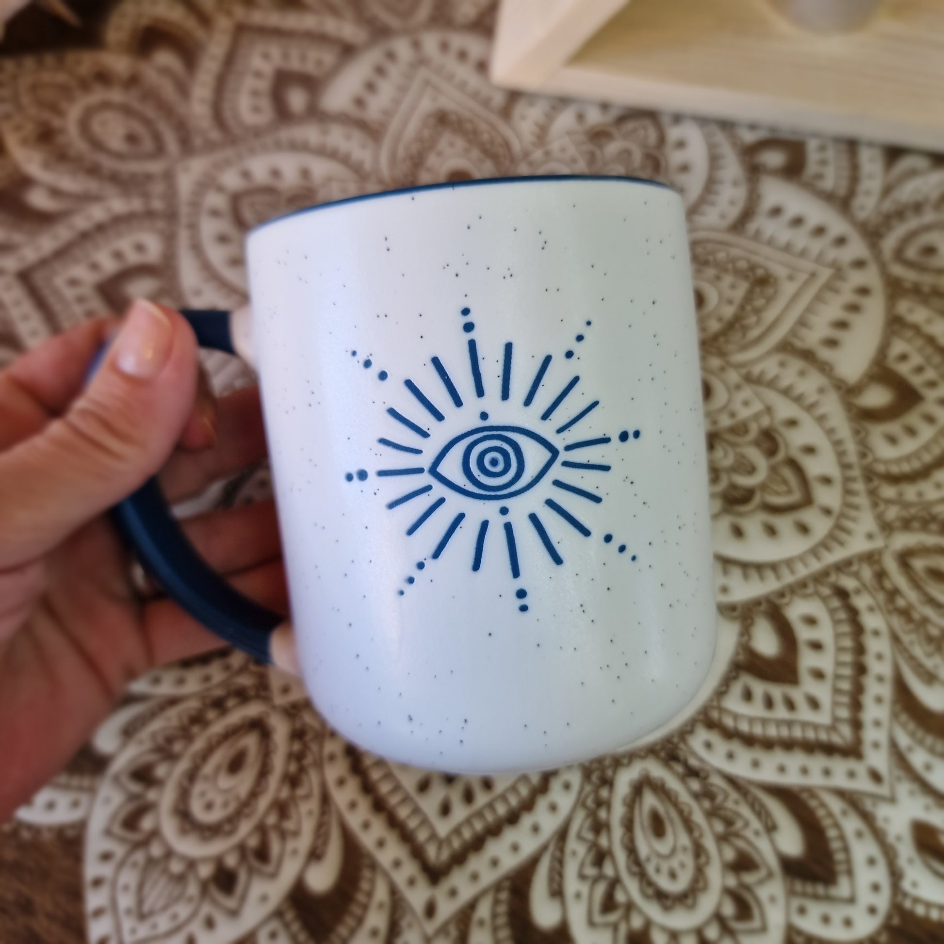 Esta taza de porcelana rústica combina la pureza del exterior blanco moteado con la fuerza simbólica de un ojo azul en cada lado, amuleto universal de protección y buena energía. Su asa amplia, también en azul, aporta un detalle elegante y cómodo a la vez.