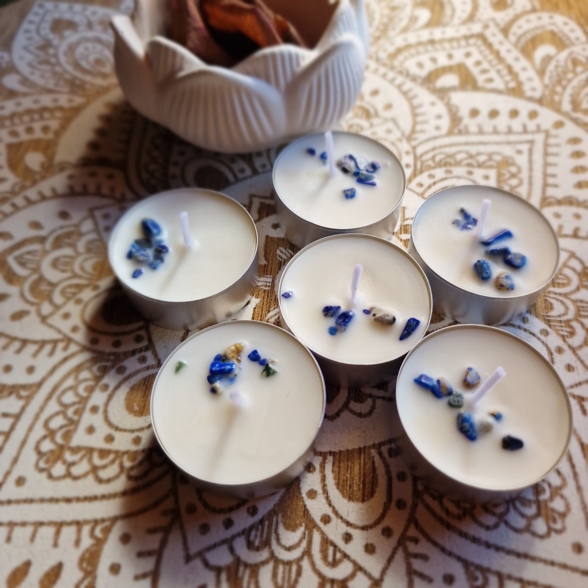 Pack de 6 Velitas de Té Artesanales – Flor de Loto y Lapislázuli para la Sabiduría y la Armonía Interior